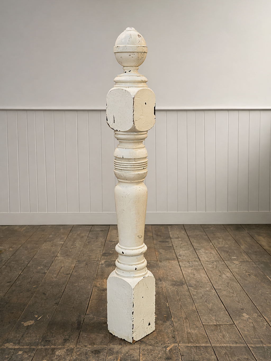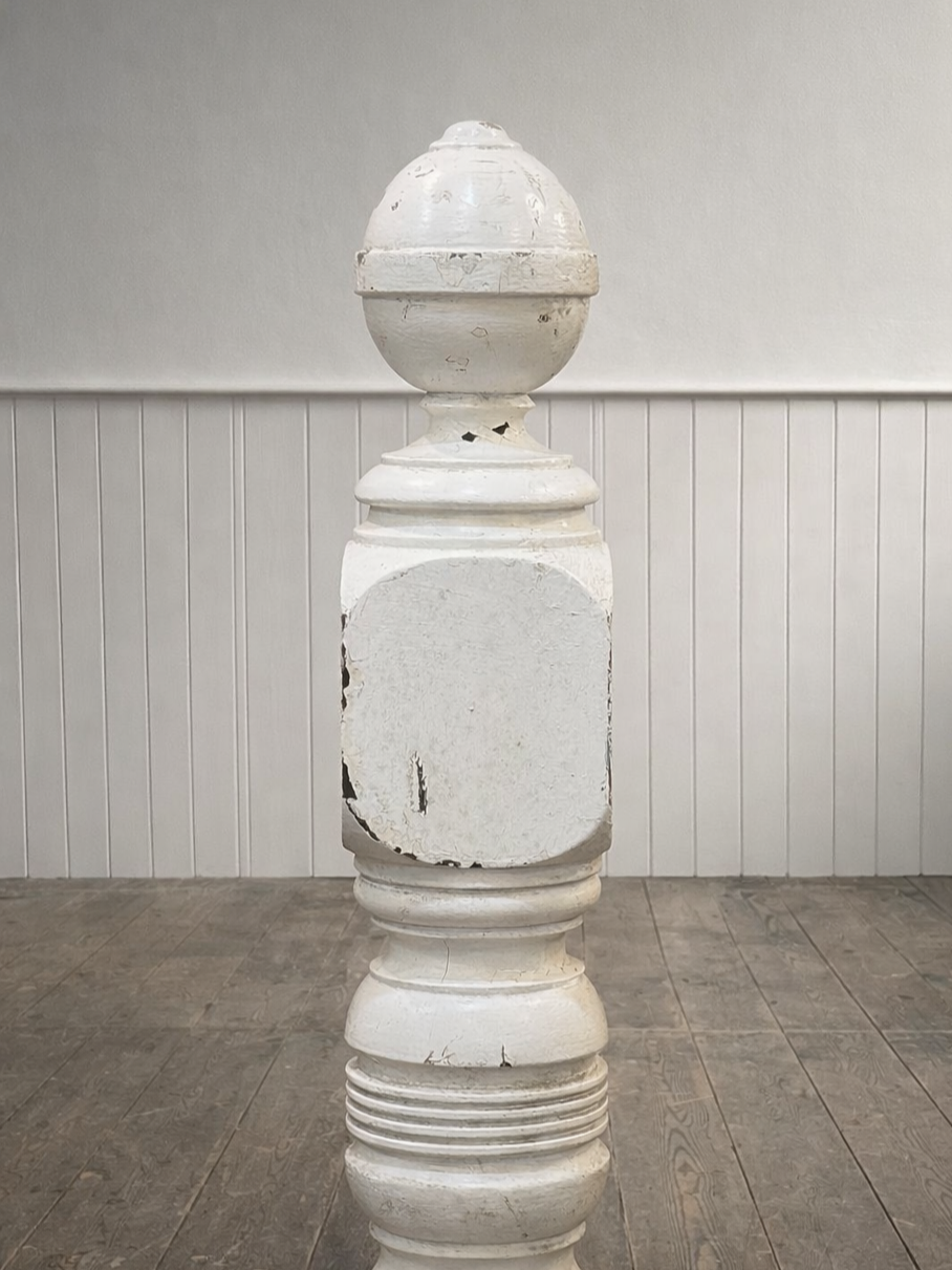 This is a vintage salvaged staircase newel post made of pine wood and painted with a white finish, which has chips and patina due to age. The design includes decorative turned elements and a rounded finial top.
