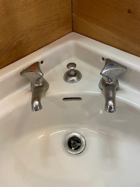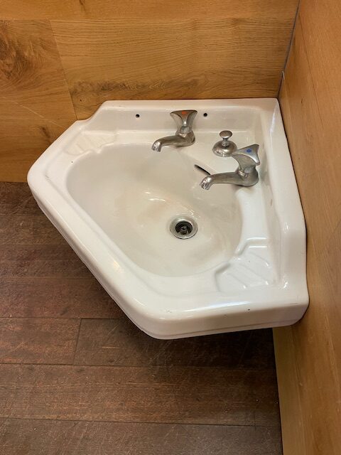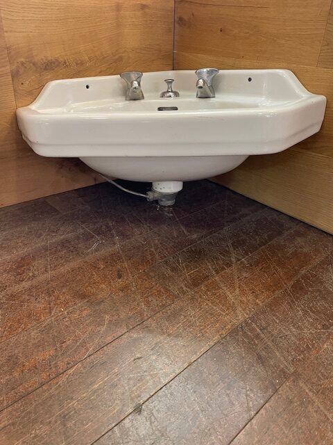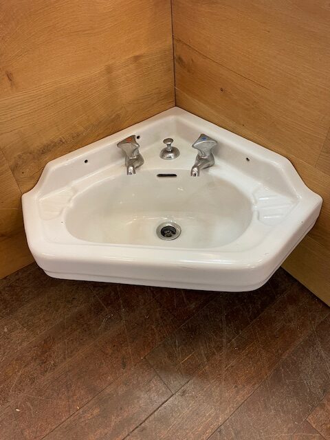 This Edwardian Corner sink features chrome taps and push-plug, with moulded soap inserts.