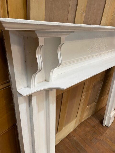 This victorian fire surround is made of pine, and features a carved decorative floral design with a ledge where you could place decorative pieces beneath the main top shelf. Painted in a white finish.