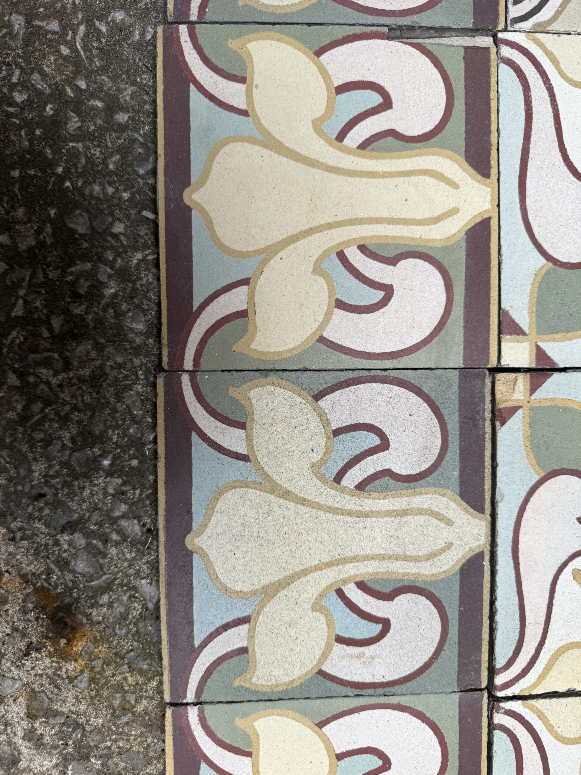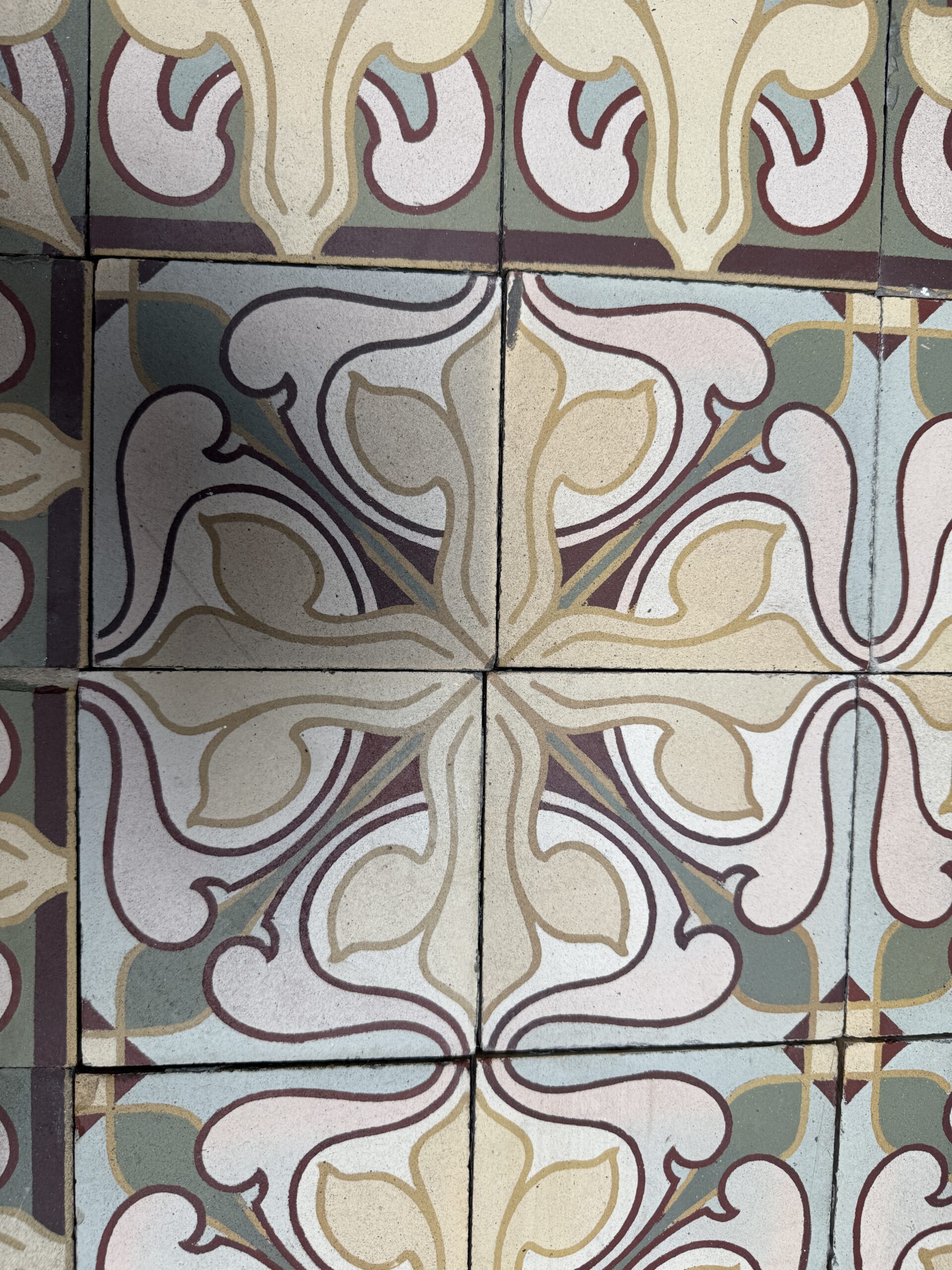 These beautiful art nouveau flooring tiles feature a recognisable art nouveau pattern in soft maroon and green colours which is typical of the design at the time.