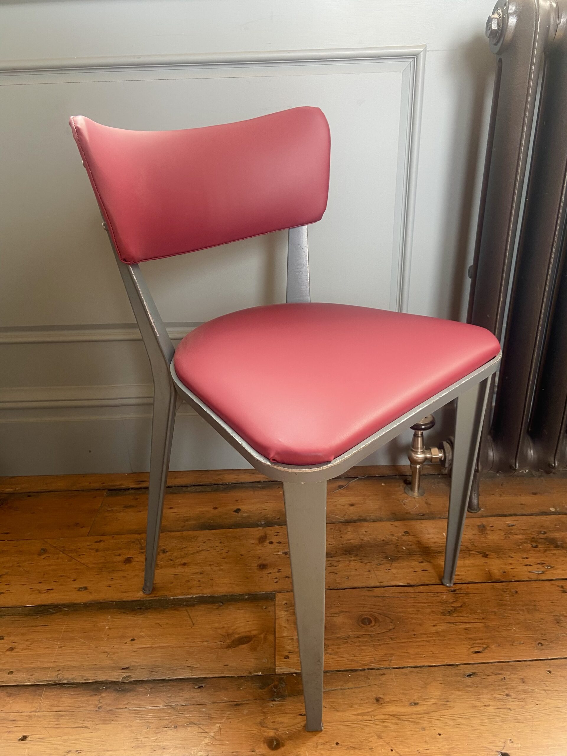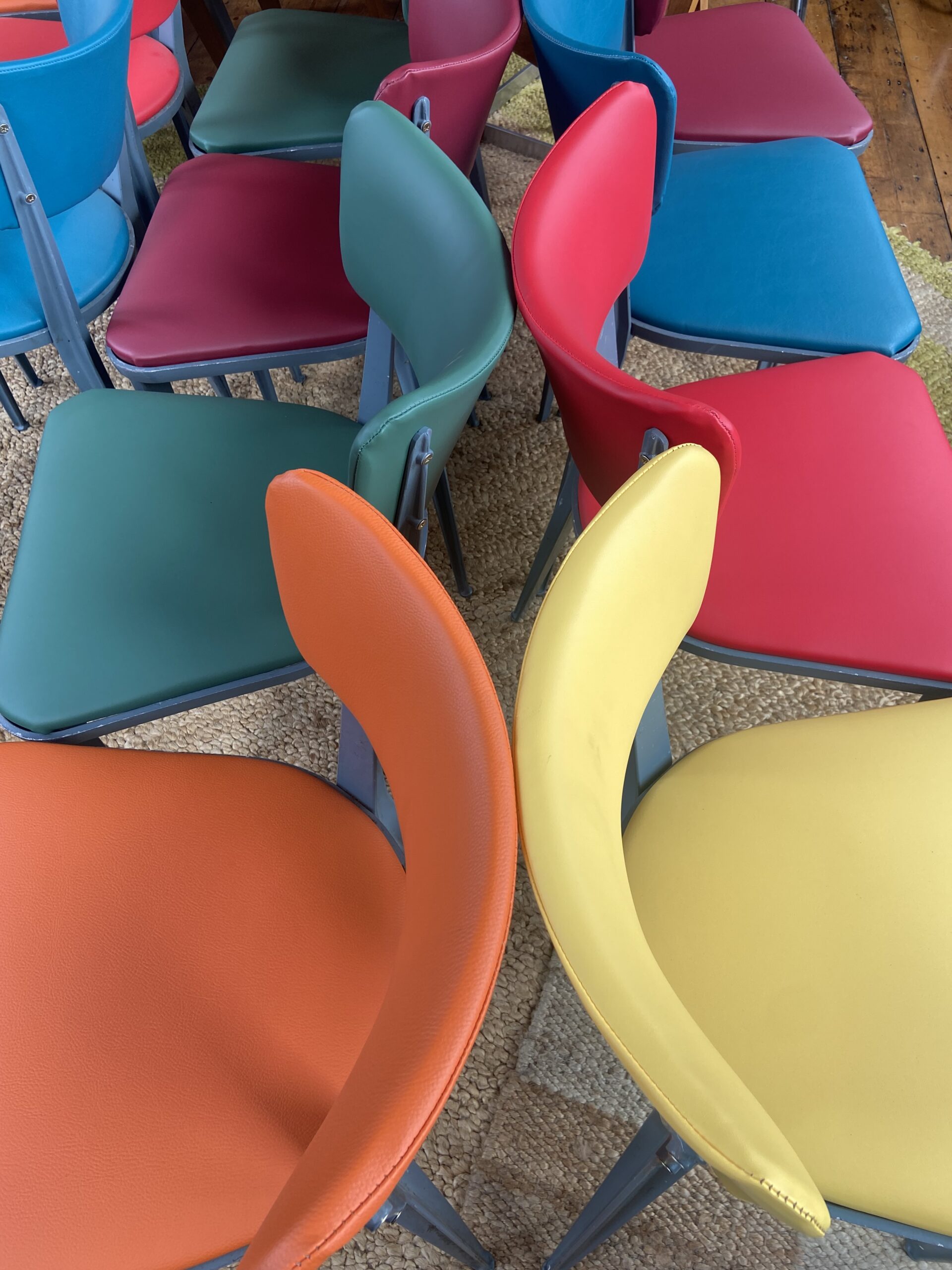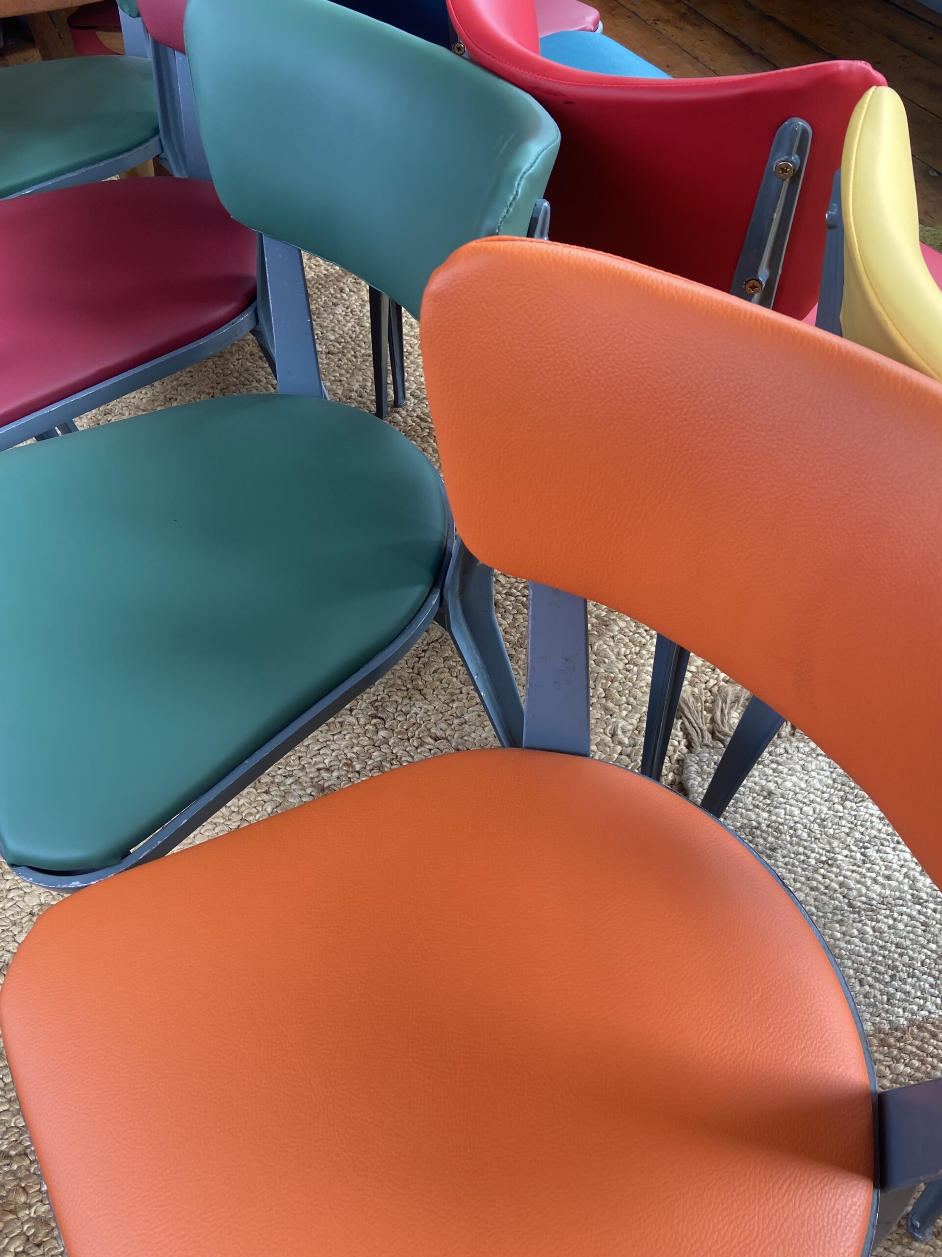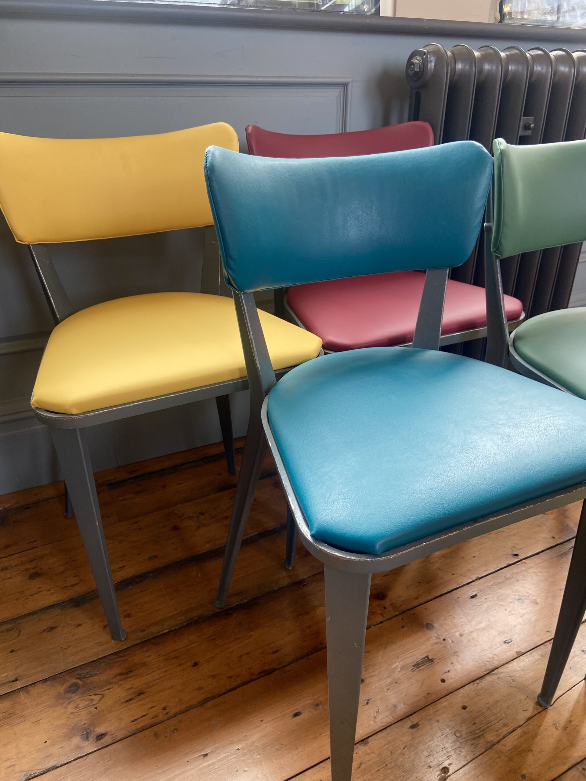 Designed in early 20th century and made from old aircraft and armaments from the second world war. Newly upholstered with original metal frames – these Ernest Race Model BA23 aluminium chairs feature brightly coloured faux leather, in yellow, orange, blue, green and red and maroon.