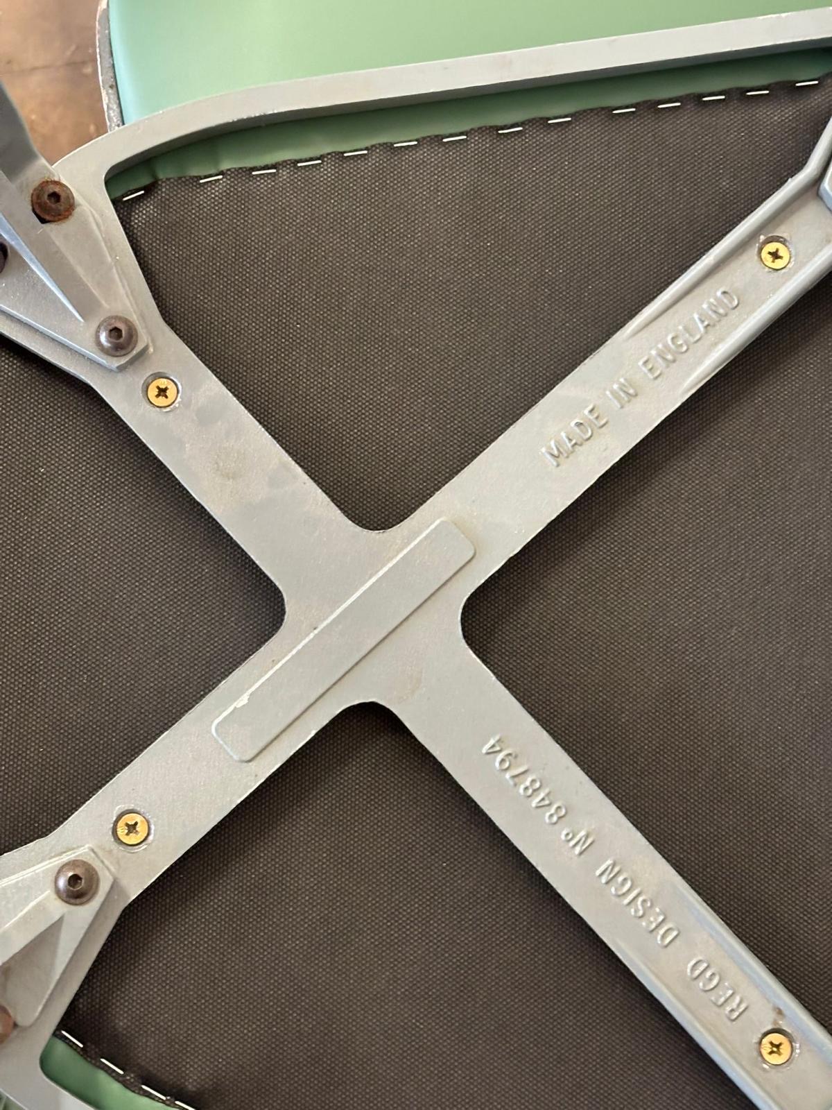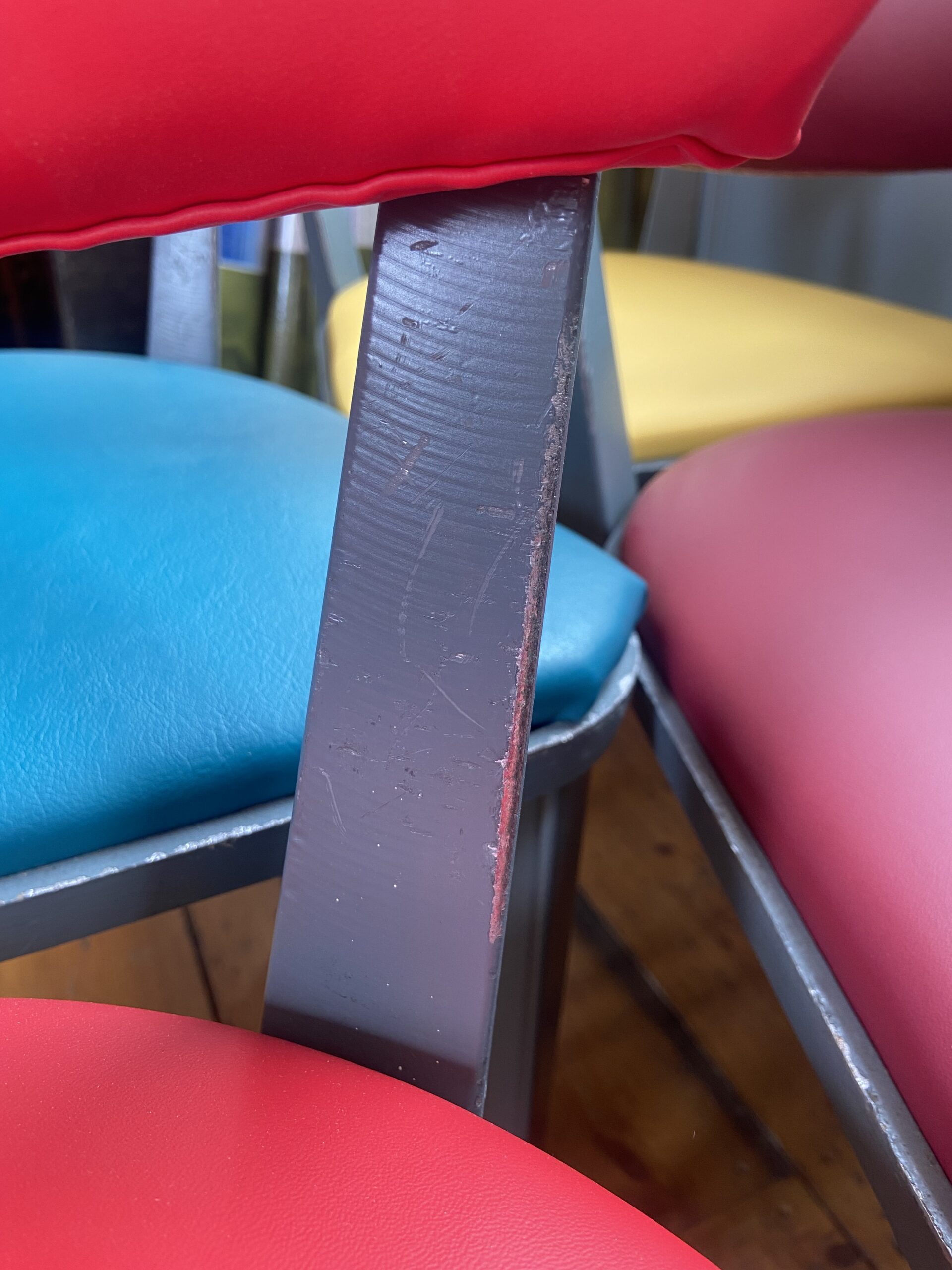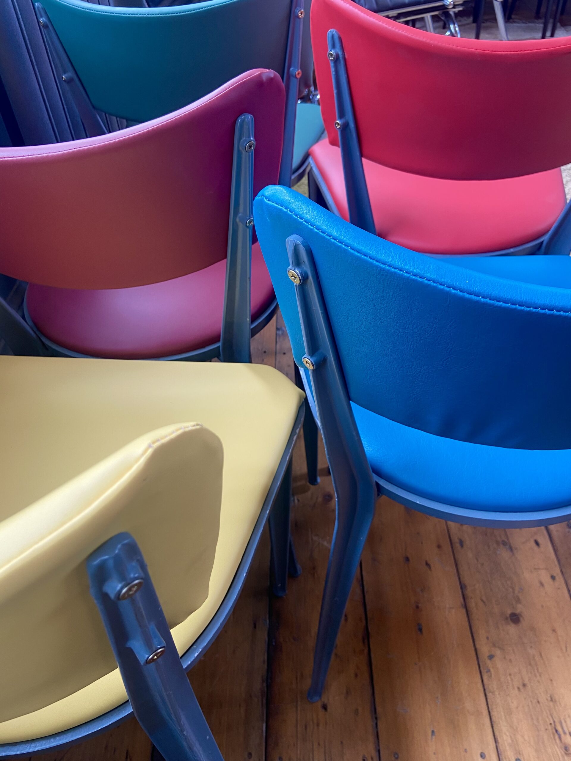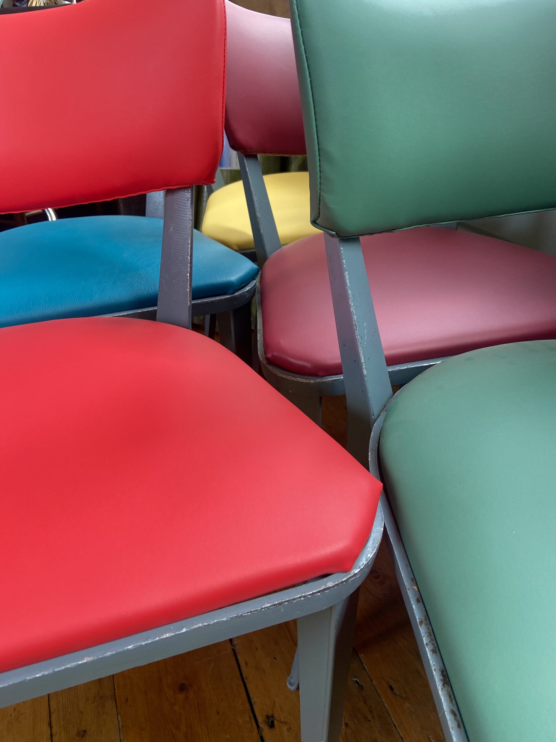 Designed in early 20th century and made from old aircraft and armaments from the second world war. Newly upholstered with original metal frames – these Ernest Race Model BA23 aluminium chairs feature brightly coloured faux leather, in yellow, orange, blue, green and red and maroon.