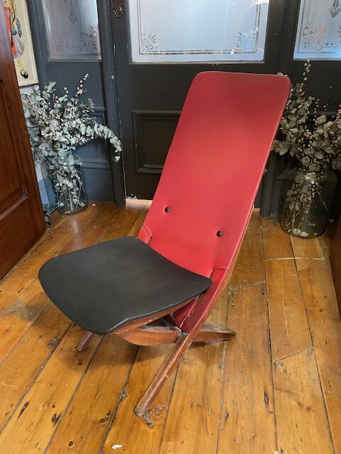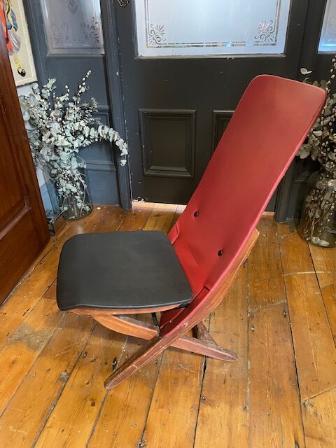 This sculptural mid-century lounge chair features a sleek wooden frame with a red and black vinyl seat and backrest. The chair’s minimalist design and angular form showcase classic 1950s-60s French modernism.