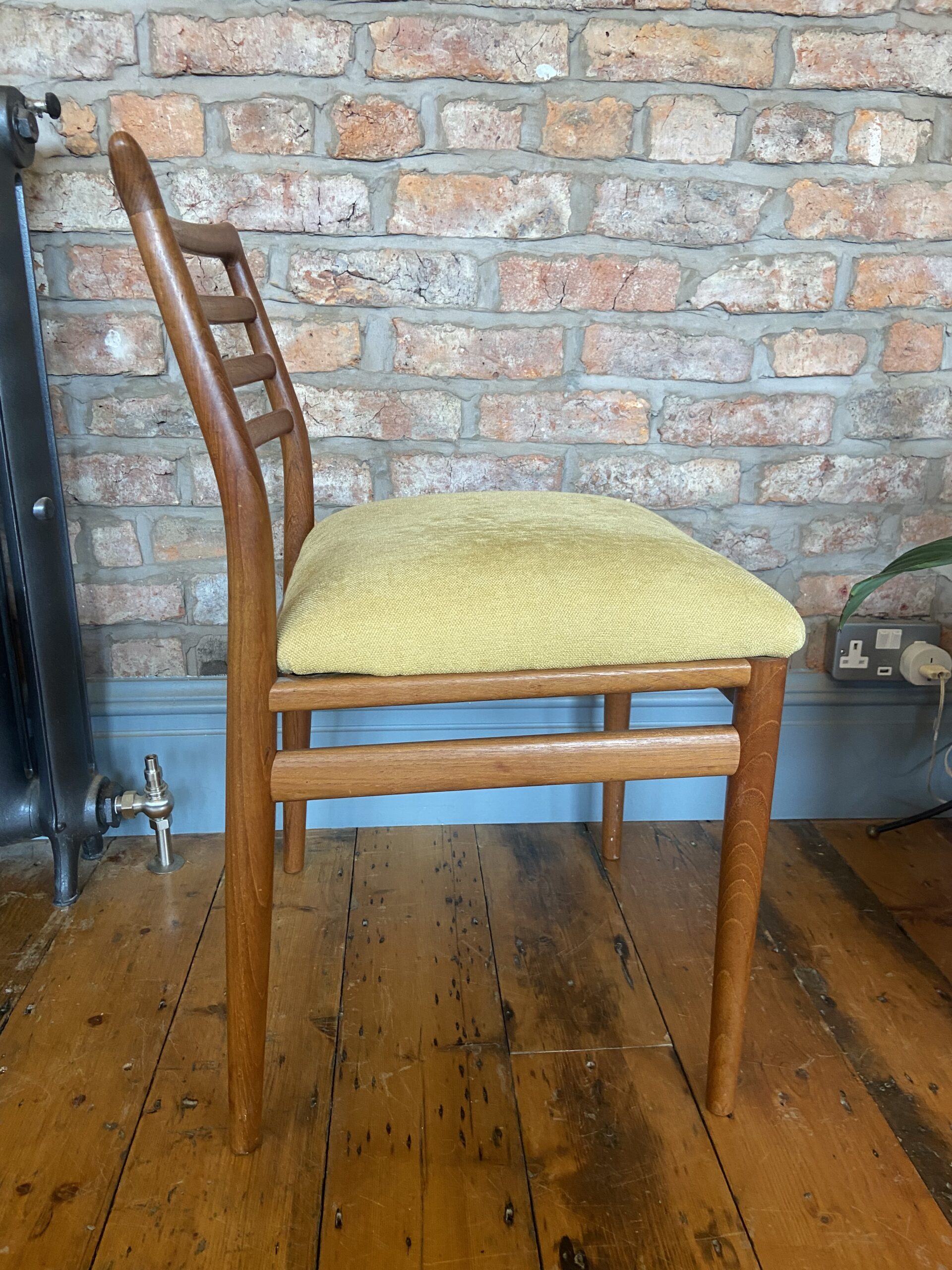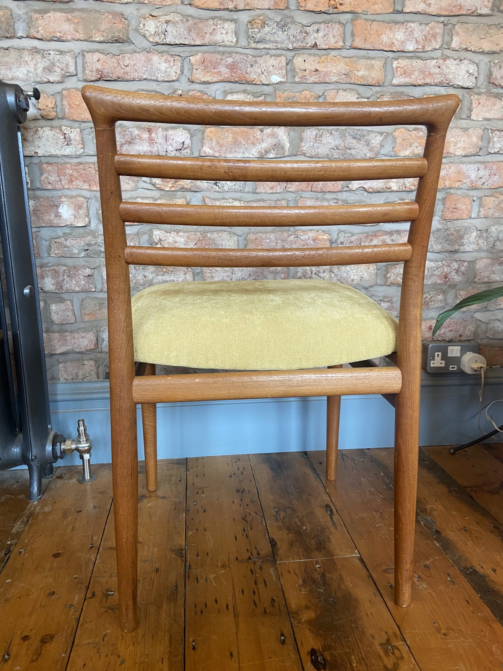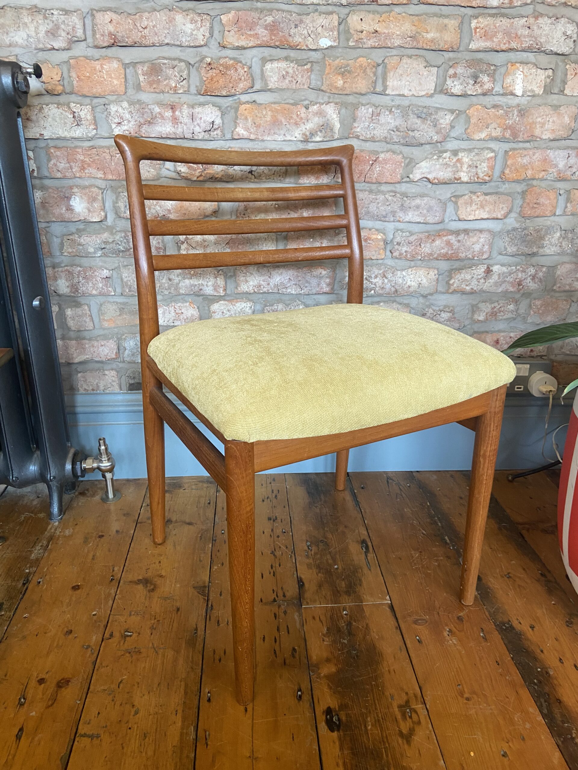 Elegant mid-century dining chair designed by Erling Torvits, crafted from solid teak with a sculptural ladder-back and tapered legs. The seat is upholstered in a soft mustard-yellow fabric, offering both comfort and classic style.