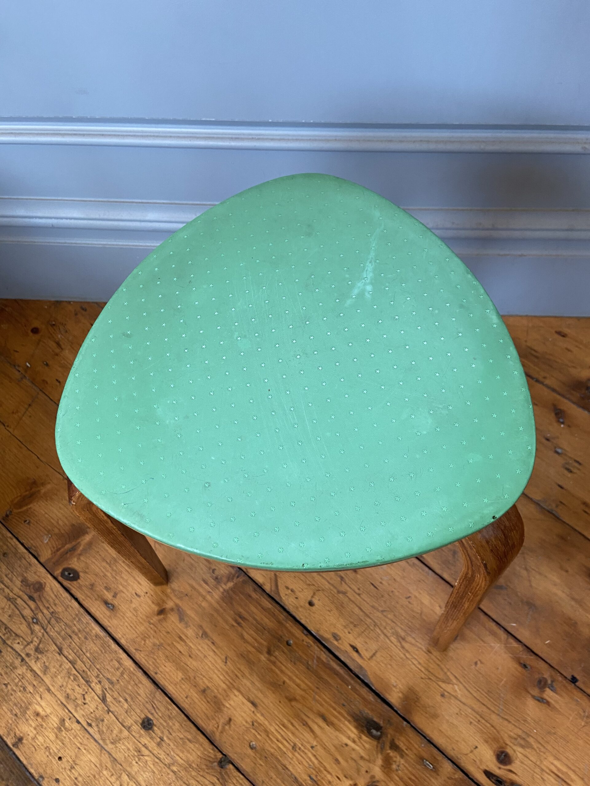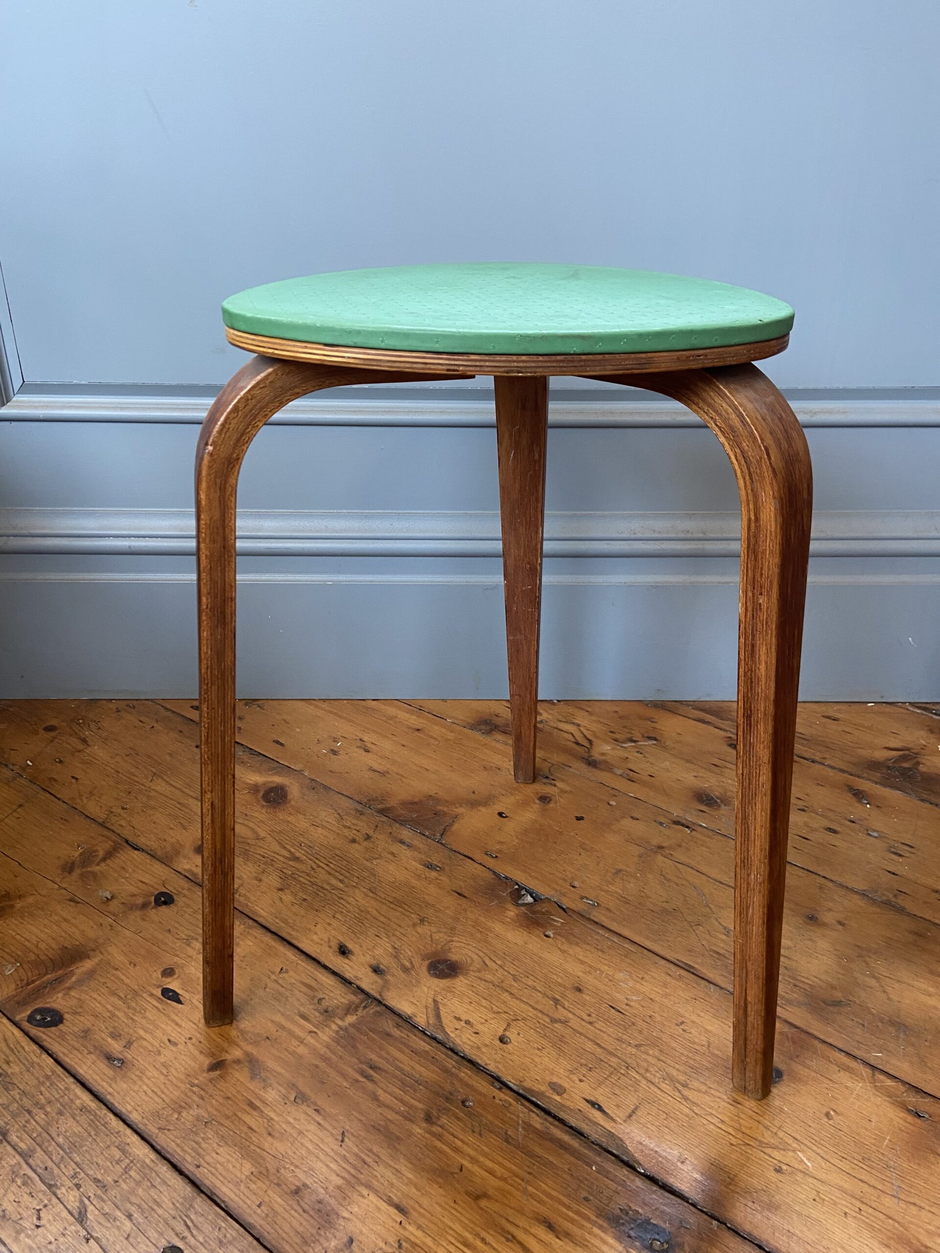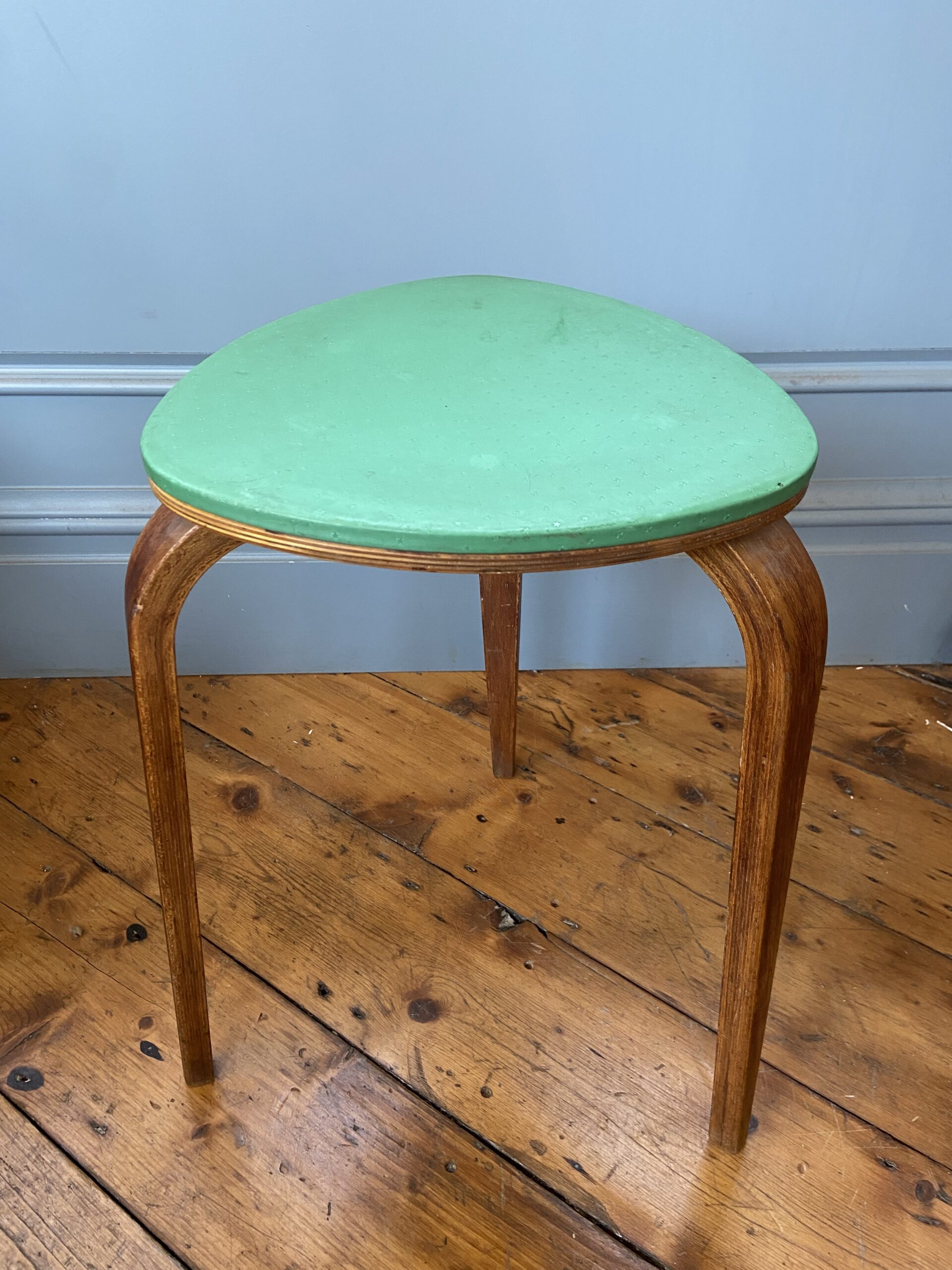 A beautiful mid-century bentwood three-legged stool with a triangular green laminated seat and curved wooden legs. Compact and versatile. Good vintage condition with light wear.