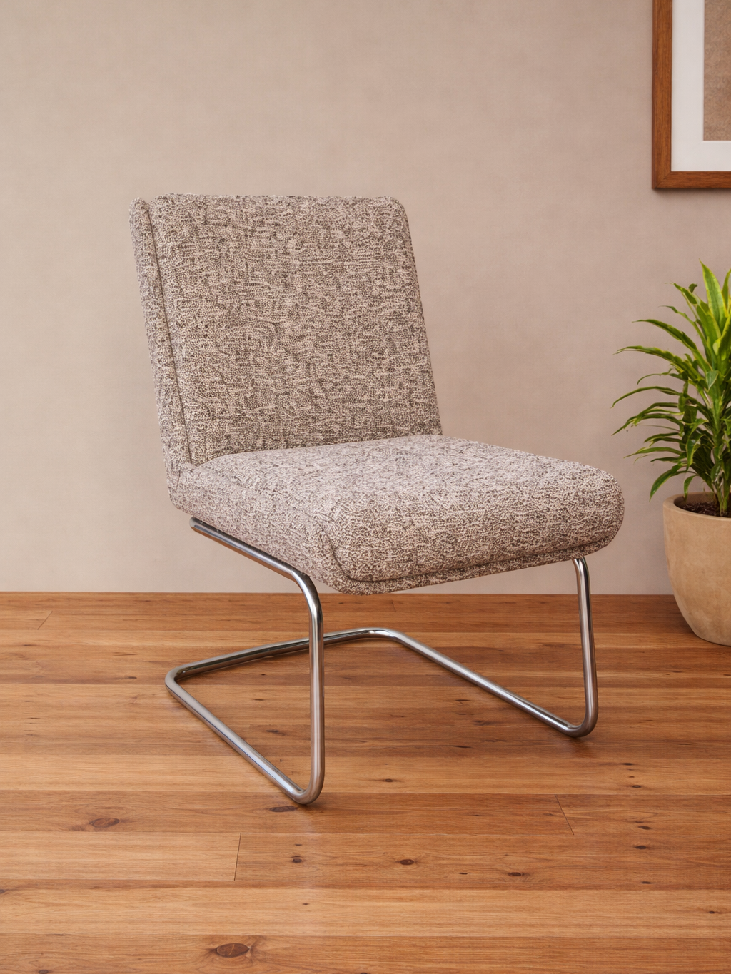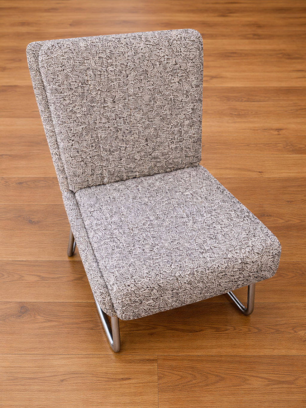 This is a mid-century cantilevered chair, with a chrome frame and upholstered in a grey tweed-style fabric.