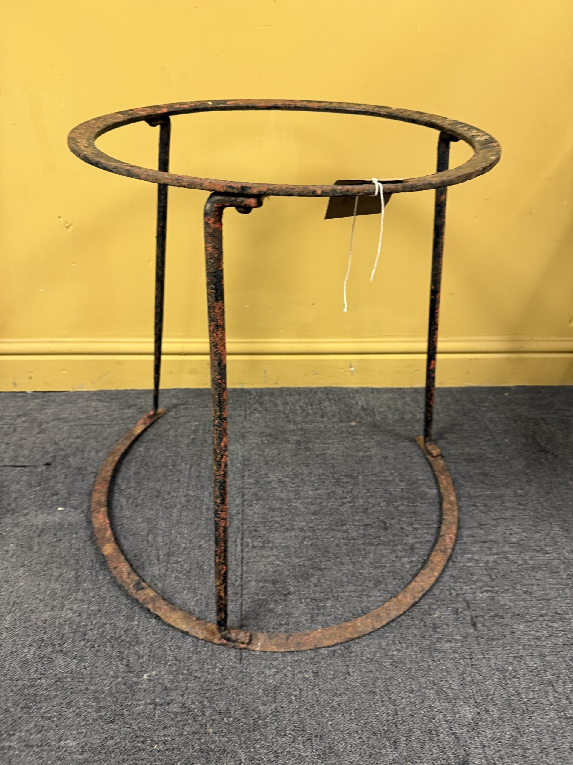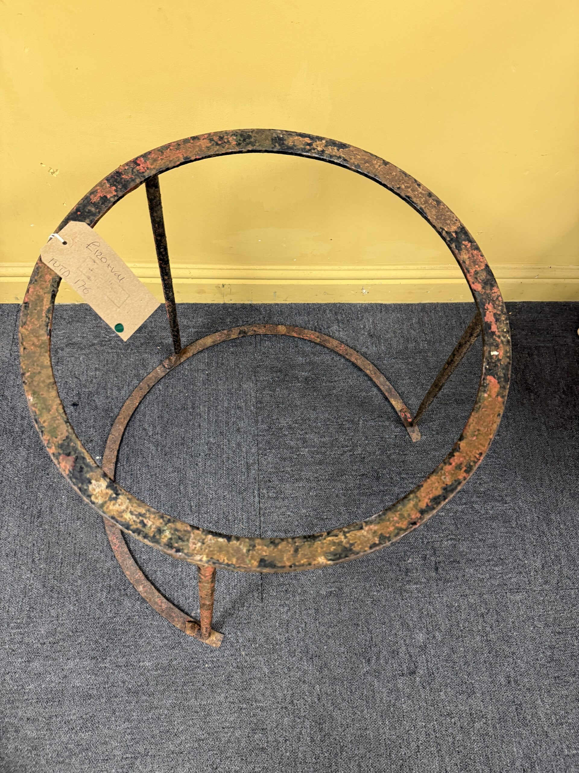 A beautifully aged, Victorian wrought iron table base. With an interesting round design it lends itself to hold an equally beautiful table top.