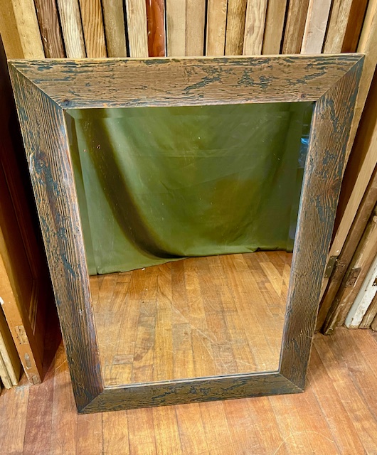 A lovely vintage style mirror with a beveled edge frame and a rustic, dark finish to the wood.