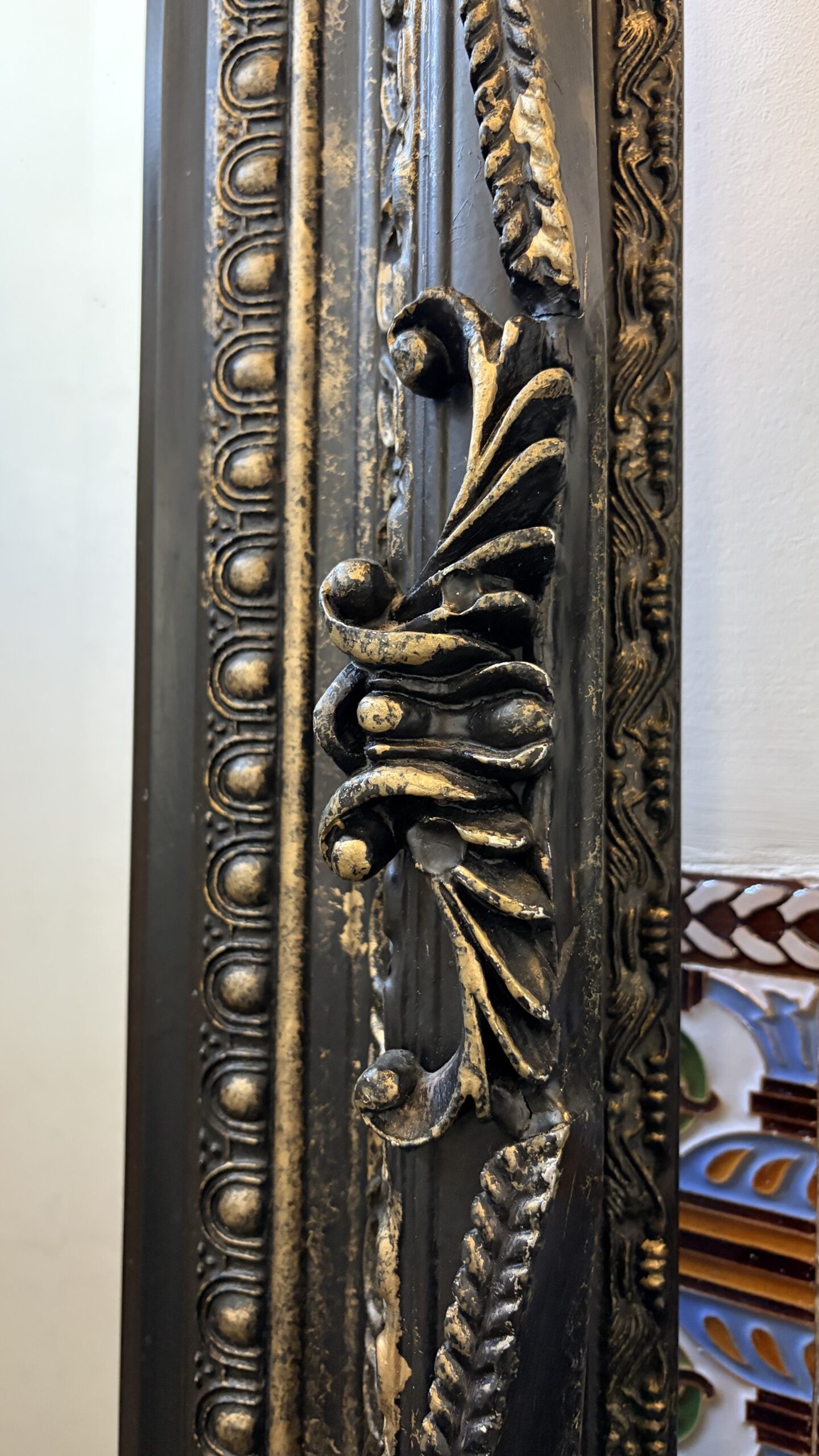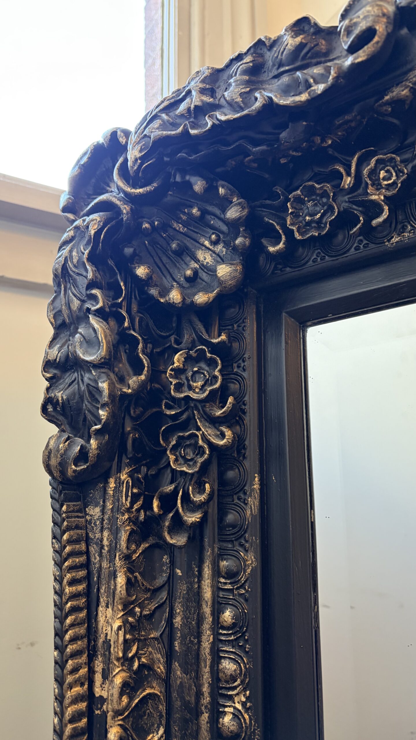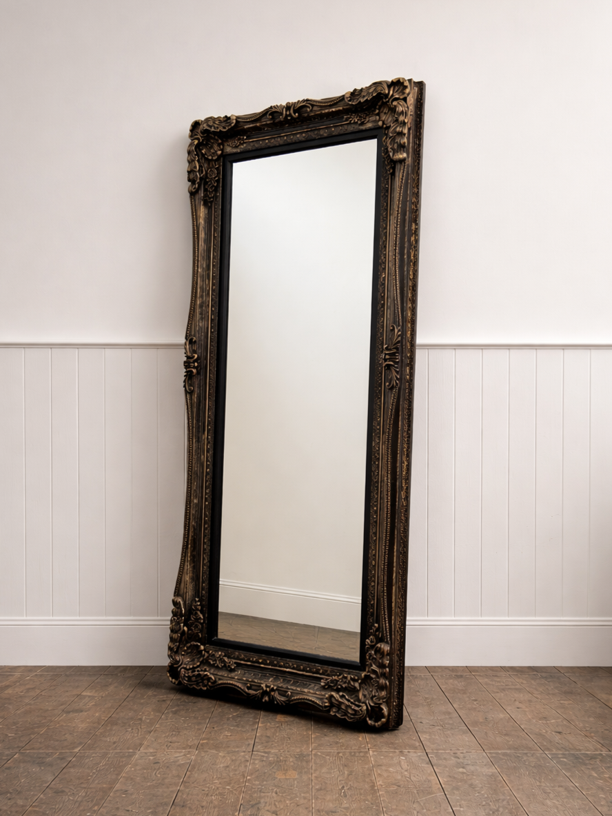 This is a beautiful baroque style leaner mirror, with a brushed antique finish on the frame and ornate carved details.
