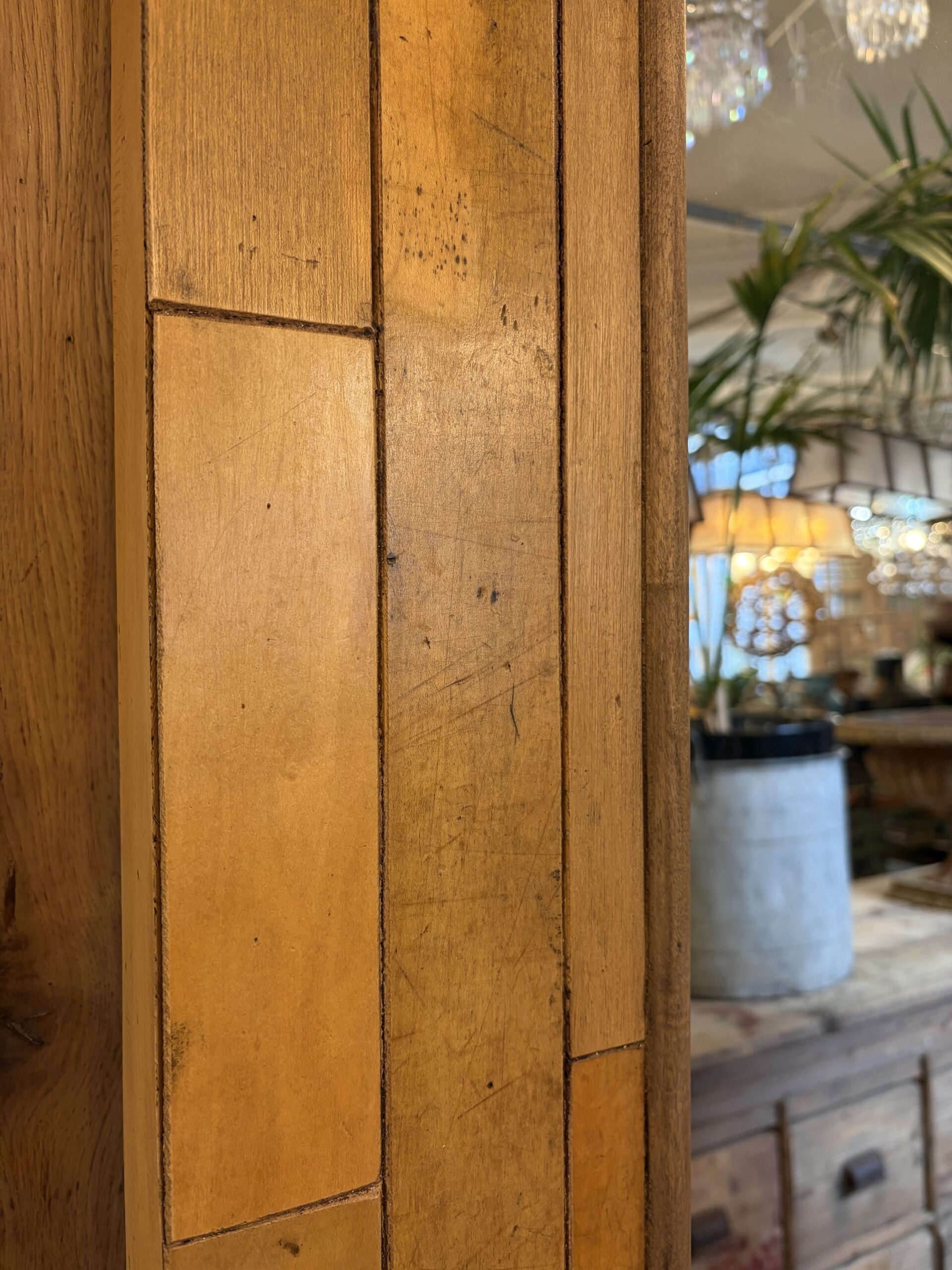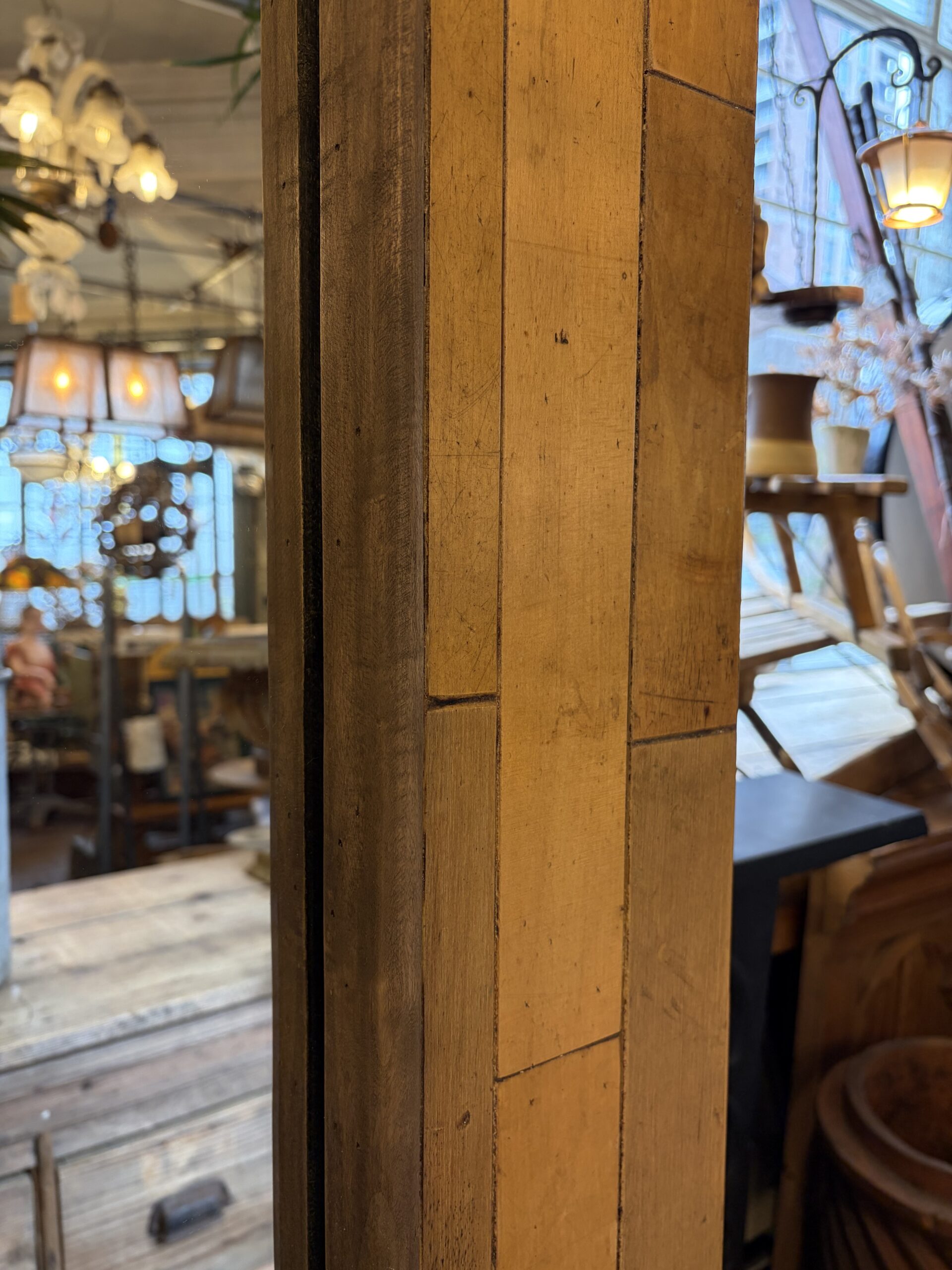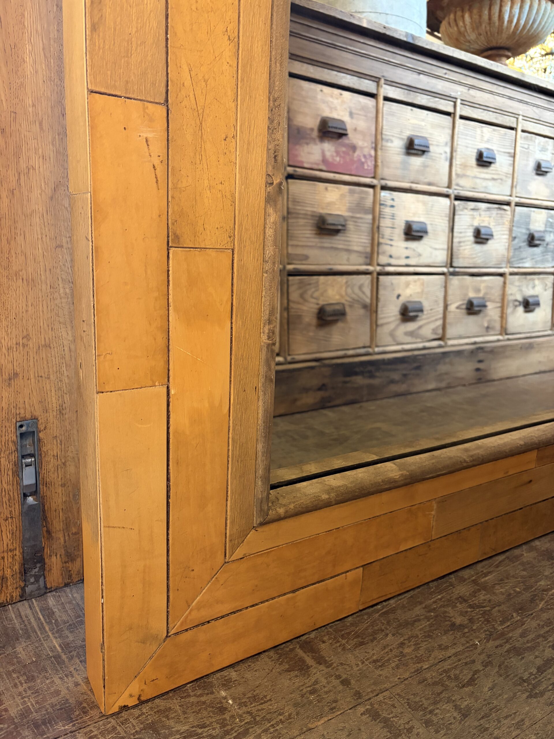 This particularly large mirror uses reclaimed maple stripped flooring for the frame, creating an interesting, mid-century feel to the overall look of the mirror.