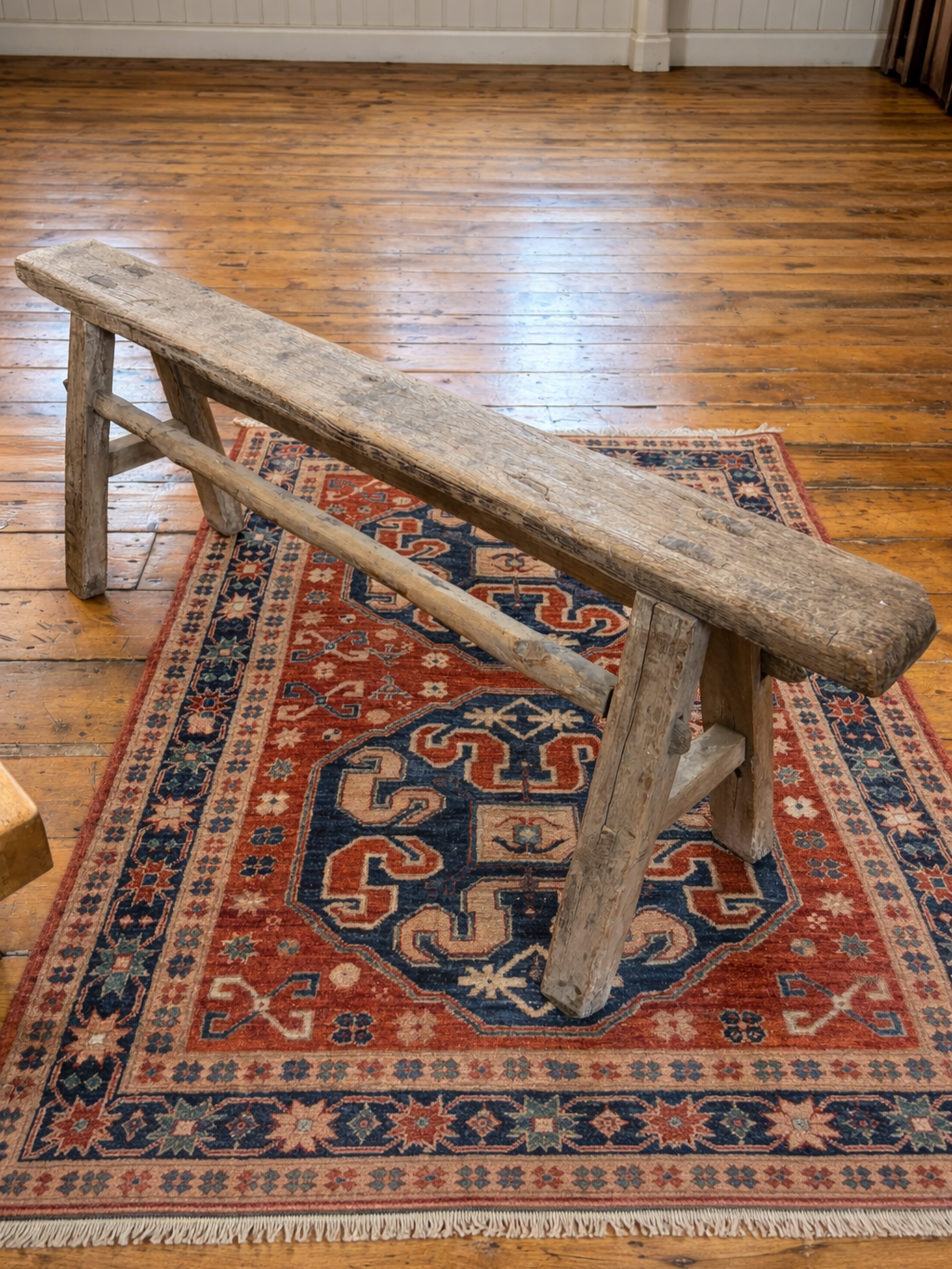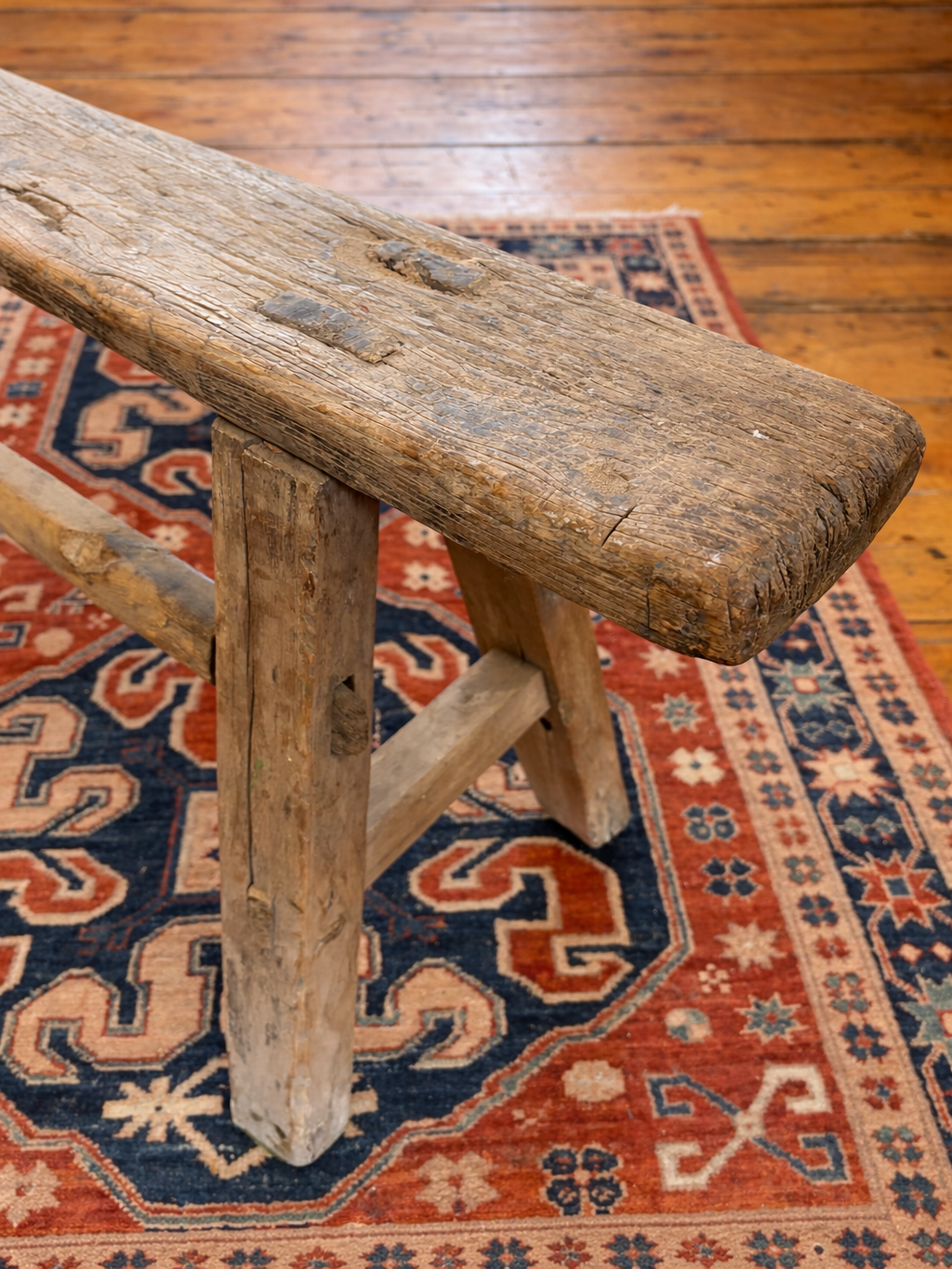 This is a vintage rustic bench, often referred to as a farmhouse or pig bench, featuring traditional construction with solid elm wood and a weathered patina. These benches are handmade, meaning each piece is unique with its own characterful appearance.