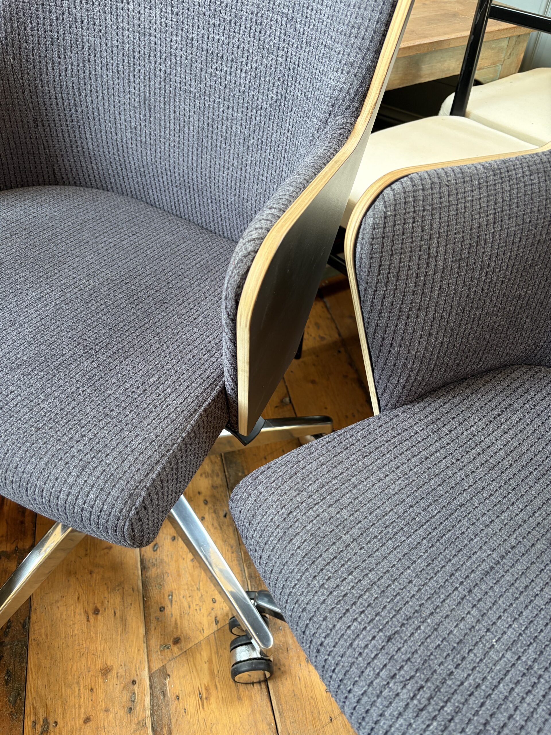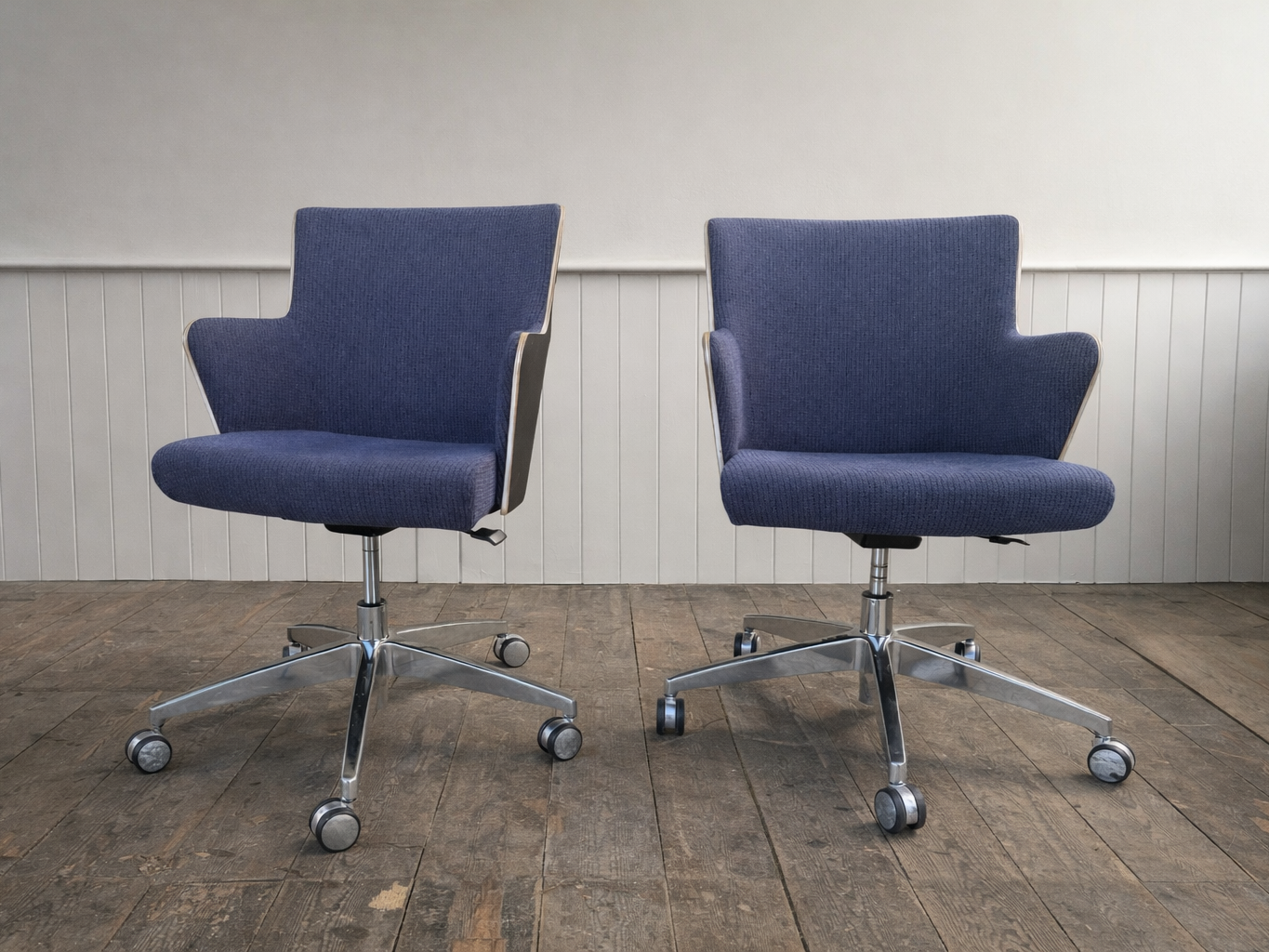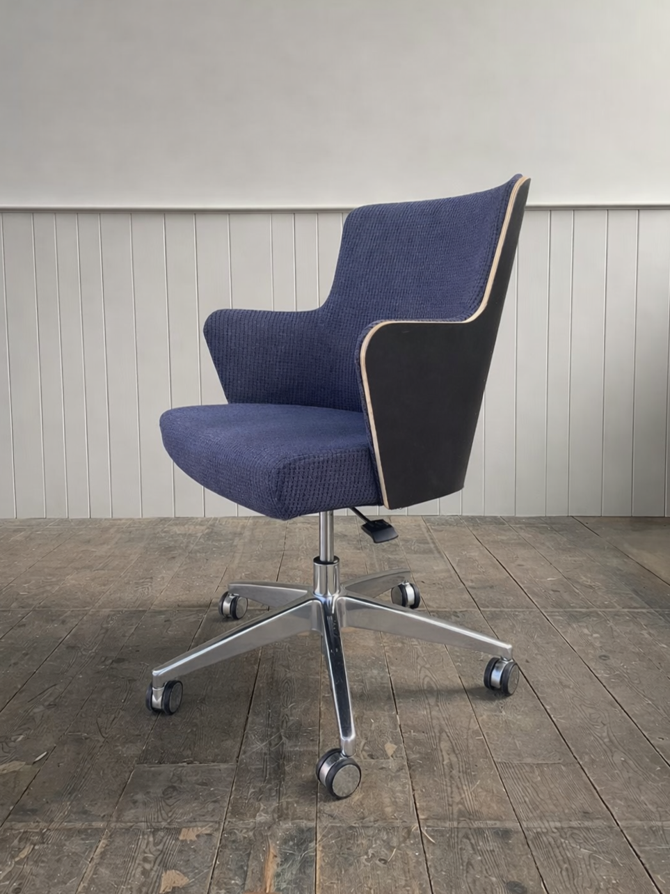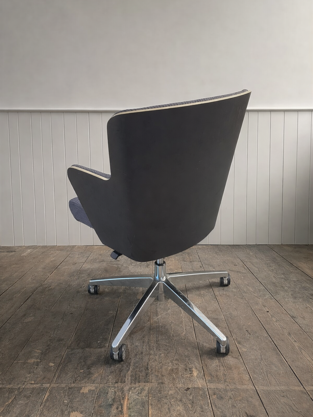 This is a contemporary conference chair, typically made for offices, featuring a chrome swivel base and is characterised by it’s sleek, unified silhouette, integrated armrests, and high-quality navy blue upholstery, featuring a distinct wooden back shell in a black finish. With caster wheels for easy movement.
