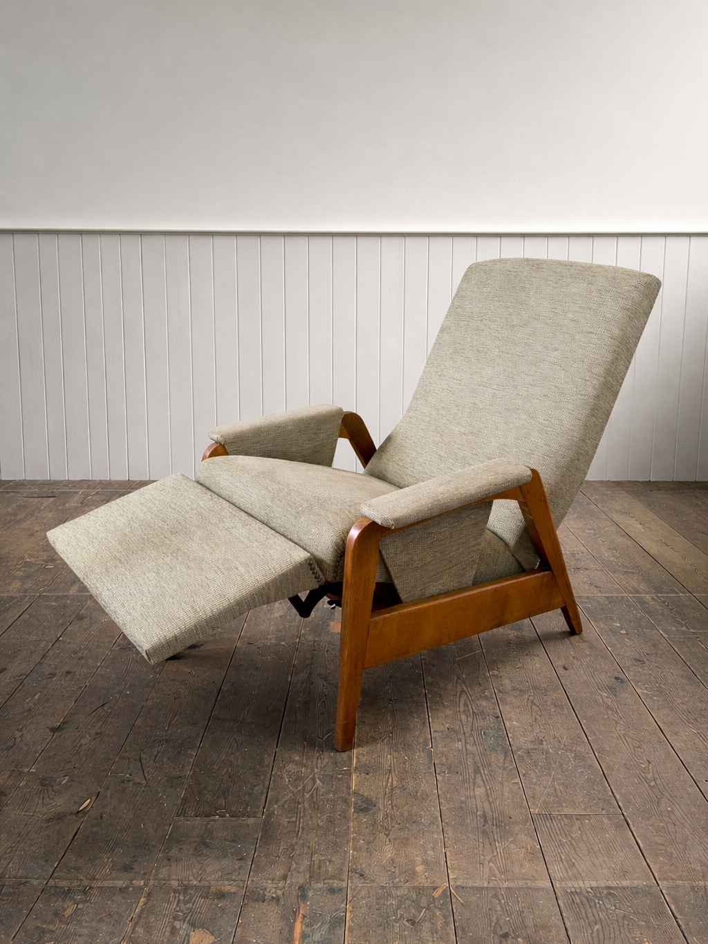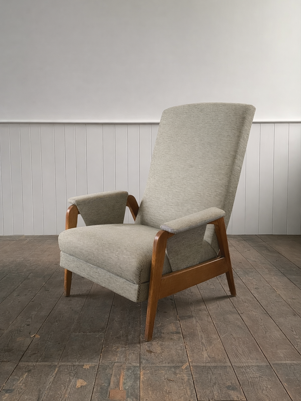 This is a beautiful mid-century recliner chair, characterstic of typical Danish design of the time. Featuring a solid oak frame, with fabric across the arm rests. The chair features a recliner mechanism meaning it can sit upright or be tilted to bring up a footrest from underneath.