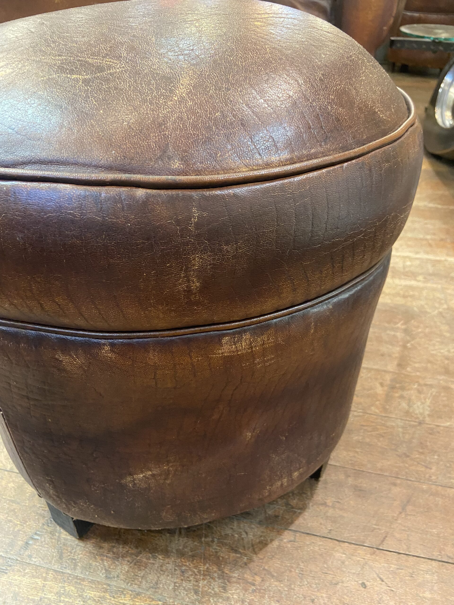 A fantastic leather footstool which showcases original leather that exudes character with well-worn charm.