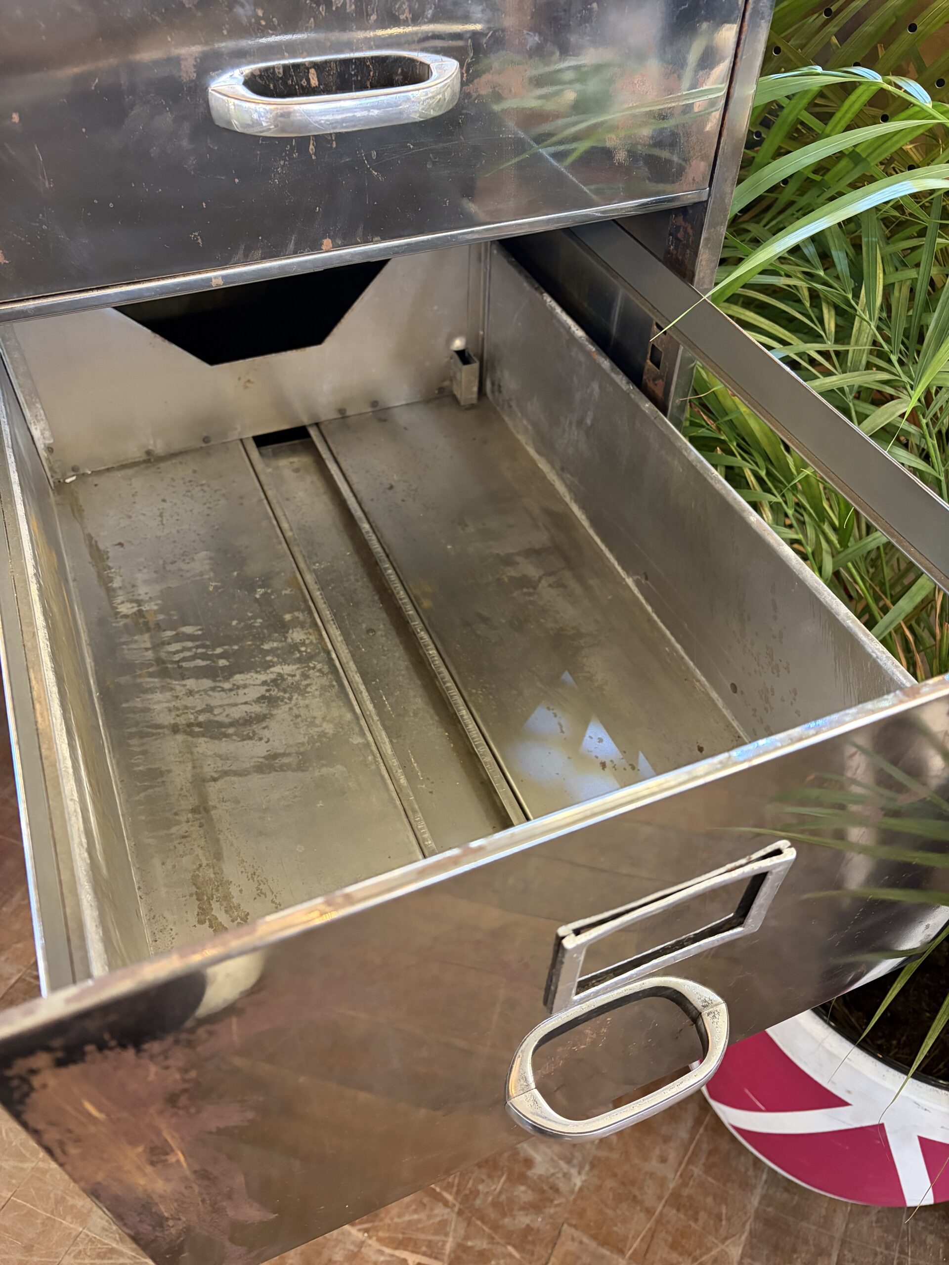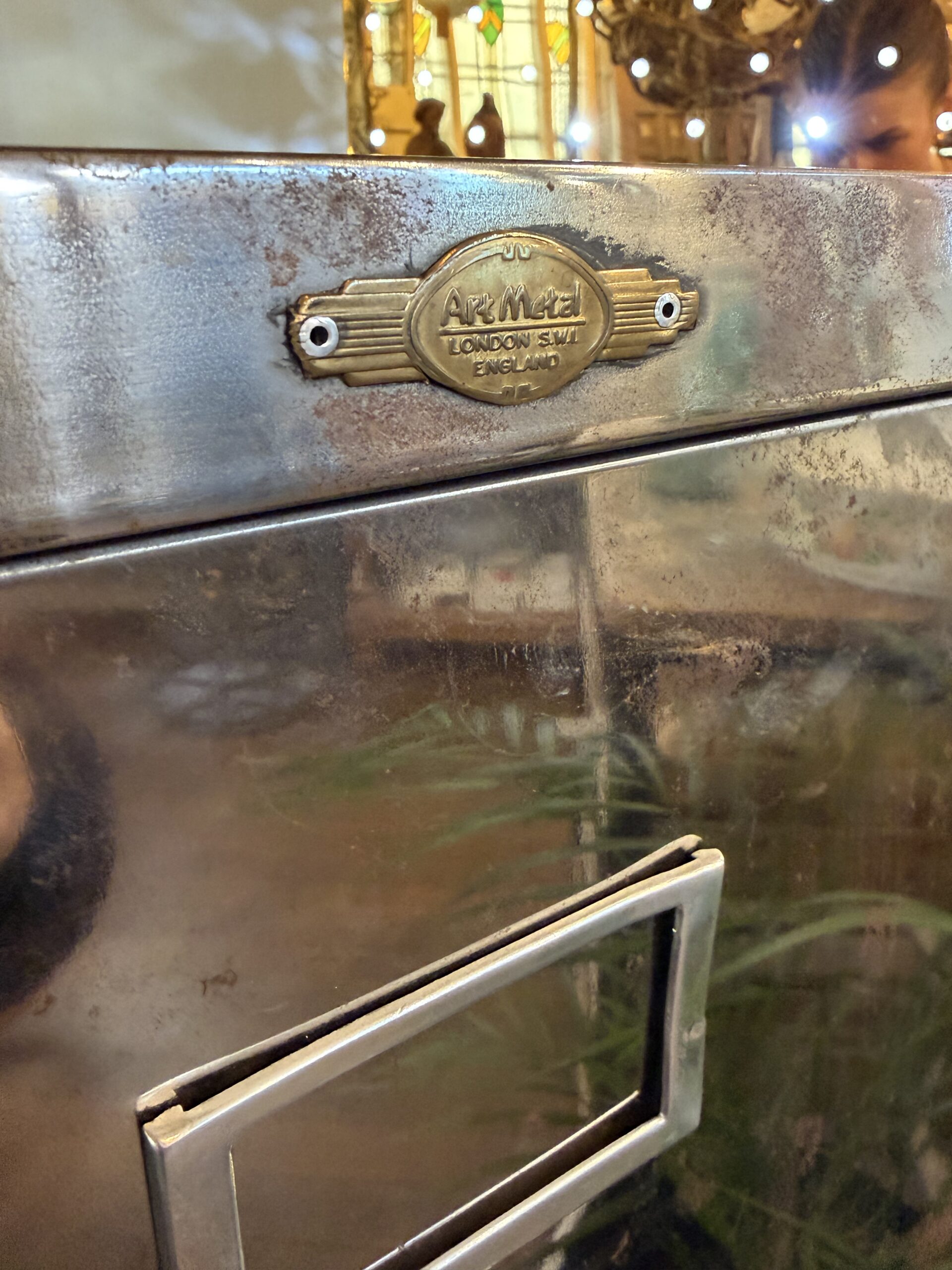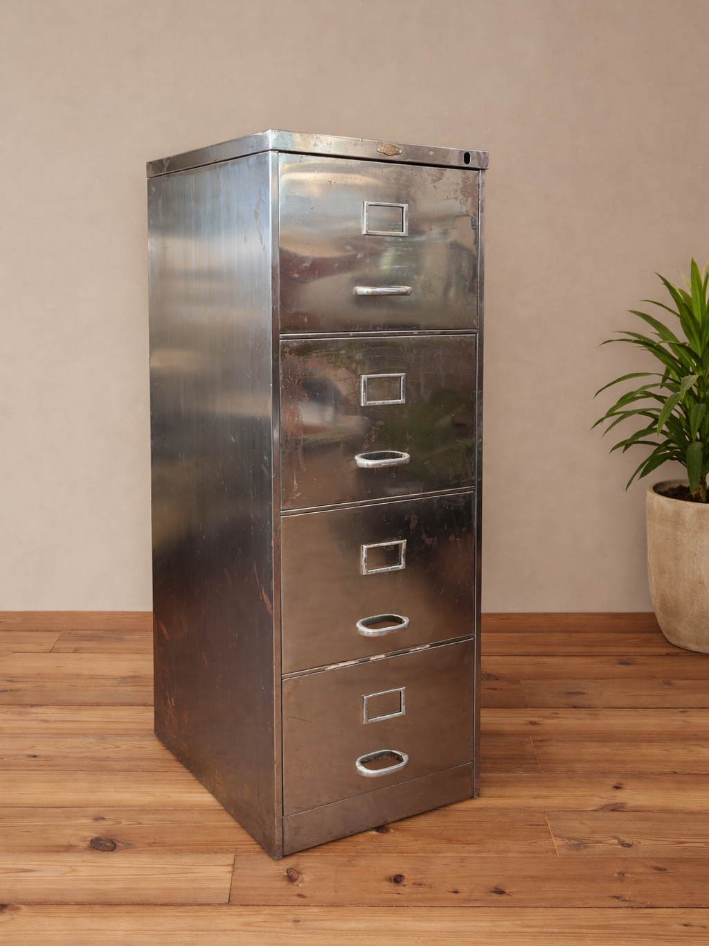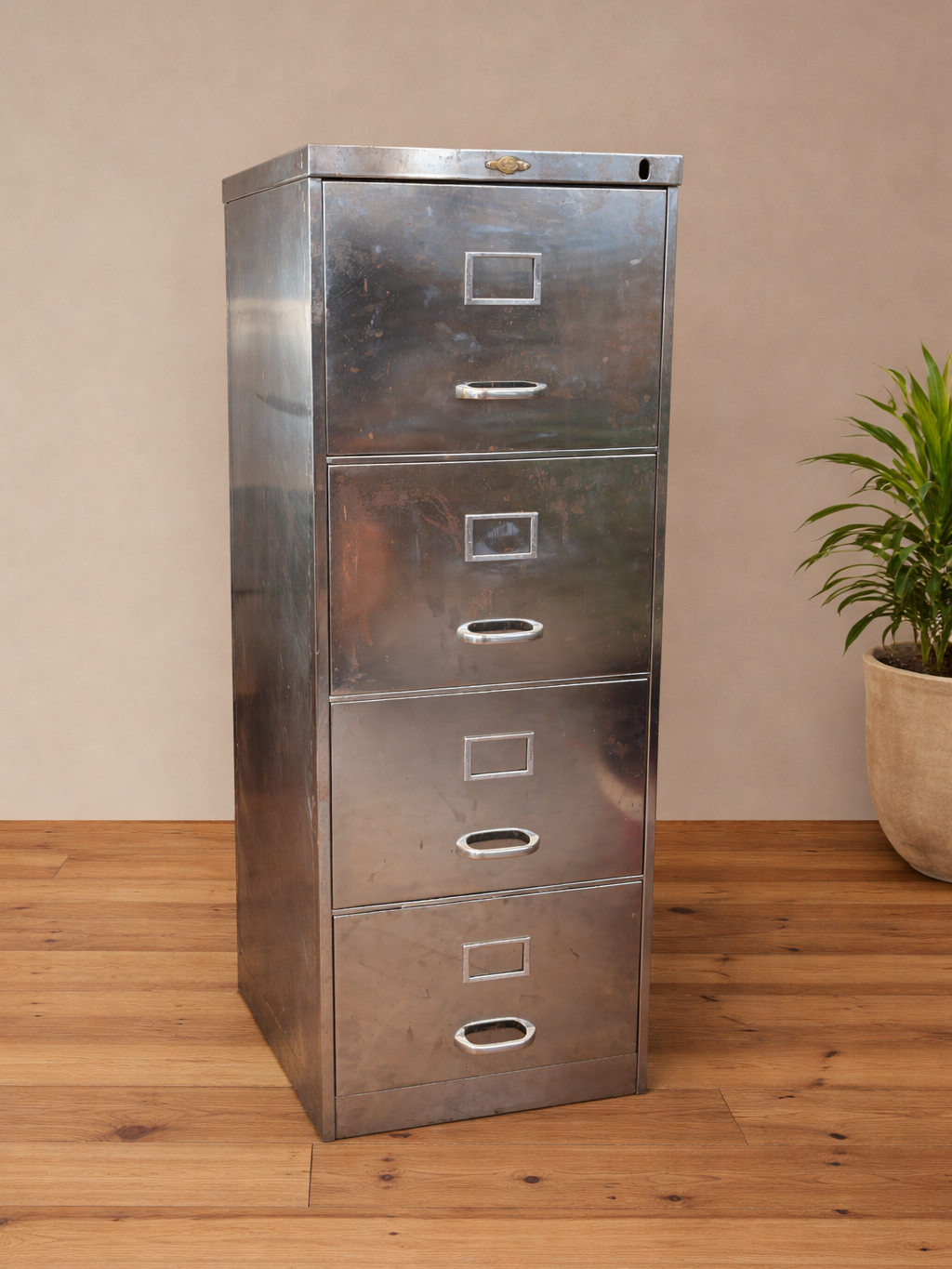 This is a 1960’s polished steel filing cabinet, by Art Metal (London SW1) featuring four drawers, and a signs of aged patina across the metal which add to the vintage feel.