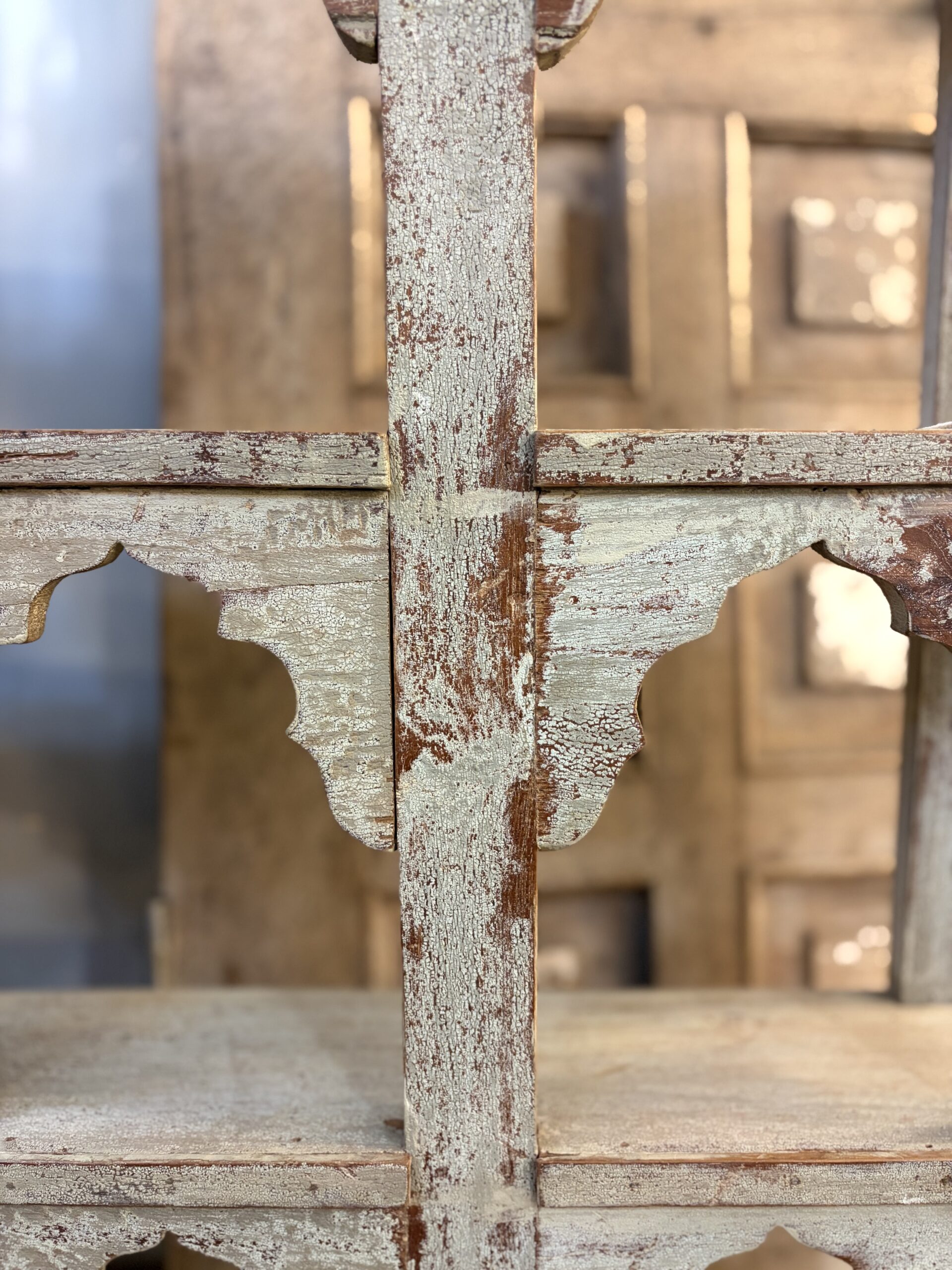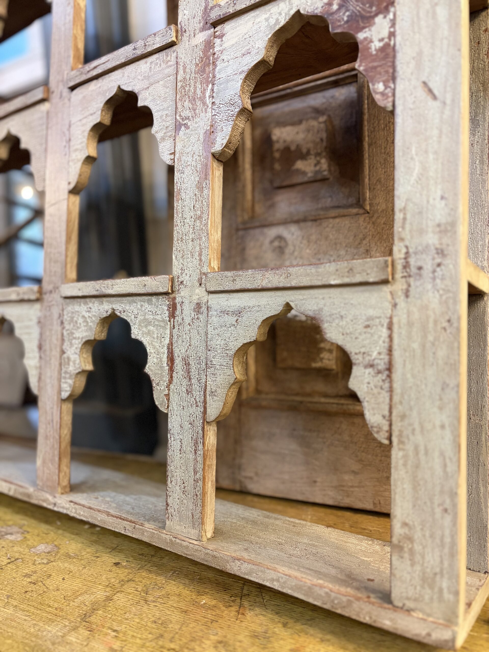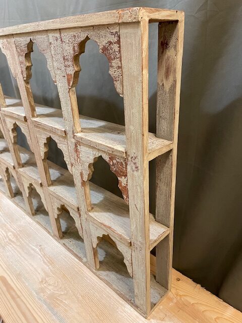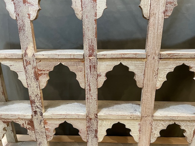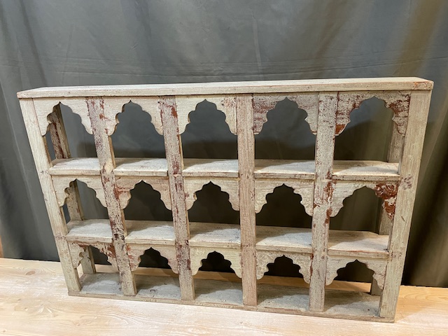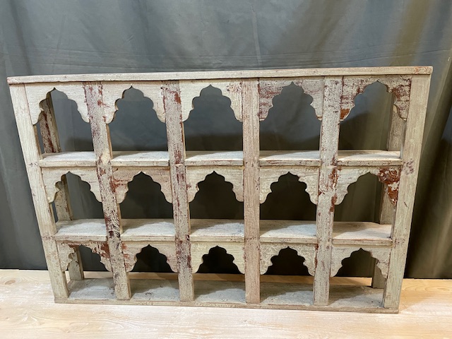 This is a beautiful vintage, Indian hand painted shelf, with mughal style arches. It features a gorgeous rustic patina, made from aged paint and waxed Indian teak wood.