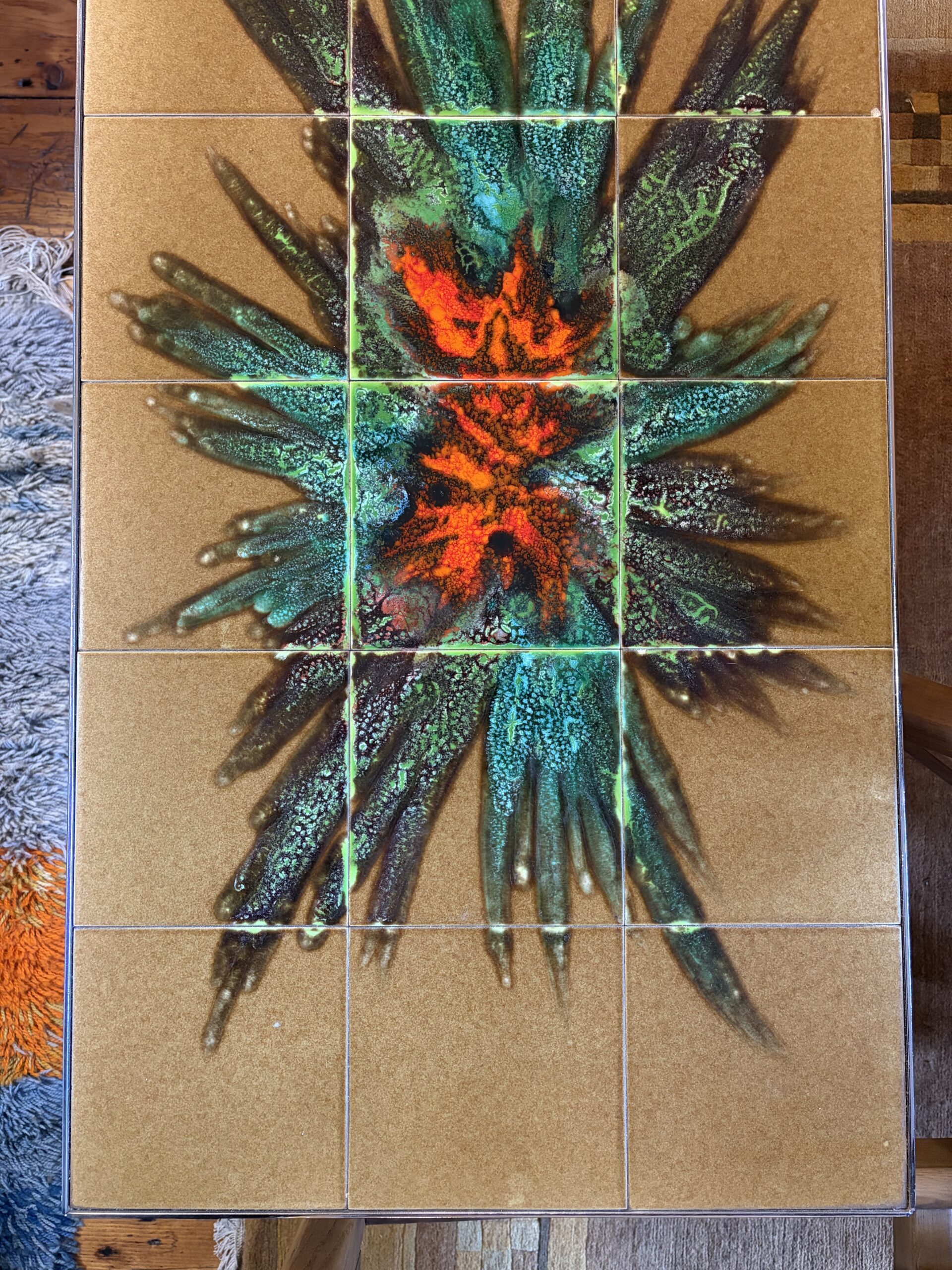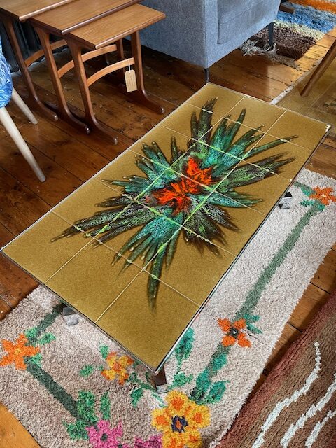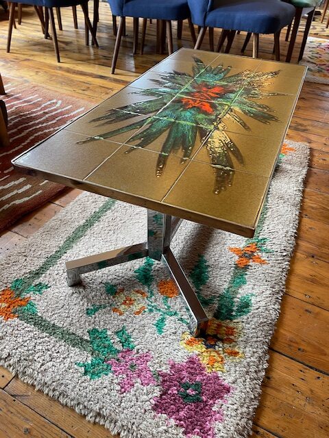 This fantastic mid century coffee table features ceramic tiles with an abstract, starburst design. In yellow, green and red tones, with a chrome metal base.