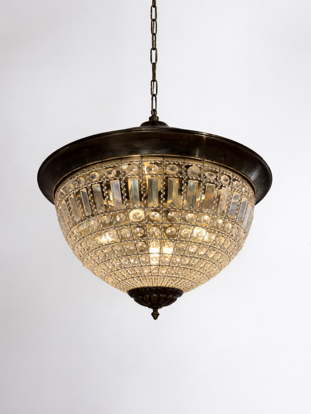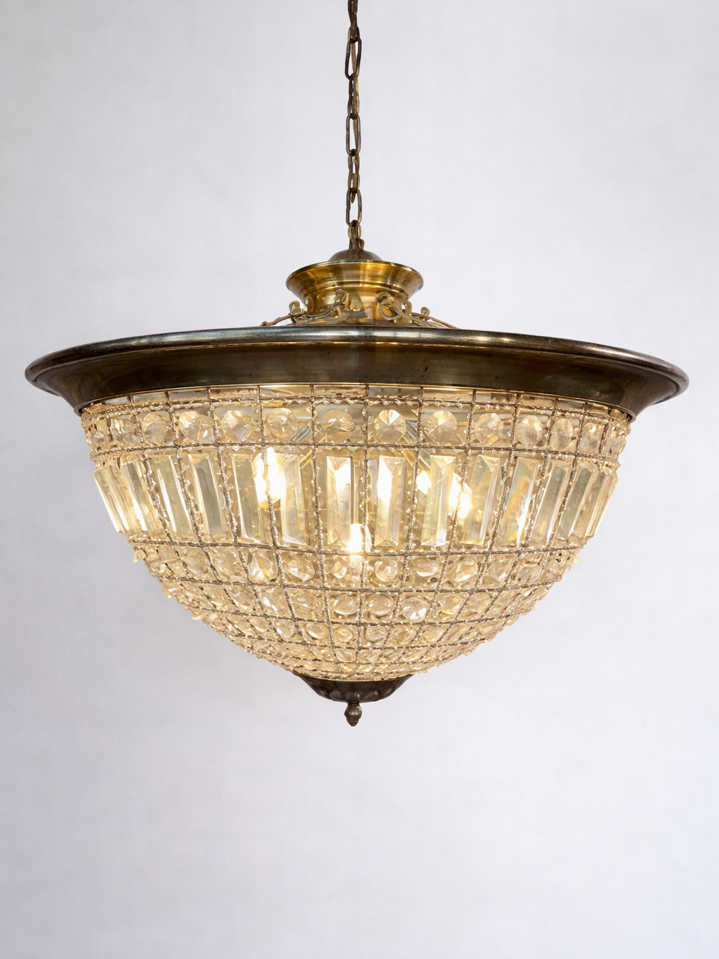 This is a fantastic Empire Style Half Basket Chandelier. This design is characterized by its “basket” shape, which features tiered crystal beads and a decorative metal rim, in a antique brass tone.