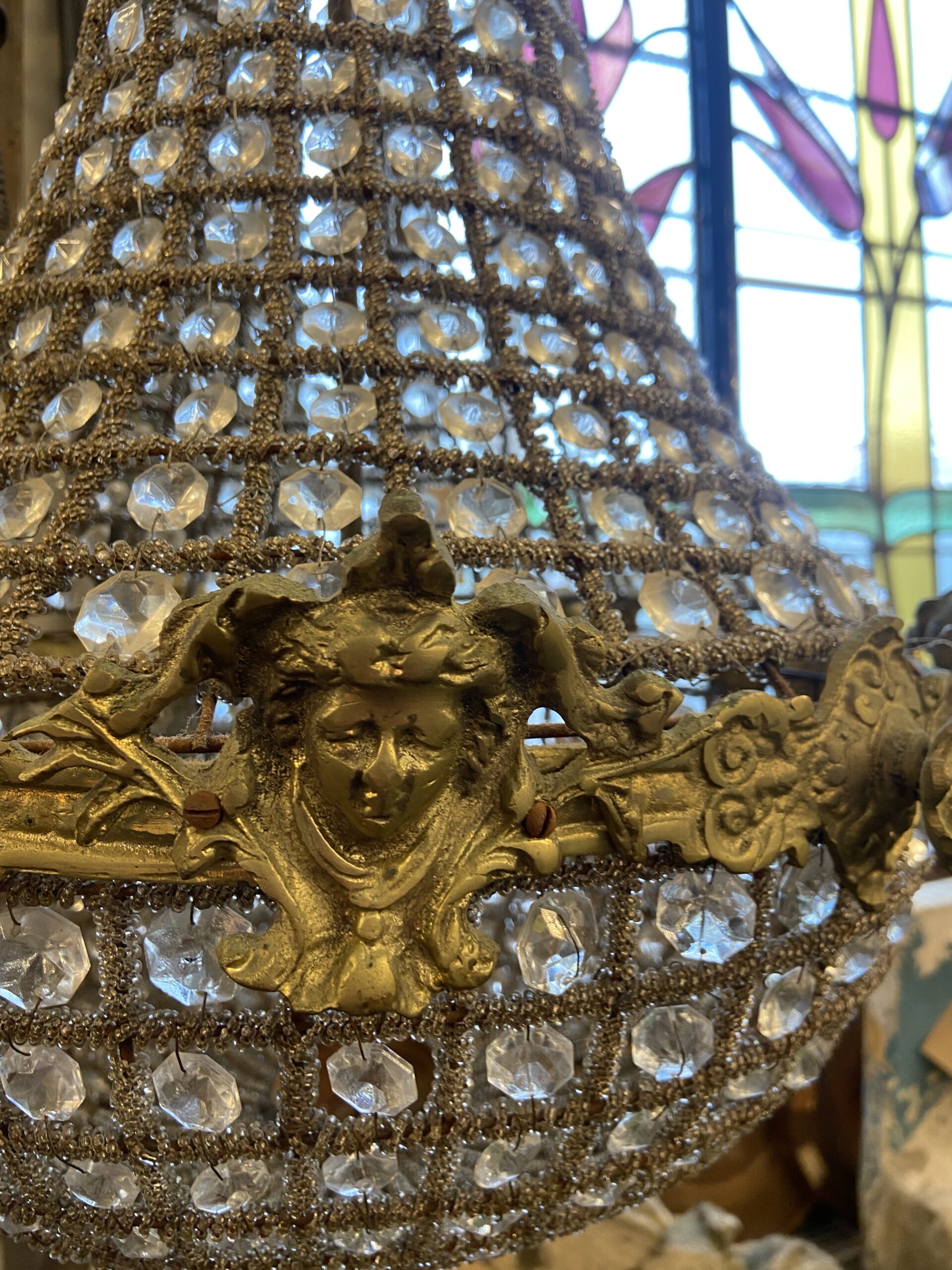 Elegant vintage crystal chandelier in classic Empire style, featuring a teardrop-shaped basket design with faceted crystal beads and ornate gilded brass detailing.