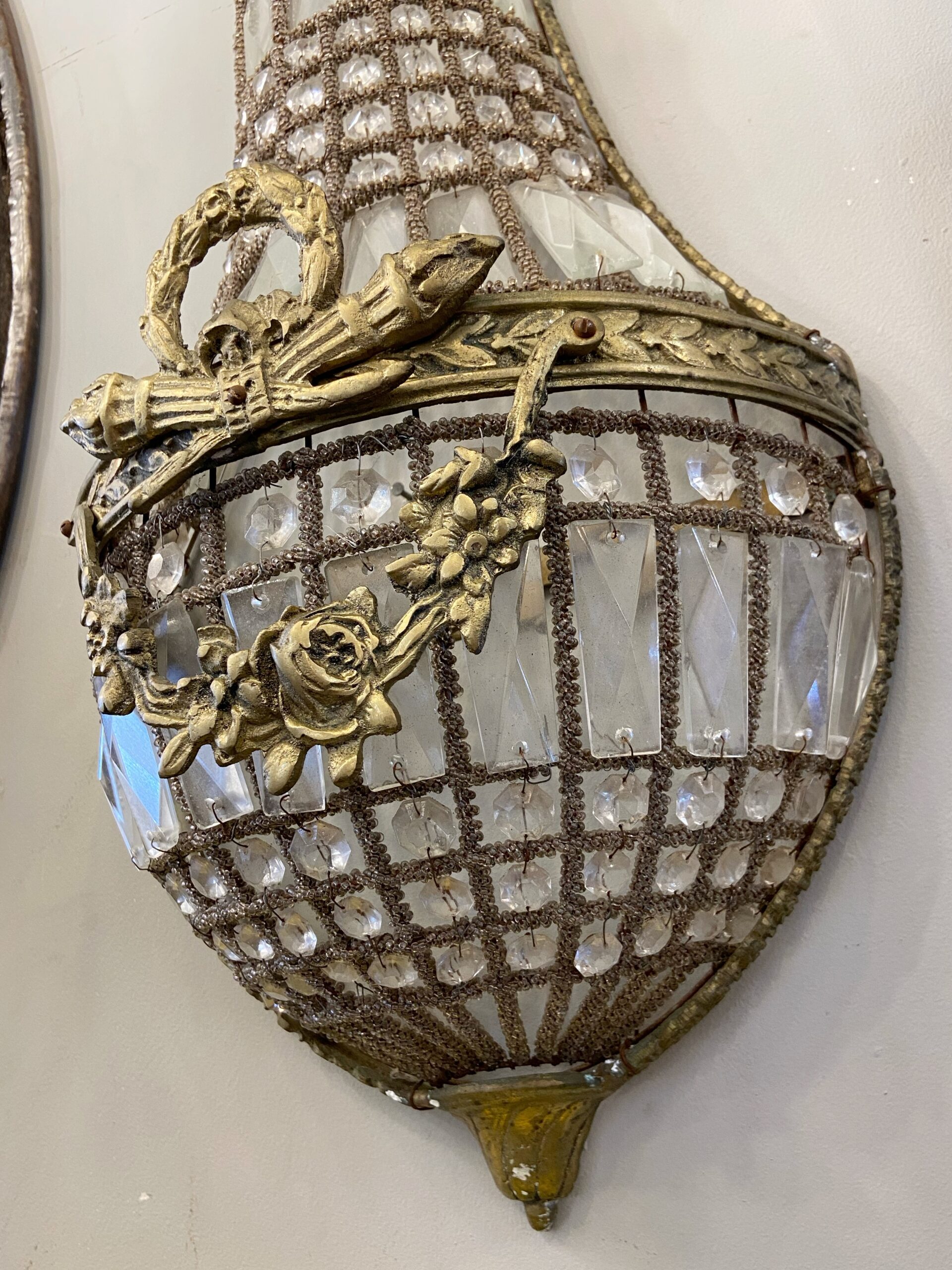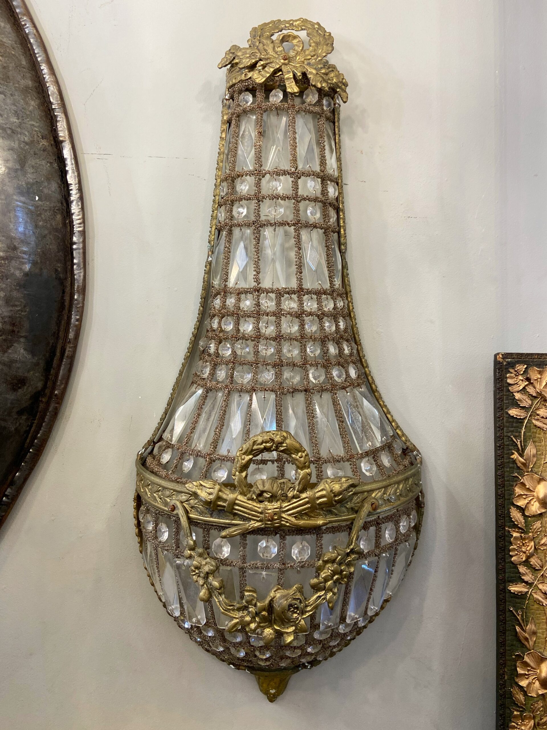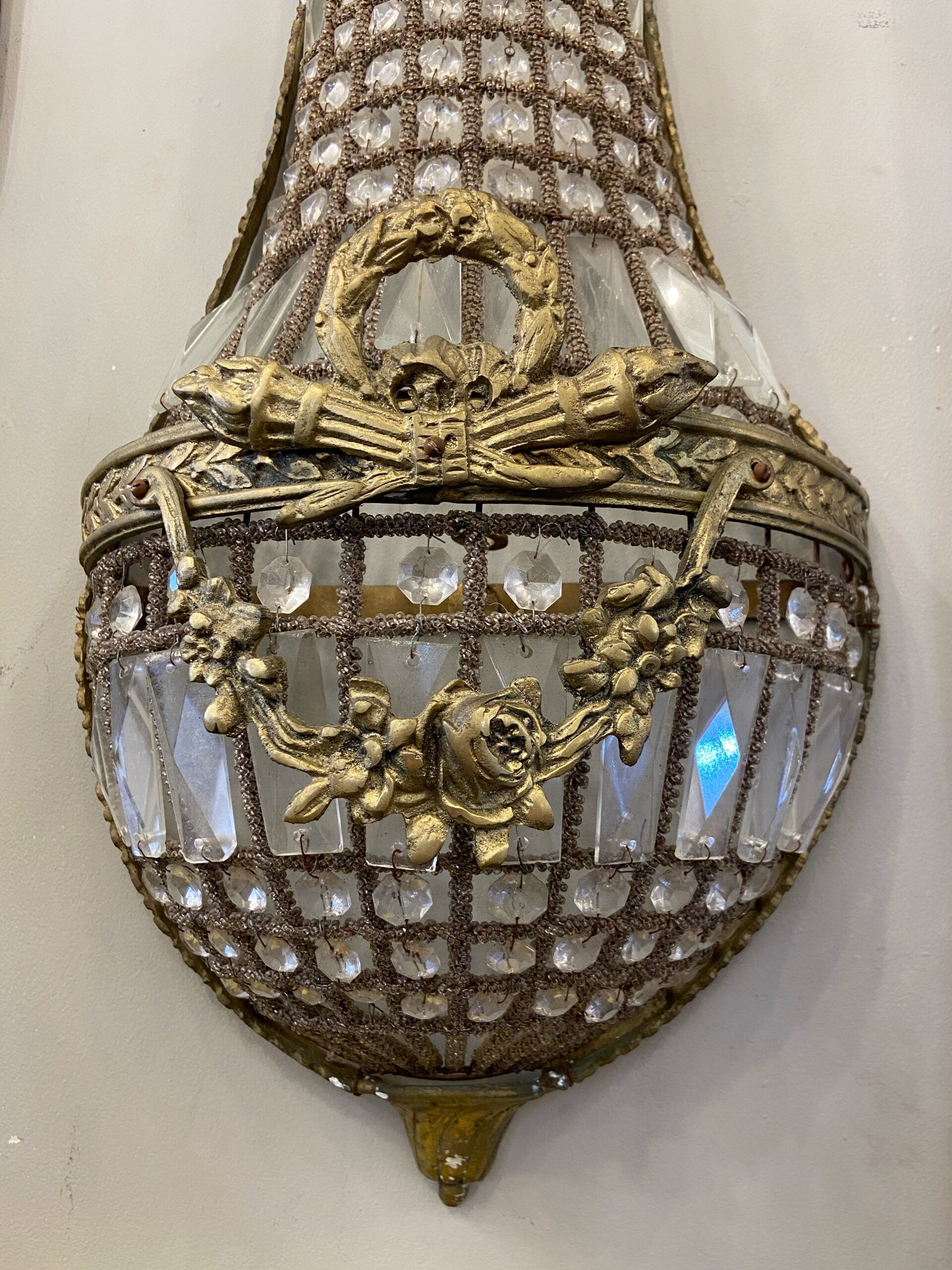 Elegant vintage crystal french empire wall sconce, featuring a teardrop-shaped basket design with faceted crystal beads and ornate gilded brass detailing.