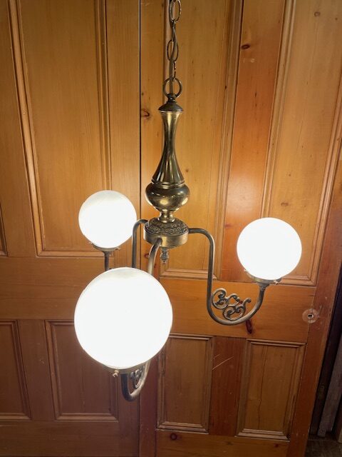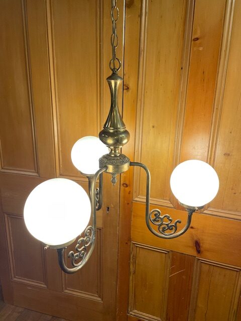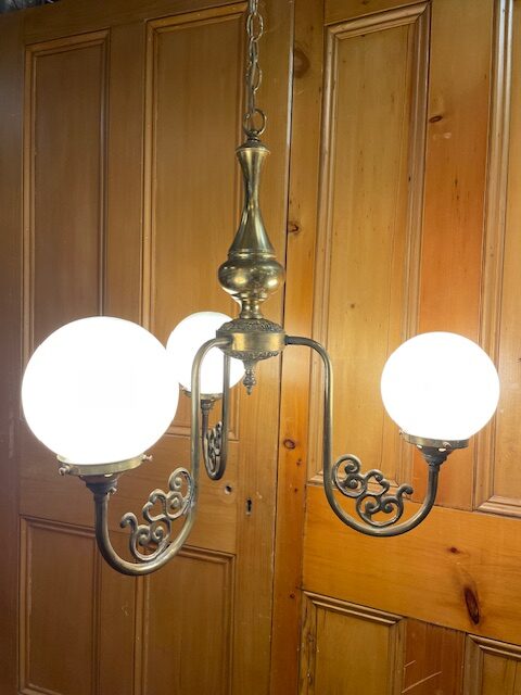 Elegant antique brass pendant light featuring three curved arms with ornate scrollwork and round opal glass globes. The fixture has a warm aged patina and hangs from a brass chain – a beautiful statement piece for period or vintage-inspired interiors.