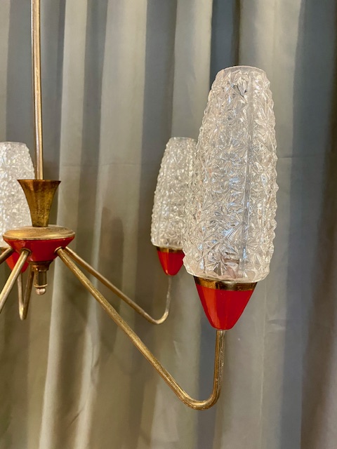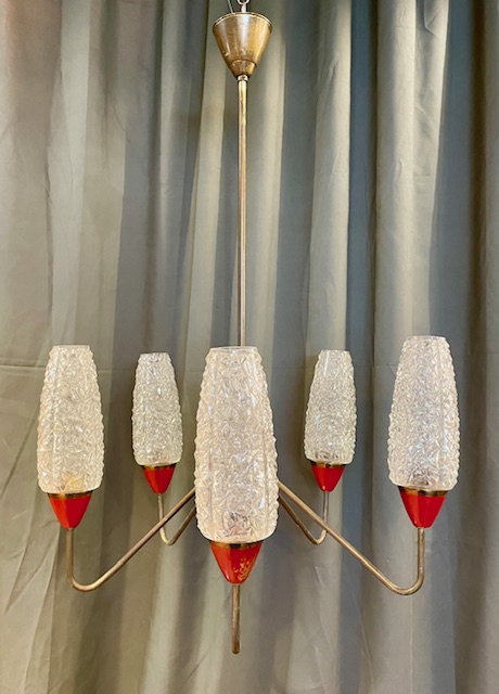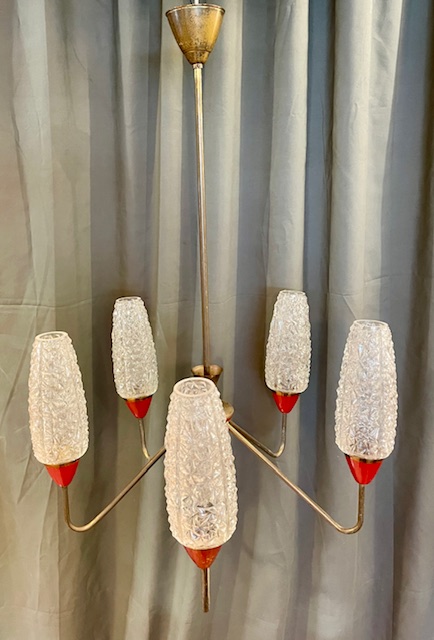This mid century brass pendant has five lights, each with diffused glass shades and red bottoms.