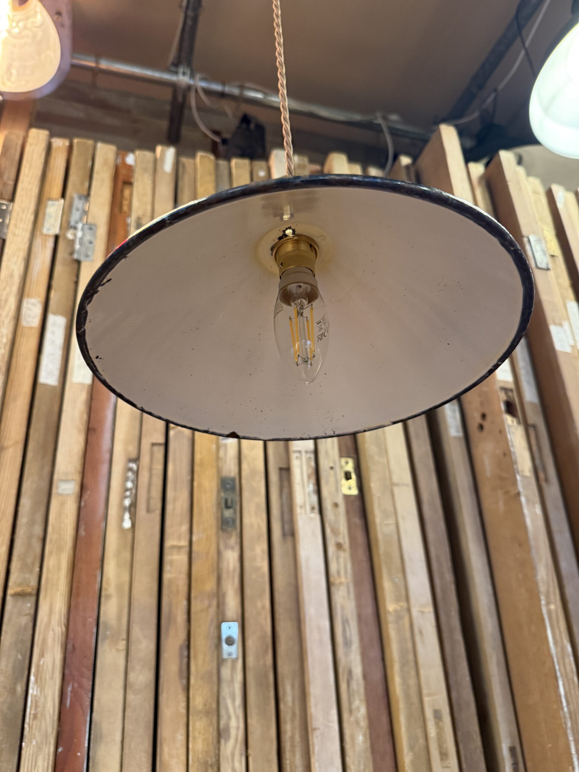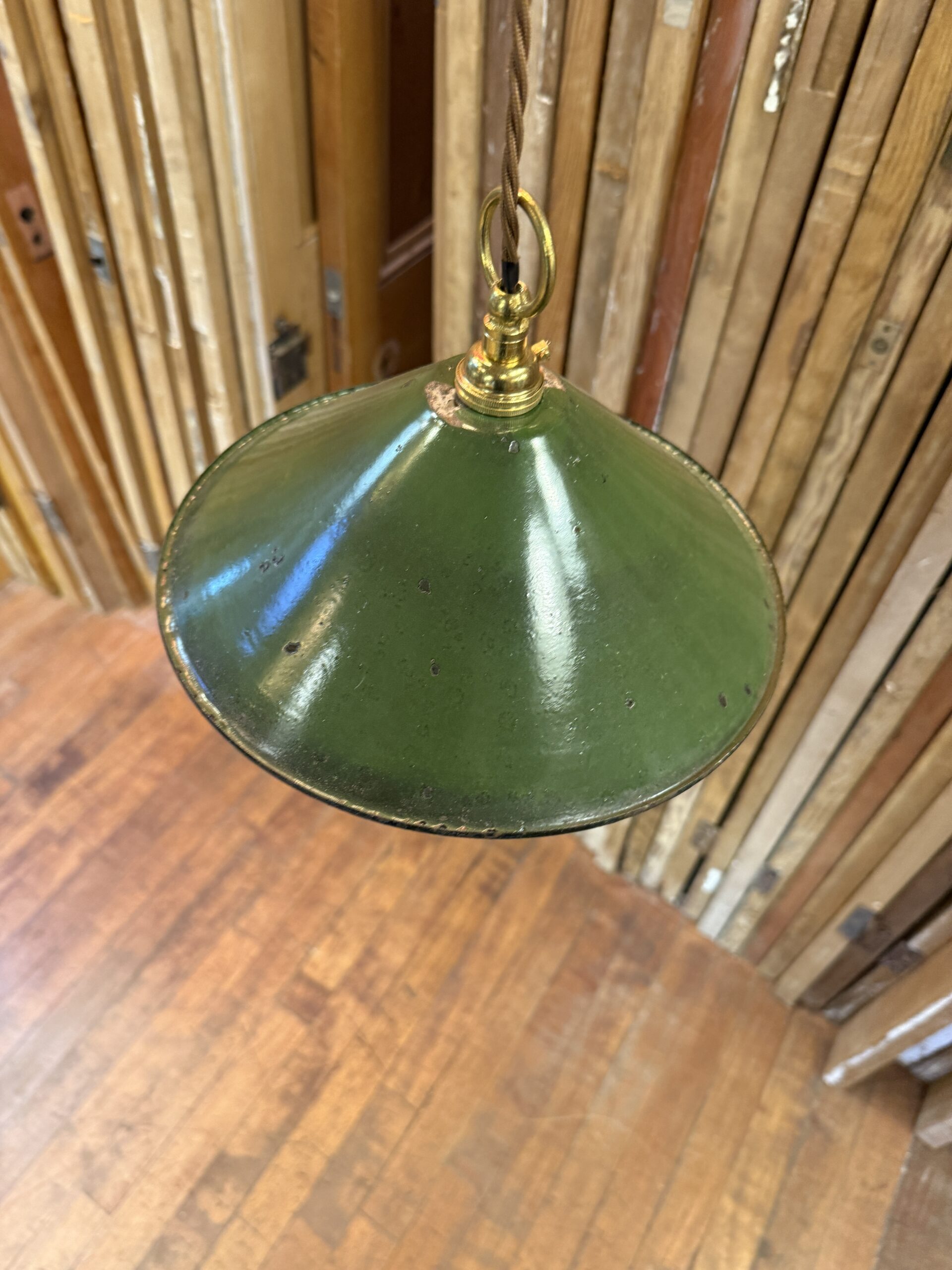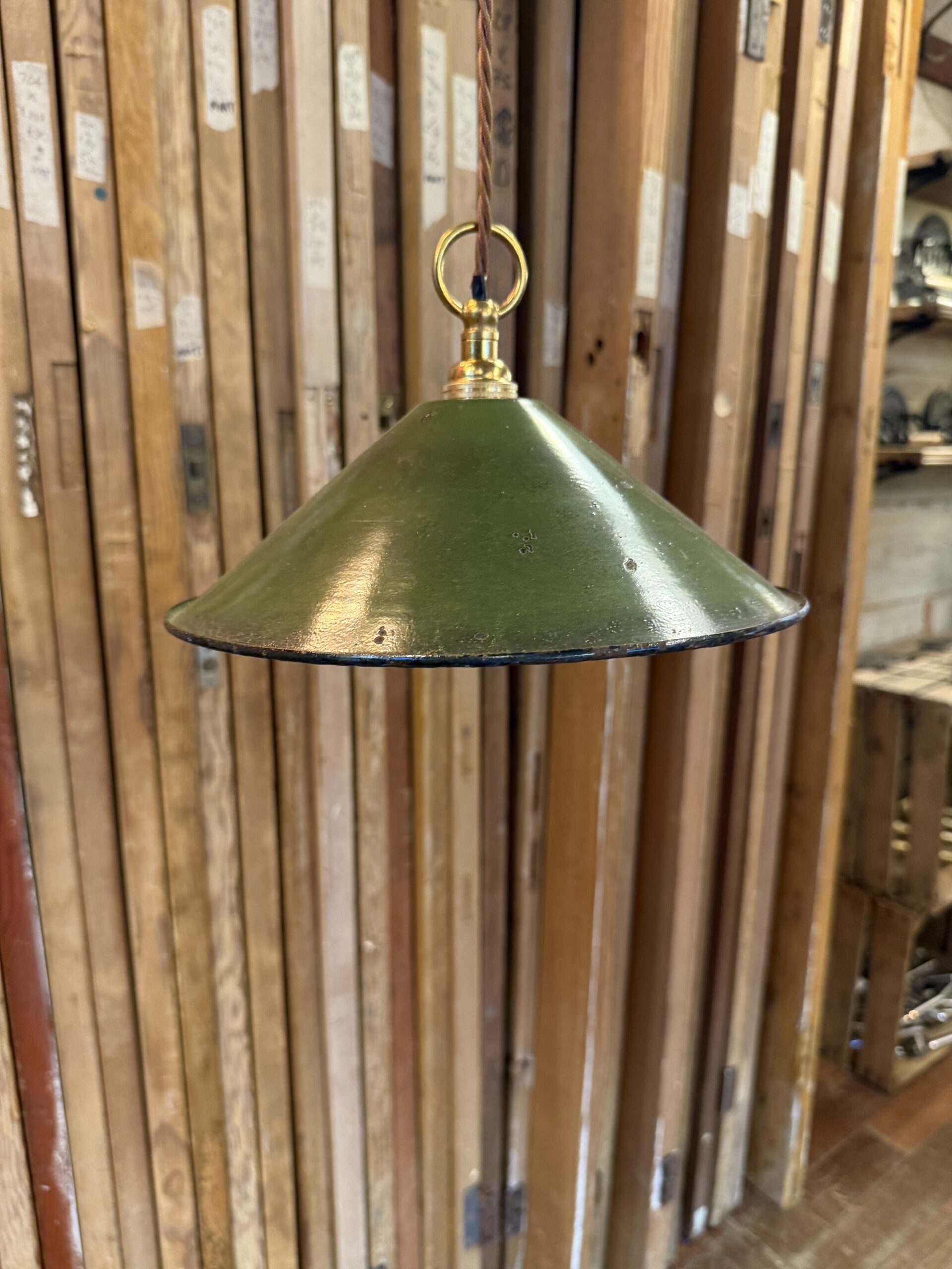 This mid-century, industrial pendant lamp features a green enamel shade with a cream underside. With brass fiittings and a twisted cord. The original wear and patina on the finish lend authentic character, ideal for vintage, rustic, or industrial-inspired interiors.