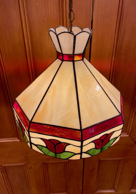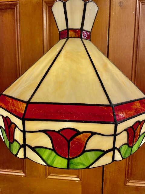 This beautiful Tiffany style stained glass pendant light has a floral design, with red and green coloured glass for the rose details which creates a warm glow.
