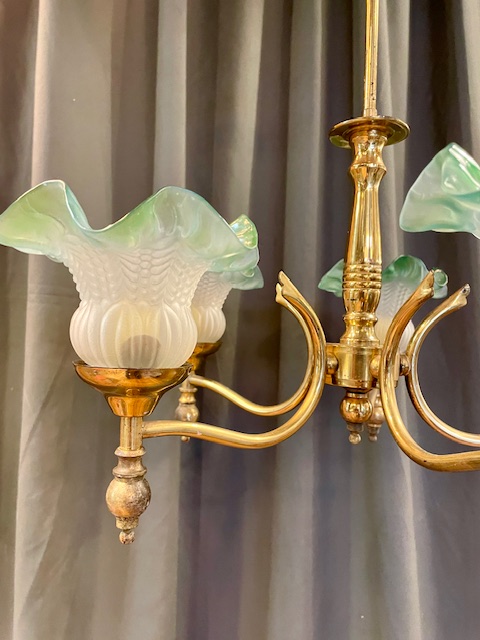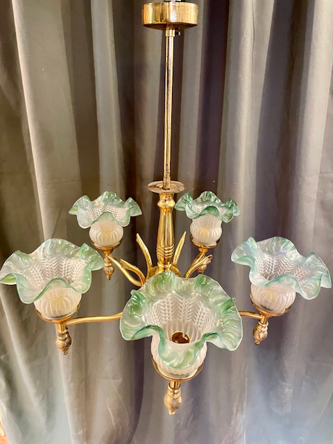 A beautiful Victorian brass pendant, with 5 lights, each with diffused moulded glass shades with green colored edges.