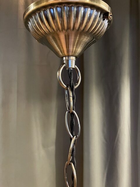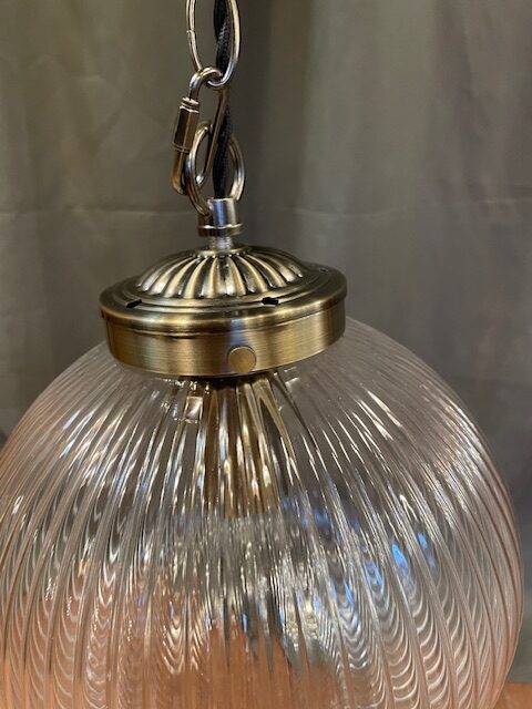 This beautiful vintage pendant features a ribbed glass globe with an antique brass cap and long chain.