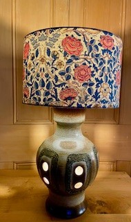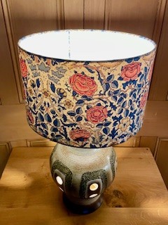 This West German Studio Pottery table lamp features a handcrafted ceramic base with glowing cutout accents and a bold floral fabric shade, reminicent of a William Morris pattern. The base emits a soft internal light, adding warm ambiance and retro character—perfect for a cozy corner or bedside table.