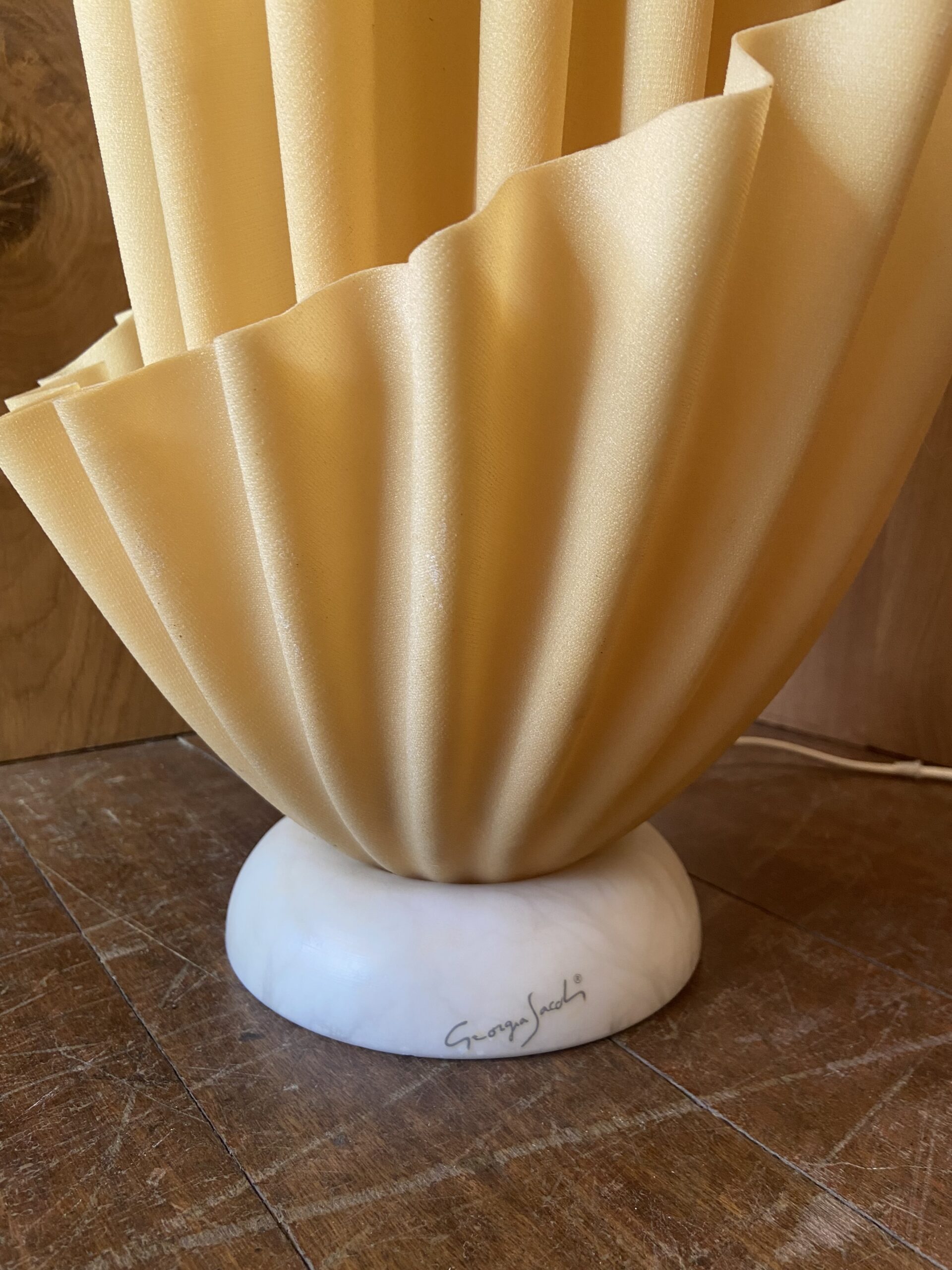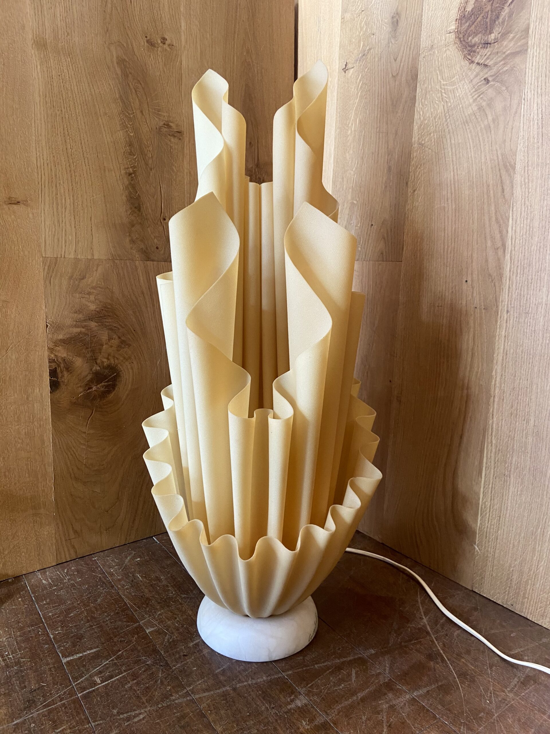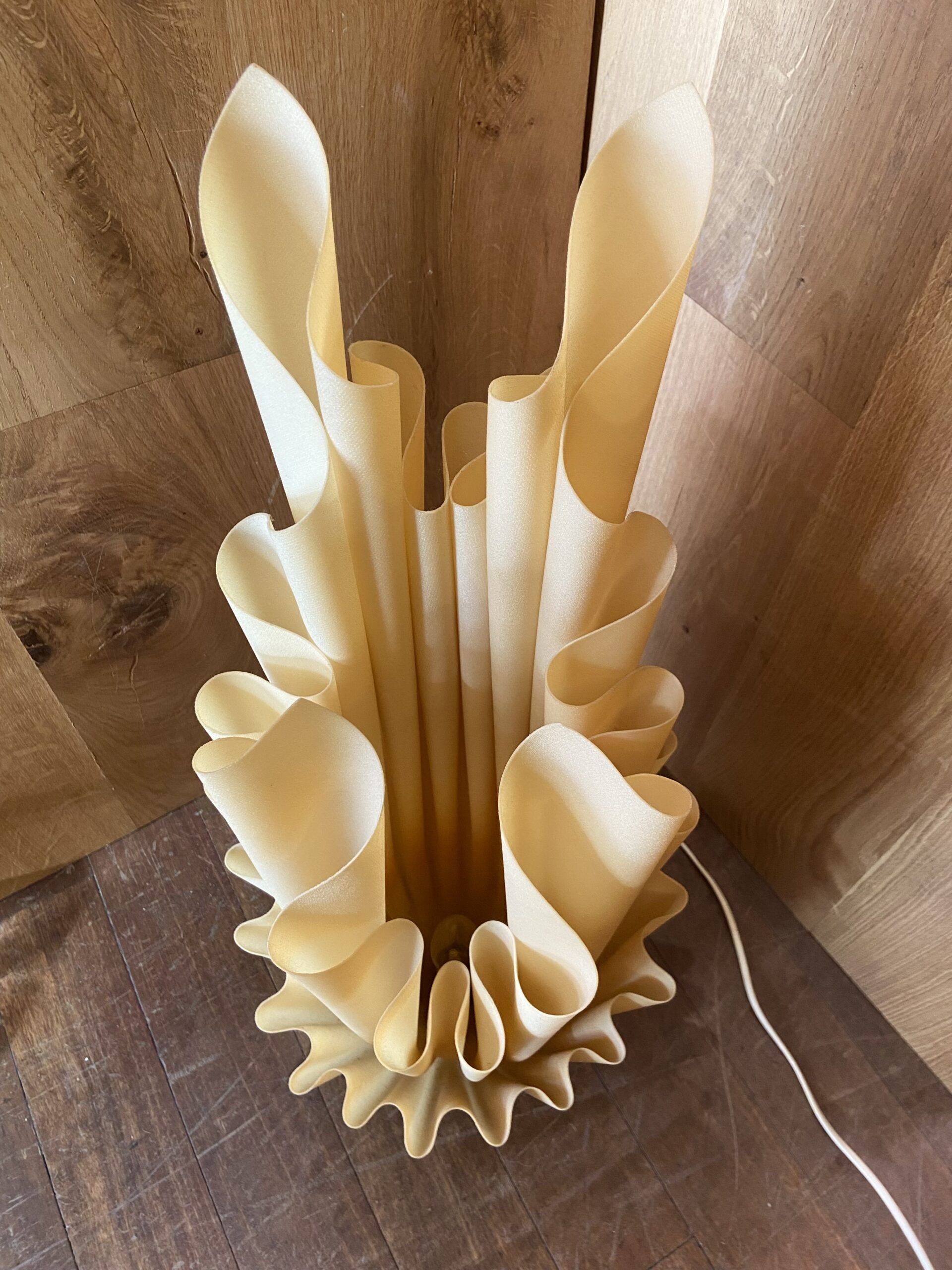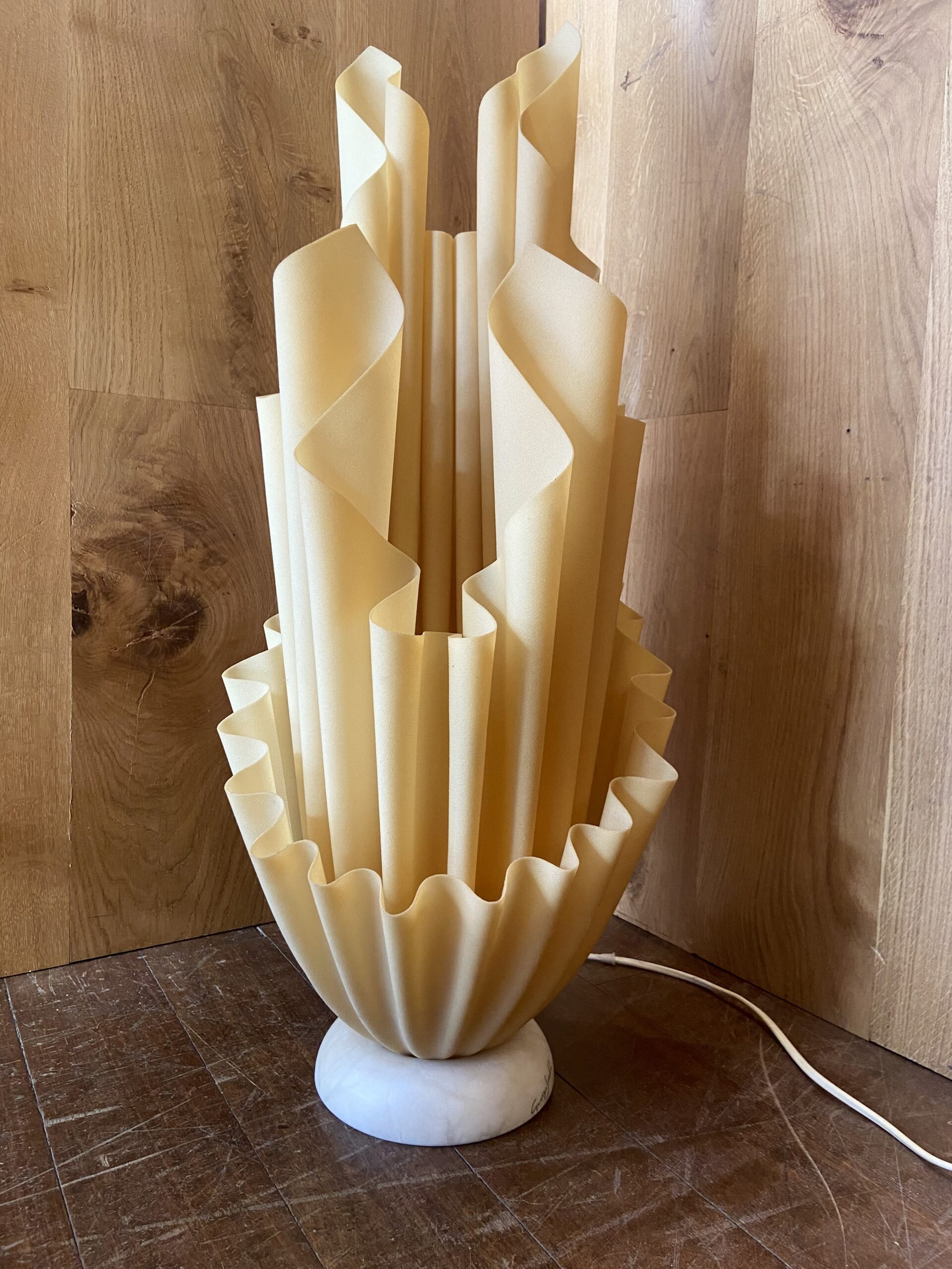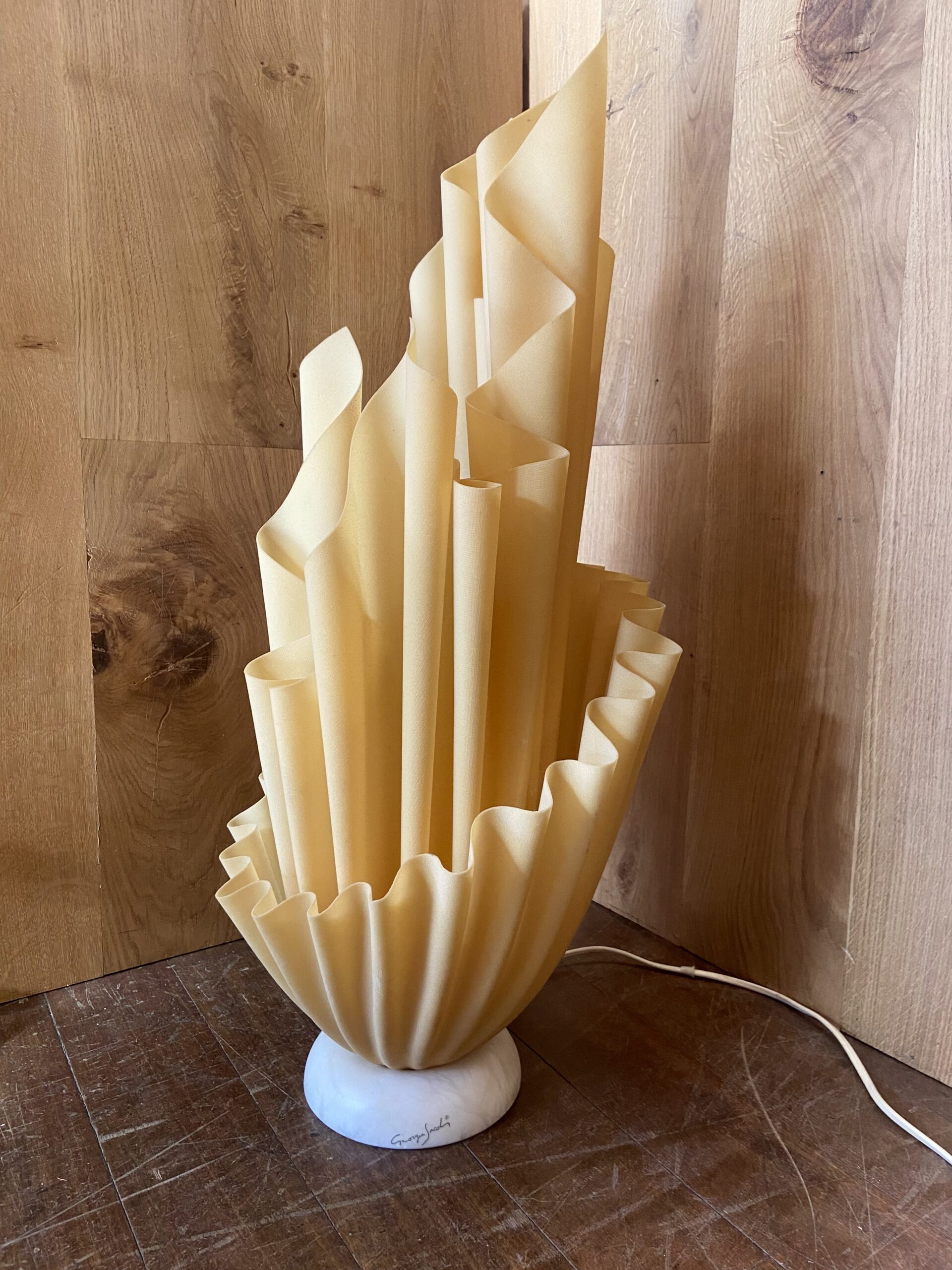 This spectacular French design lamp was created by Georgia Jacob. This piece comes from the Corolle series, one of many series where Jacob explored shape and form through the arrangement of drape, hence the term ‘hankerchief light’ for this beautiful lamp.