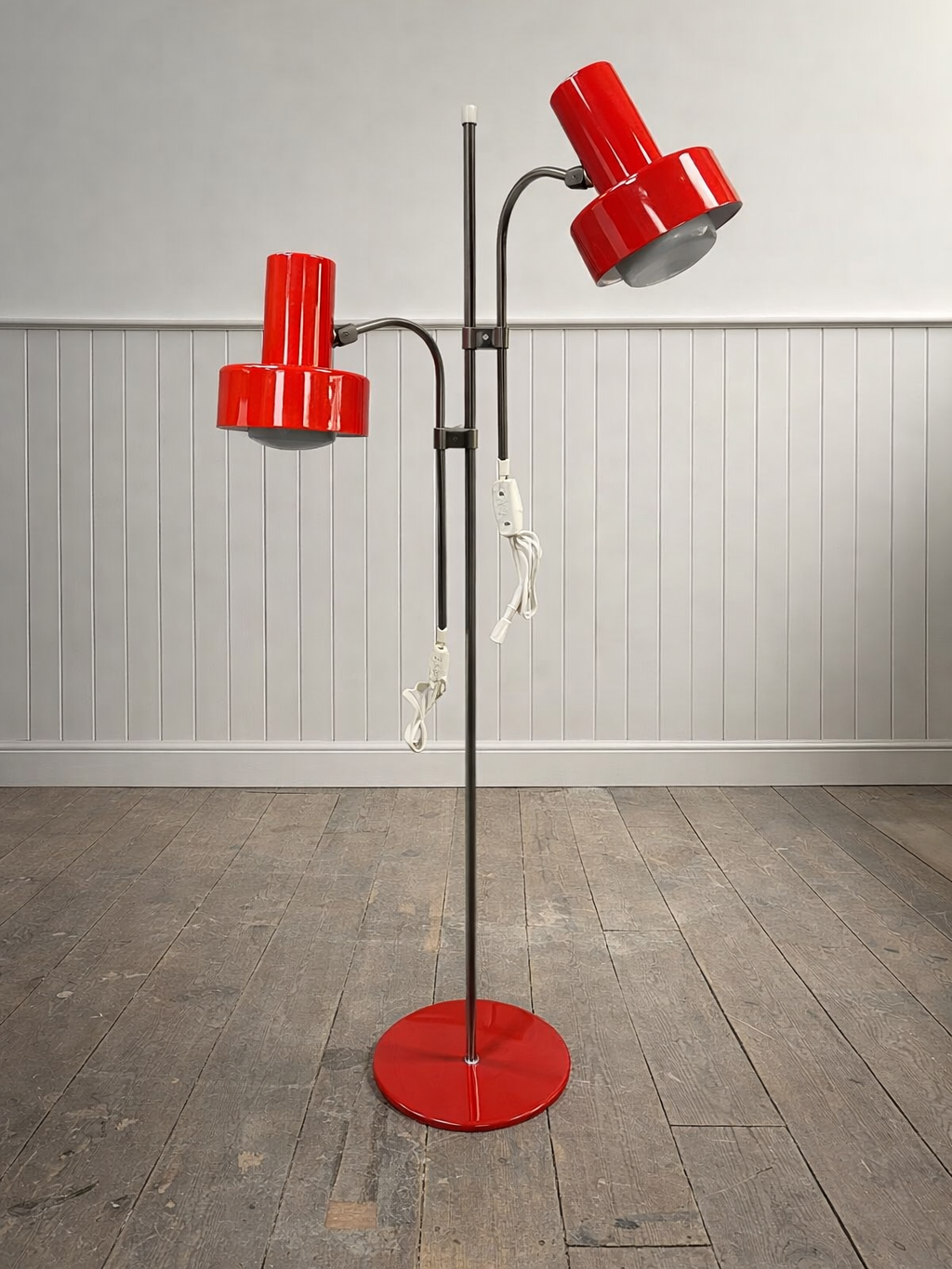 This is a fantastic mid century floor lamp, with double arms and shades, in a typical design attributed to Karl-Marx Stadt, circa 1970s. With a red enamel finish on the shades and base.