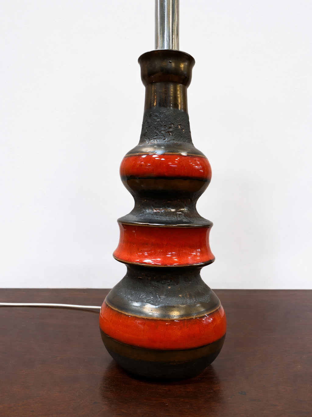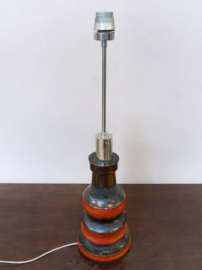This vintage ceramic table lamp base is a classic example of “Fat Lava” design, manufactured in West Germany during the 1960s or 1970s. It features a stacked, sculptural form, often refered to as a pogoda, in deep red and textured black.