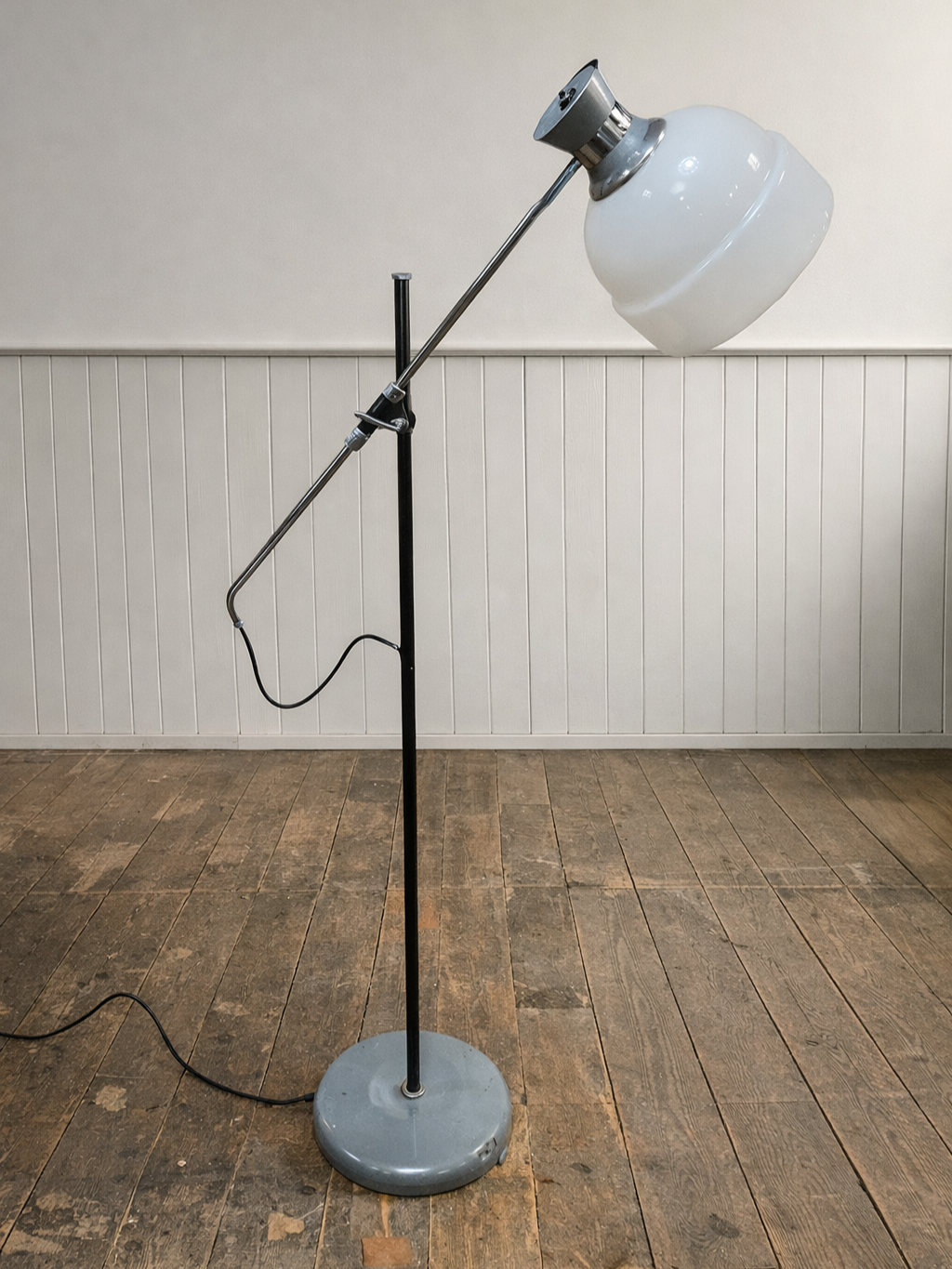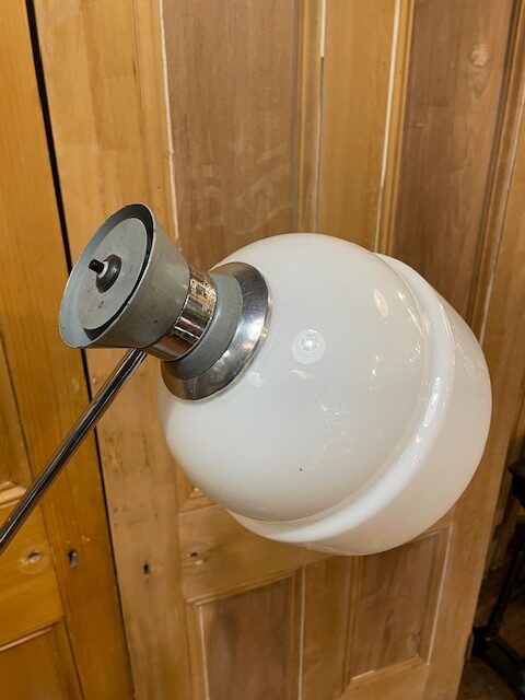 This mid century floor lamp has a chrome metal arm and base, with a white glass diffuser shade and a telescoping, adjustable arm that allows for precise positioning, a common trait in both designer home lighting and industrial task lamps.