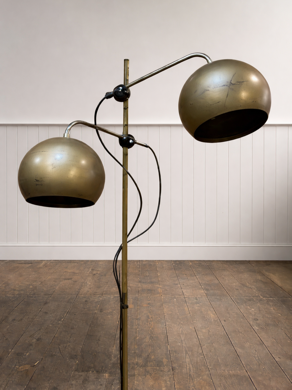 This is a Mid Century Floor Lamp, commonly attributed to manufacturer GEPO Amsterdam. Featuring a Space Age design with spherical ‘eyeball’ spotlights that are height-adjustable on a brass coloured stand. Fully rewired.