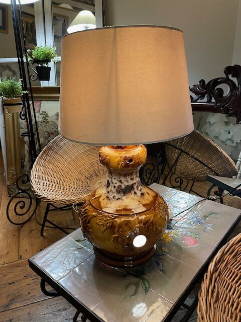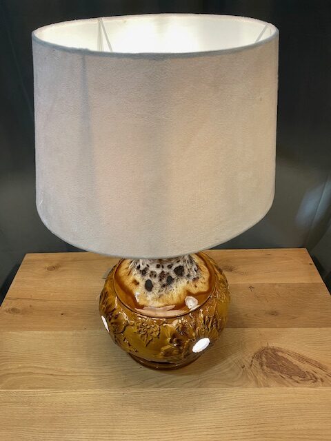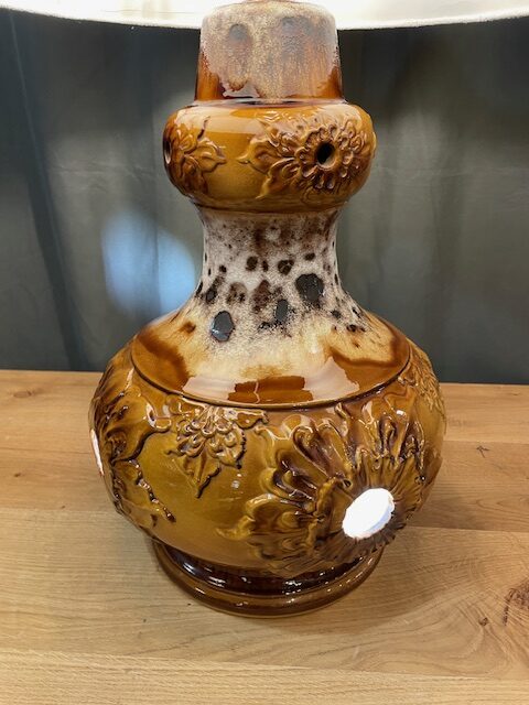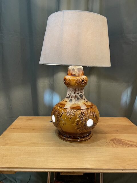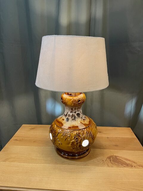 Beautiful vintage lamp featuring a glazed amber-brown ceramic base with textured floral details and a neutral beige fabric shade. Works perfectly and adds a warm, retro touch to any room.