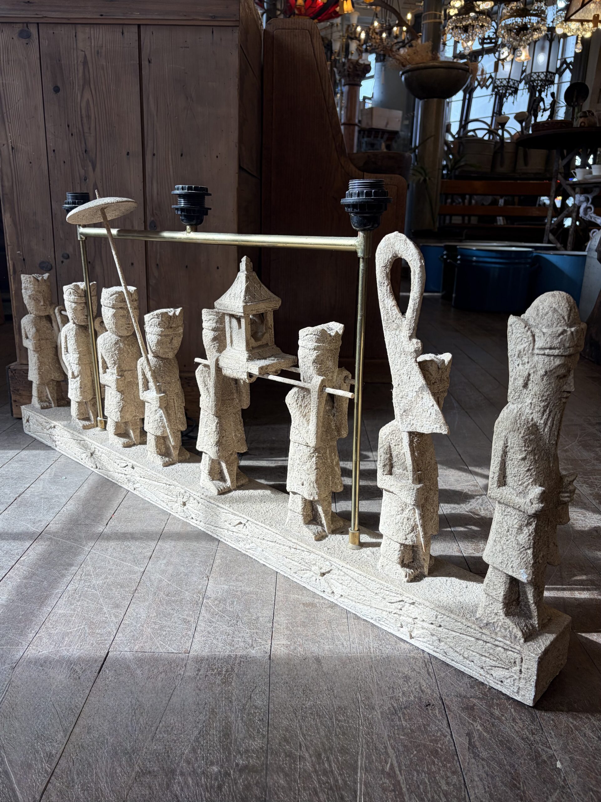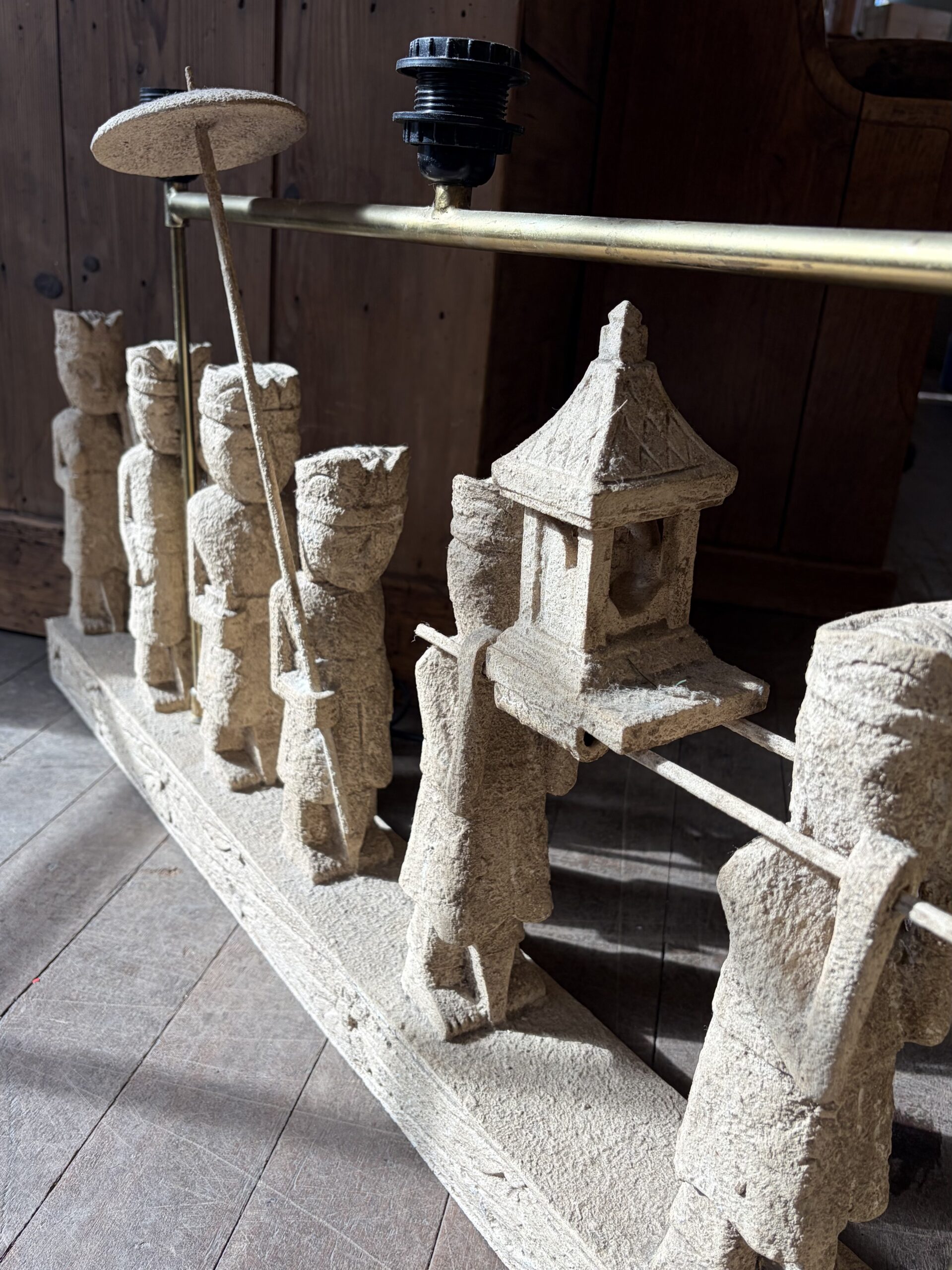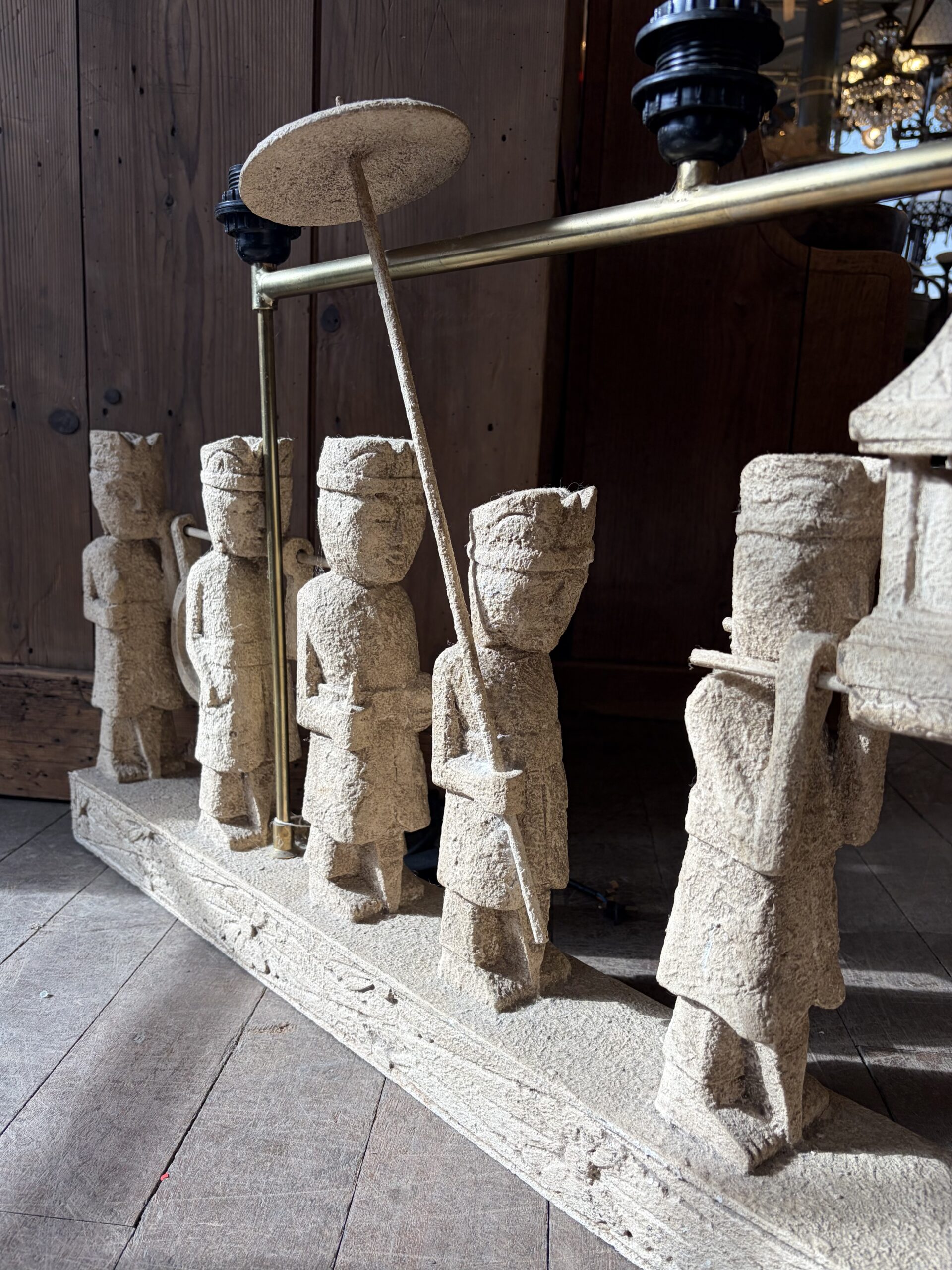 This sculptural light depicts a Balinese Melasti Ceremony, created with a stone effect finish. The piece has a brass-toned metal arm with fixtures for three bulbs. Melasti is a Hindu Balinese purification ritual leading up to Nyepi (the day of silence), where communities usually gather at beaches, carrying offerings and sacred items. The ceremony symbolizes cleansing of mind, body, and soul, in preparation for a spiritually pure Saka New Year.