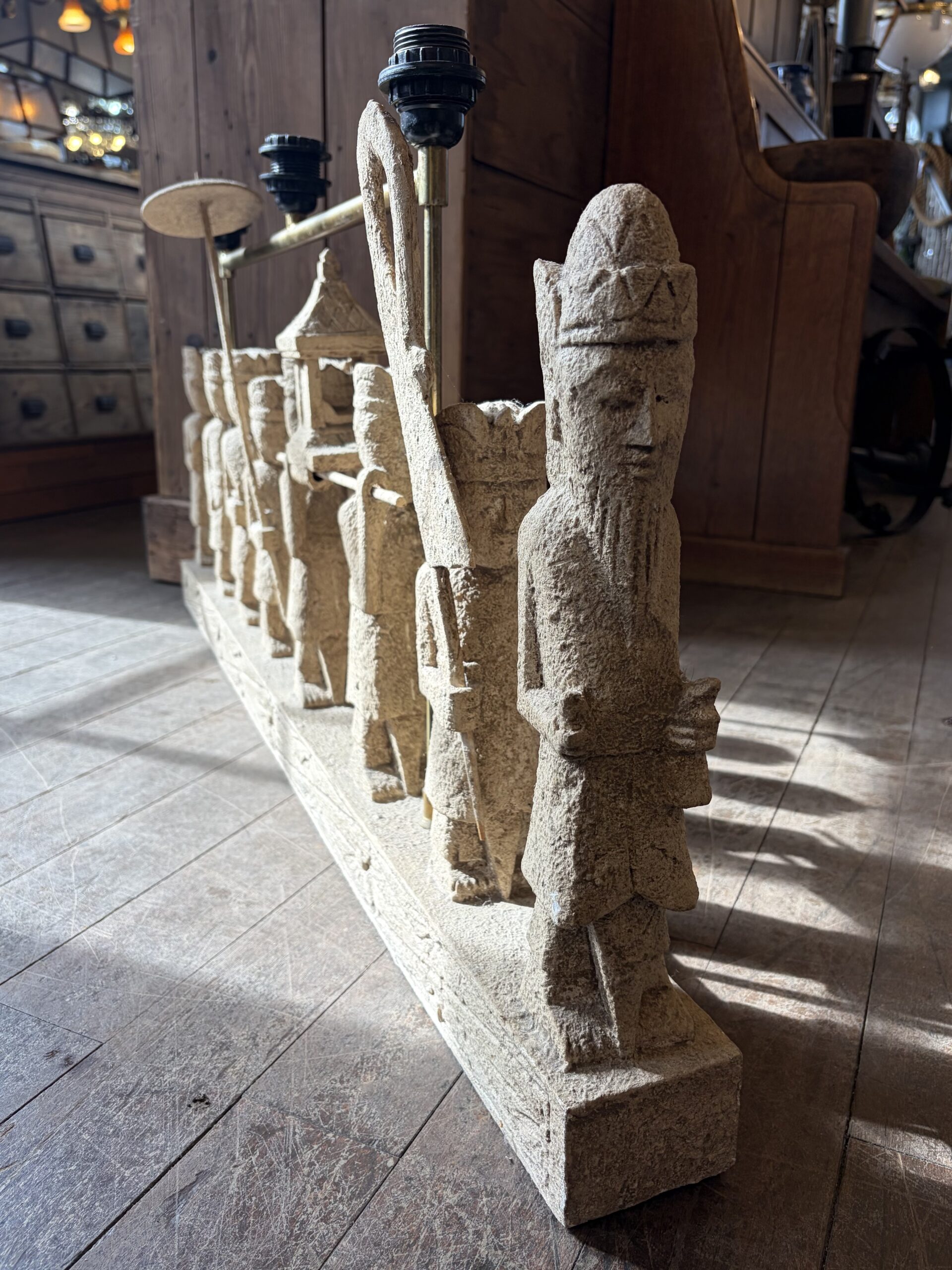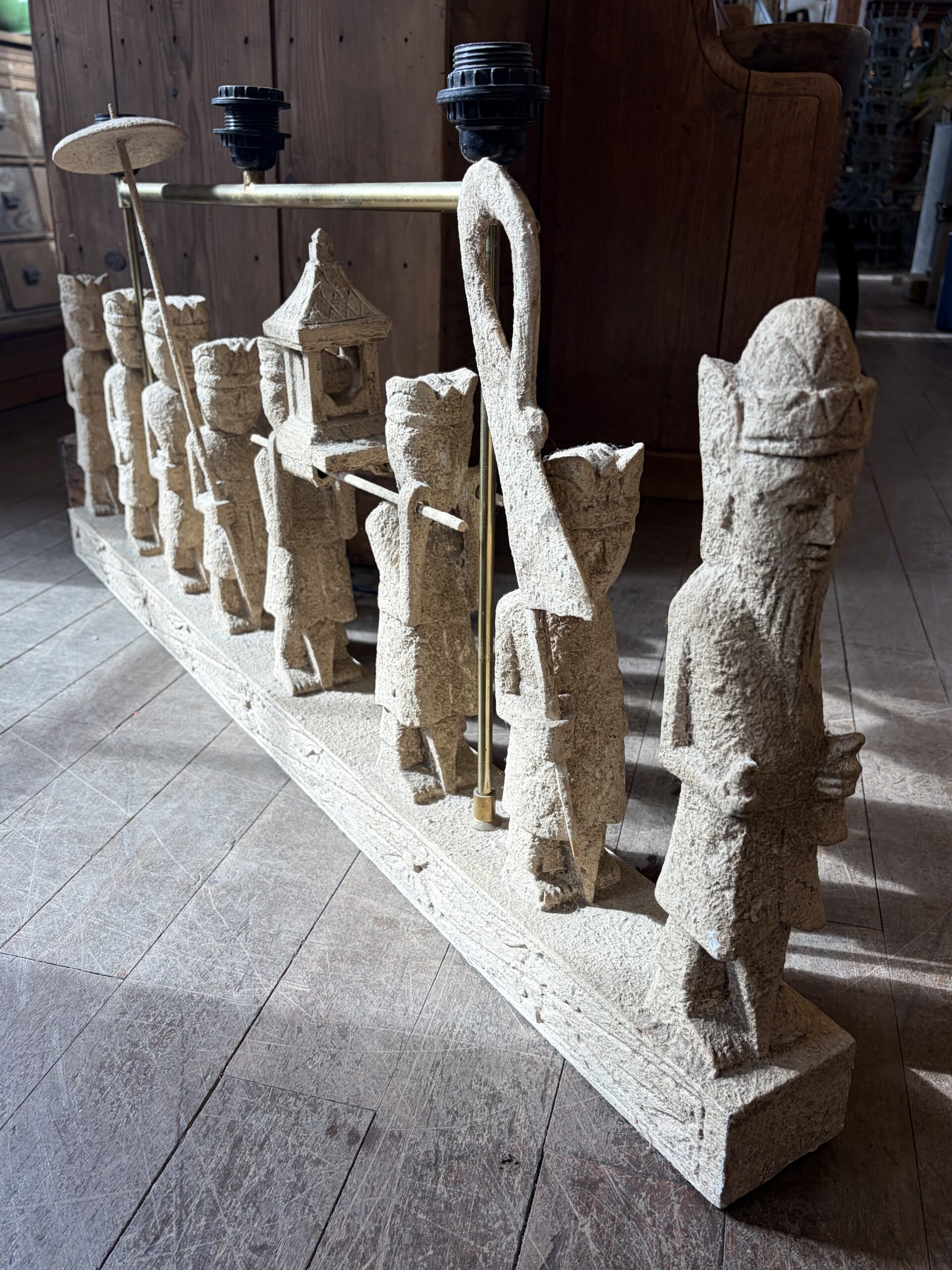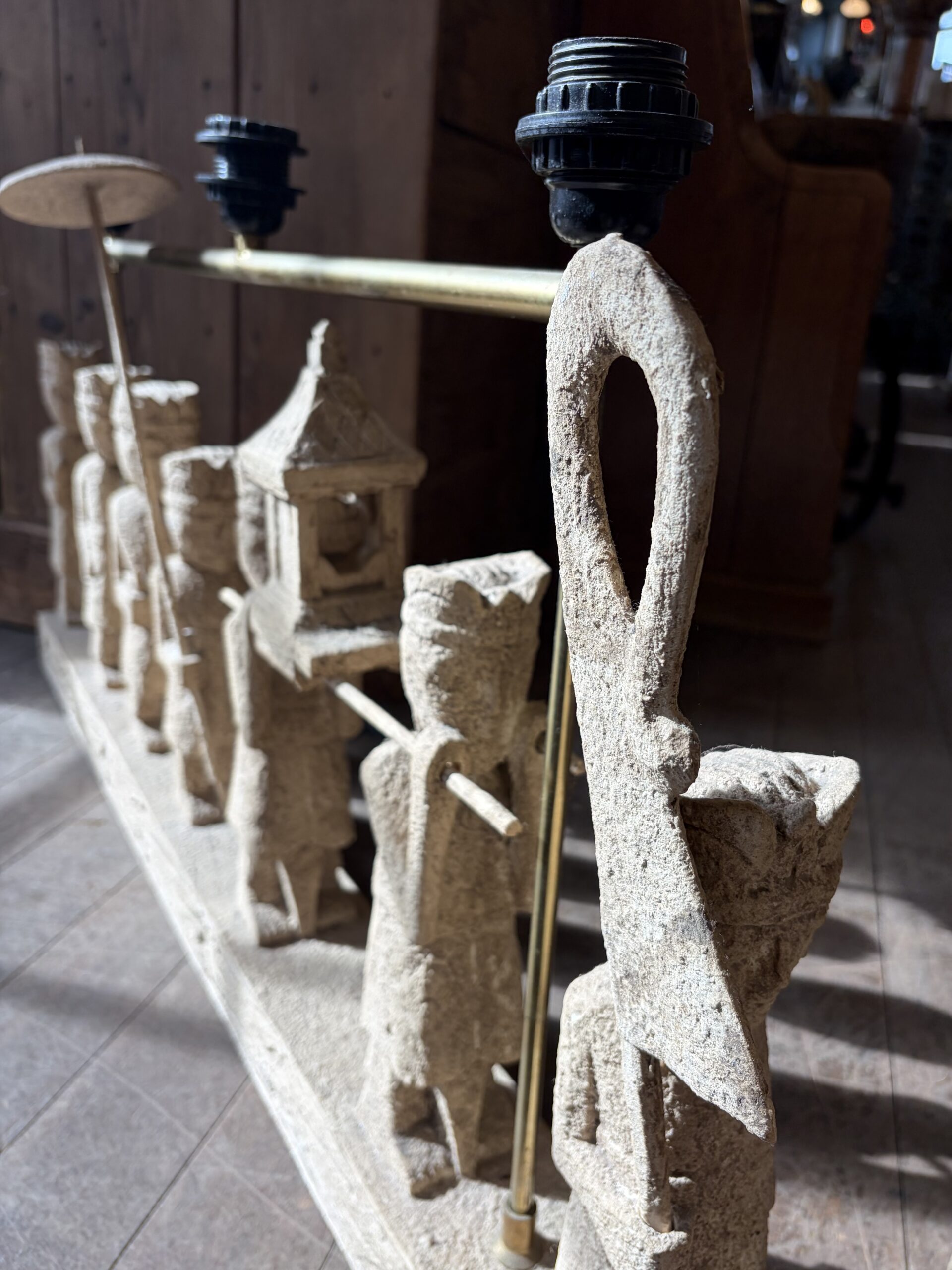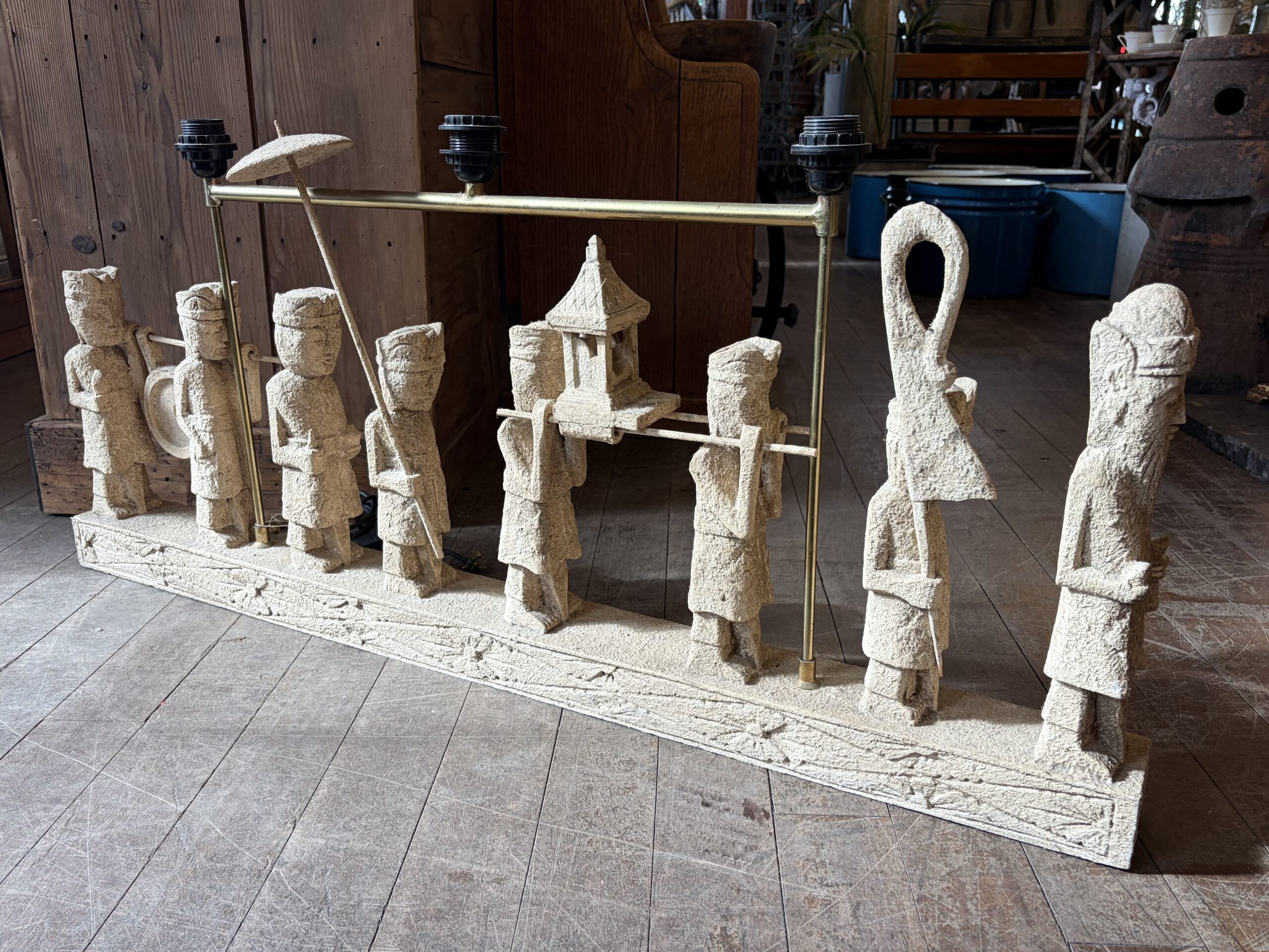 This sculptural light depicts a Balinese Melasti Ceremony, created with a stone effect finish. The piece has a brass-toned metal arm with fixtures for three bulbs. Melasti is a Hindu Balinese purification ritual leading up to Nyepi (the day of silence), where communities usually gather at beaches, carrying offerings and sacred items. The ceremony symbolizes cleansing of mind, body, and soul, in preparation for a spiritually pure Saka New Year.