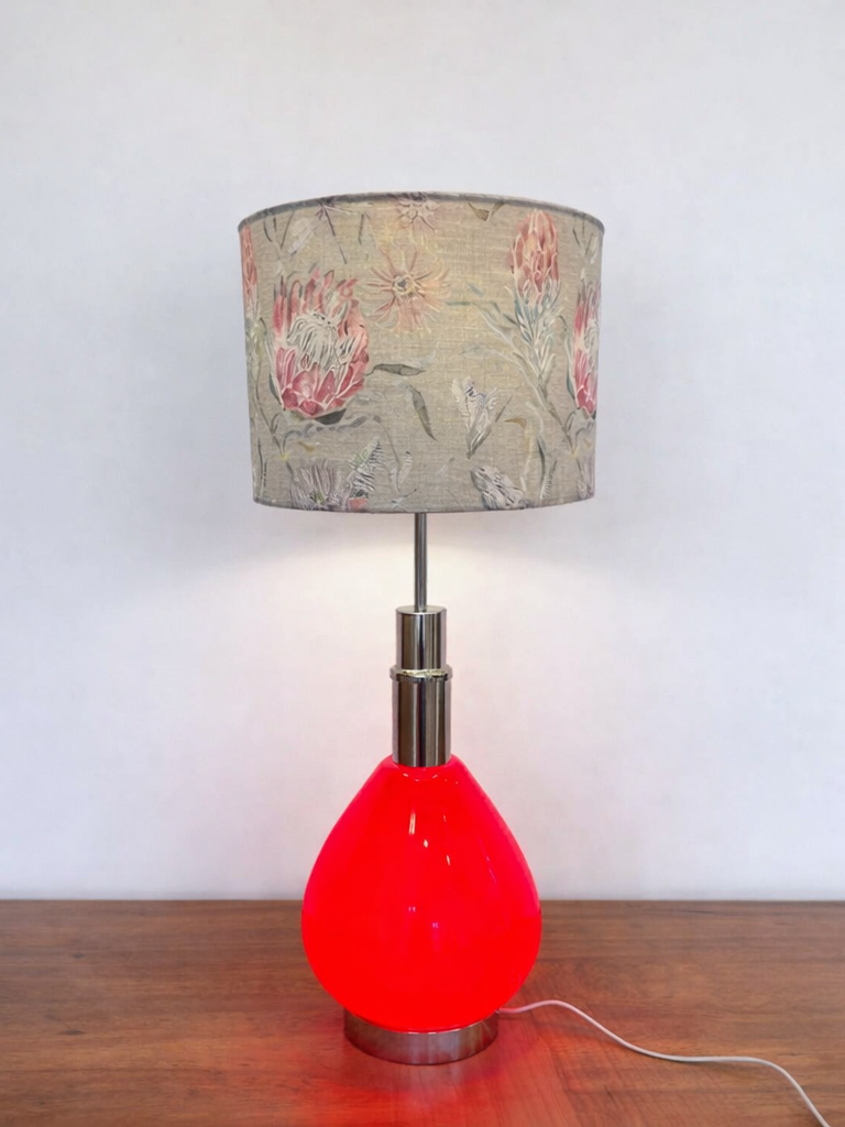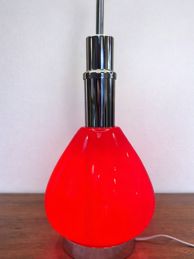 This is a vintage table lamp base featuring a red murano glass base with a chrome stem.