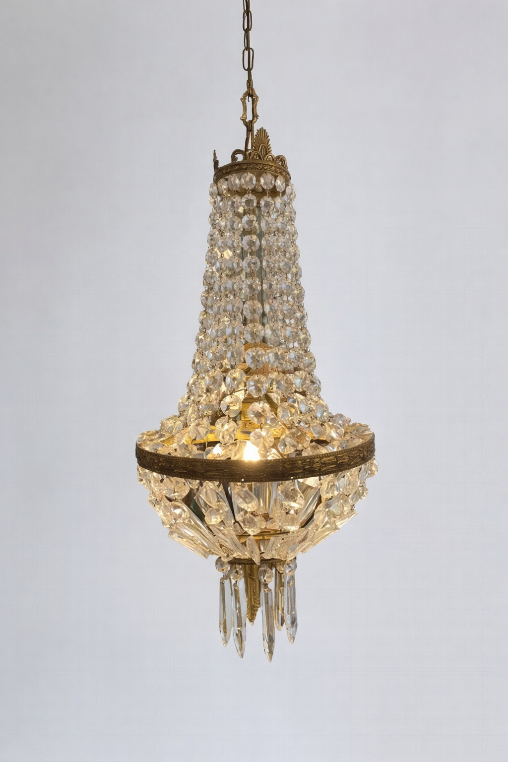 This an antique French chandelier featuring a brass frame adorned with numerous crystal glass beads and hanging prisms. The style is an empire or ‘tent and bag’ chandelier design, with crystal bead chains forming a basket shape.