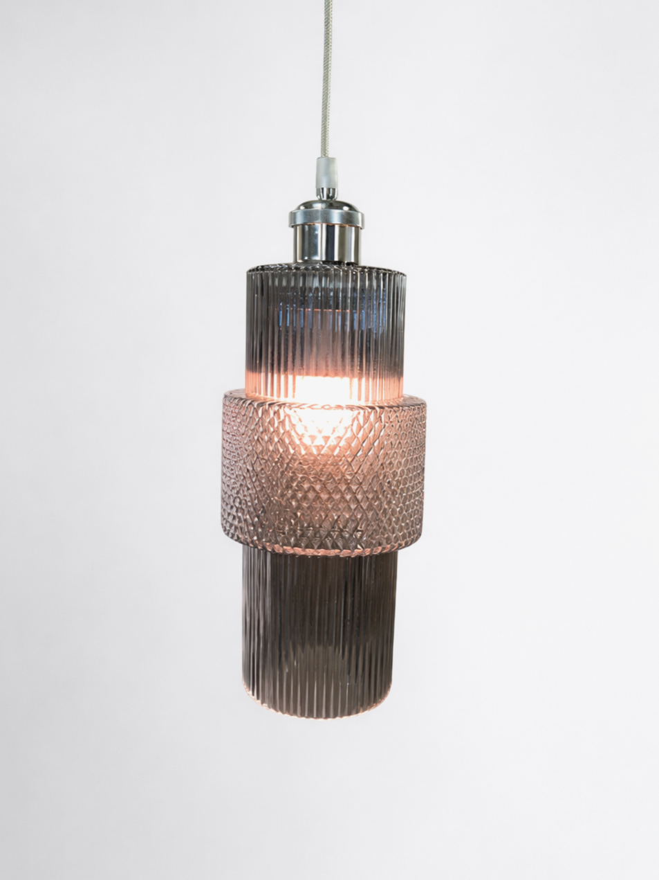 This is a contemporary ceiling pendant lamp featuring a cylindrical smoked grey glass shade with a ribbed and knurled texture. Featuring a textured, diamond-patterned middle band of clear glass, between two vertically ribbed fluted glass sections.