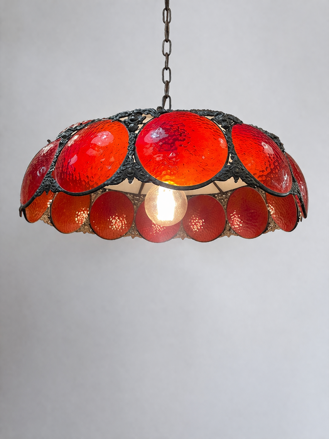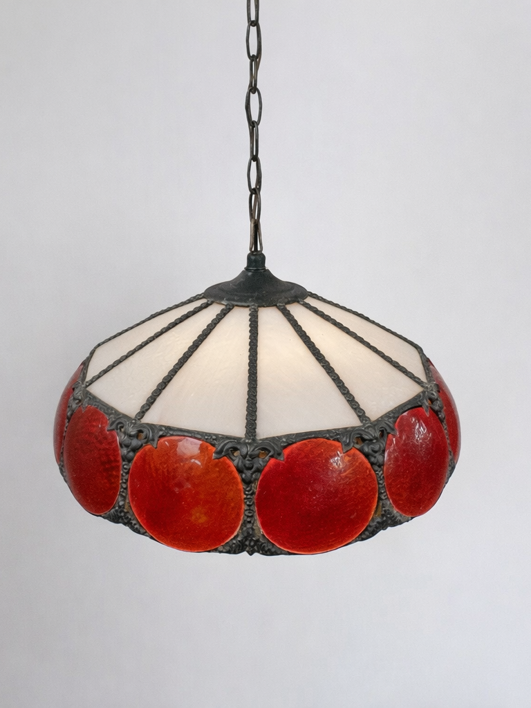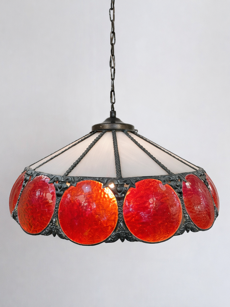 This is a vintage, Tiffany stained glass pendant lamp featuring red textured glass discs and a white paneled shade. With intricate copper metal detailing.