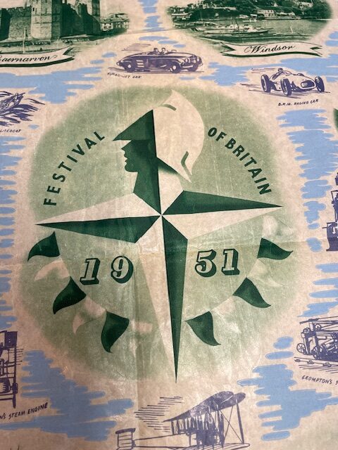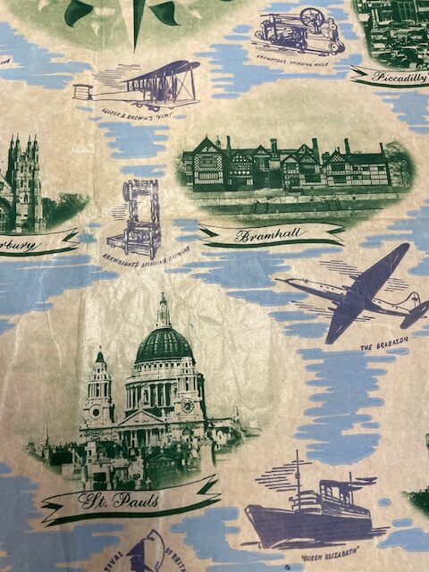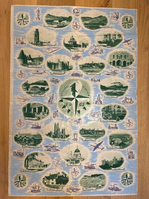 This vintage poster features illustrations of landmarks and iconic things relating to Britain, in blue and green colours. A rare original poster commemorating the 1951 Festival of Britain, South Bank Exhibition. It features historical landmarks, transport and engineering design relating to Britain.