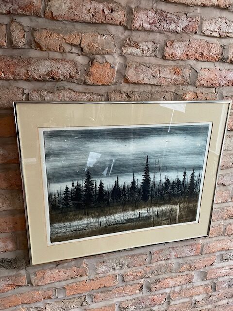 This is a framed limited edition print of an etching by the artist Anthony Dimitrov (Canadian, b. 1928). The artwork is titled ‘Northern Lake’ and this is number 74 of an edition run of 120. The prints were made in 1979.