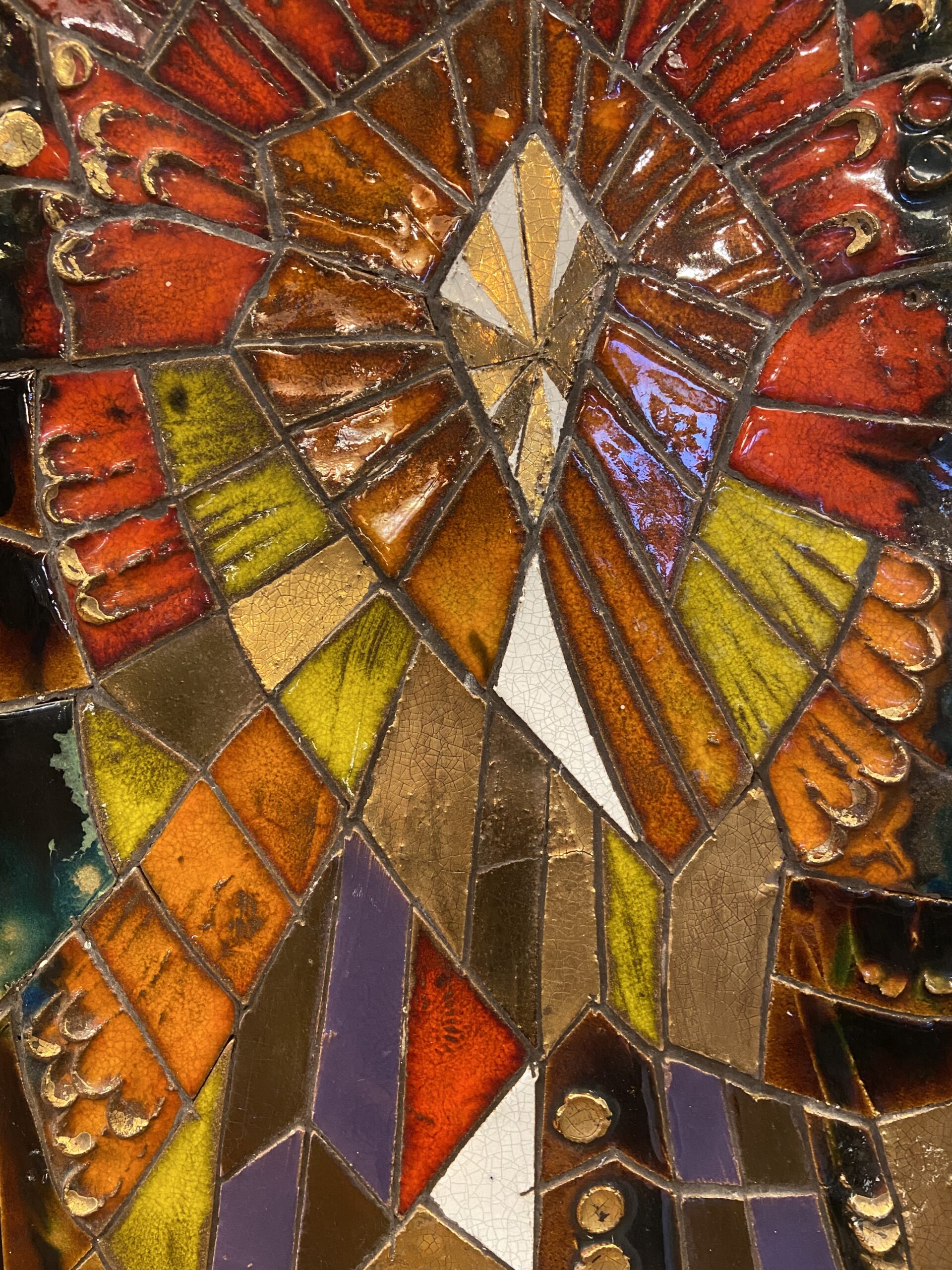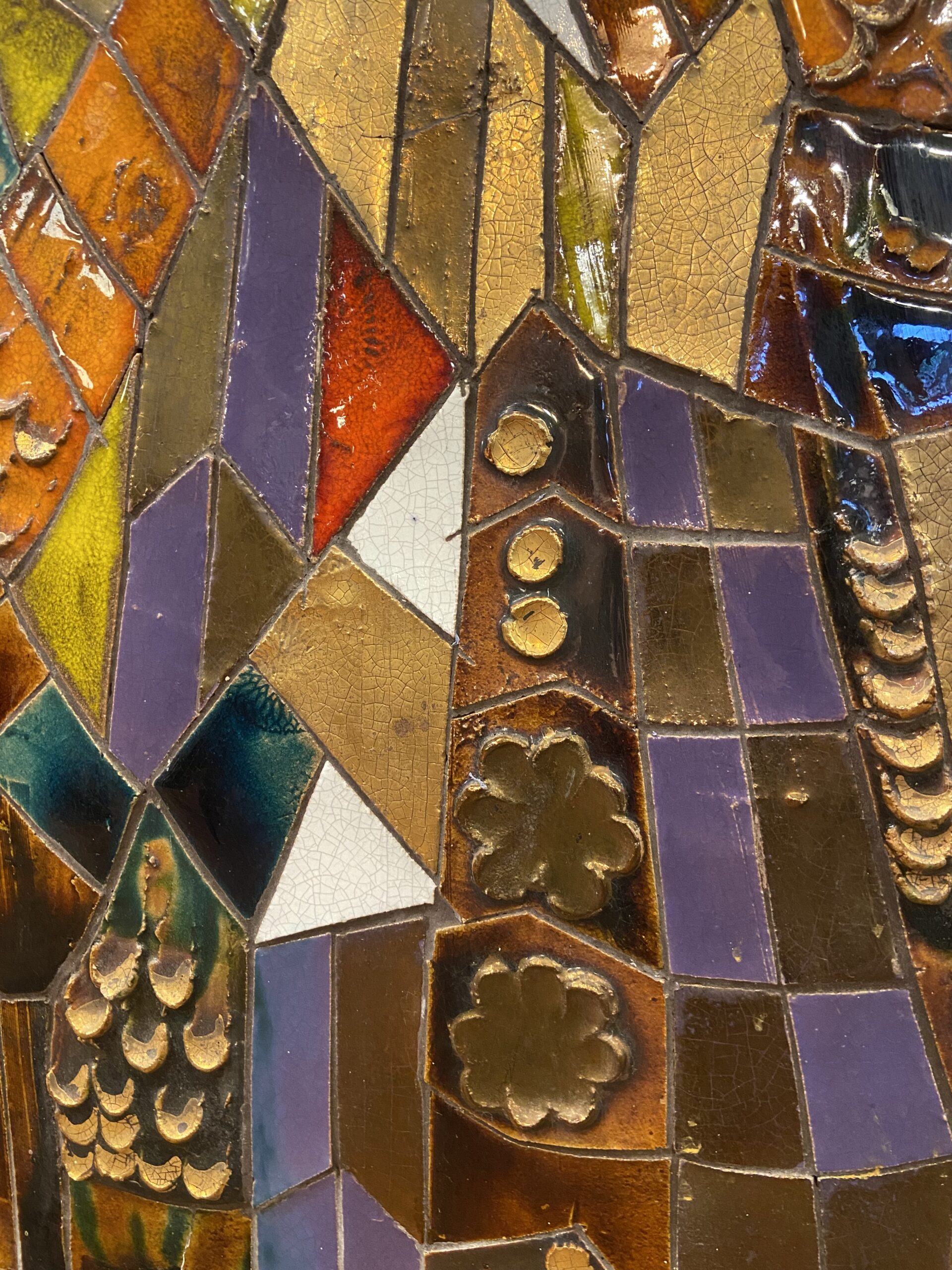 This is a fabulous piece by a world leading ceramic, artist Jean Powell (1927-2019), featuring moasic tile pieces in bright coloured glazes and gilt detail.