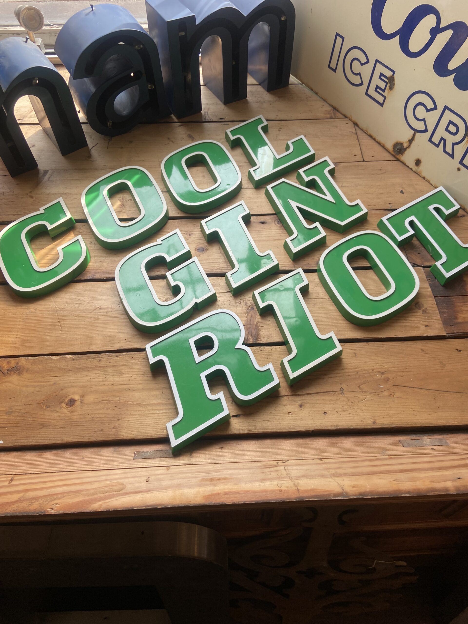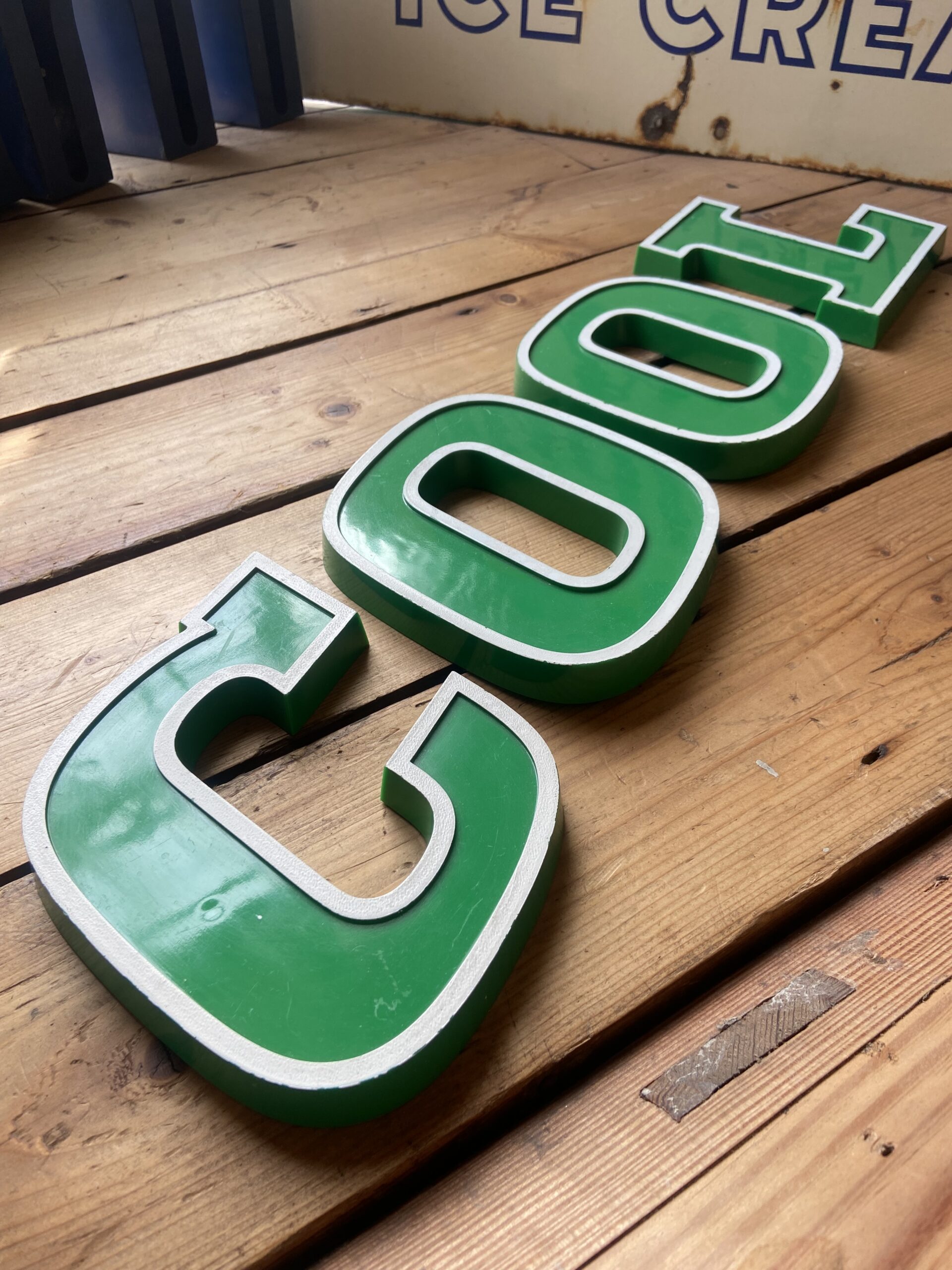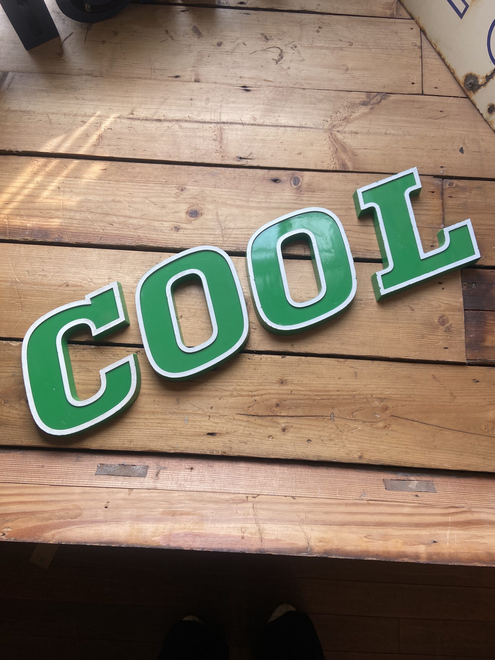 Fun vintage lettering, spelling ‘Cool’ in a bright green with white trim edge. This would make a fabulous wall decoration.