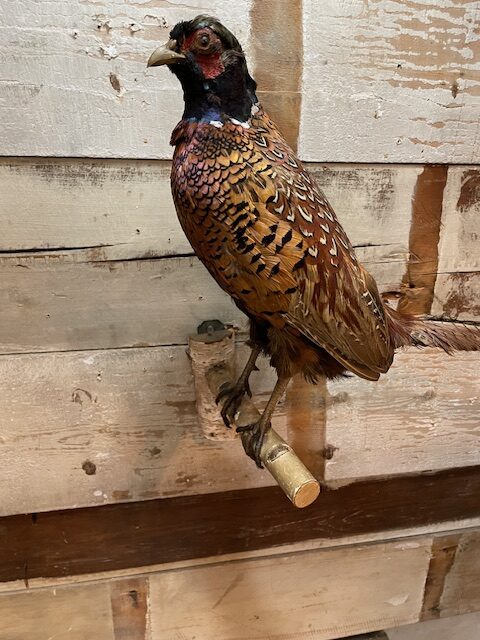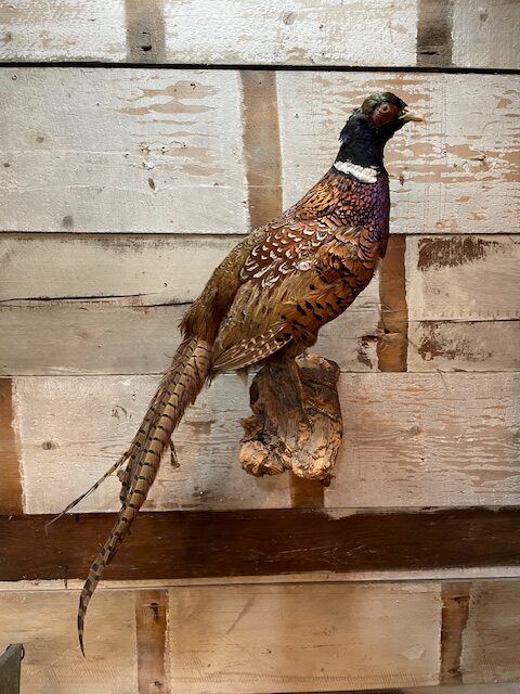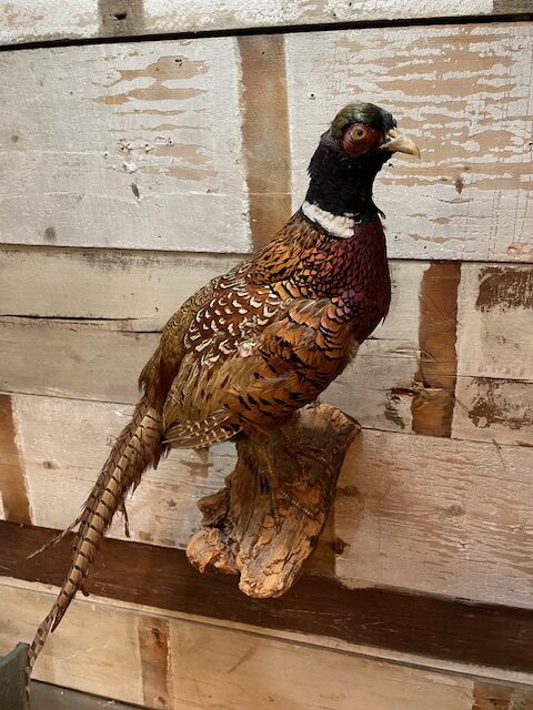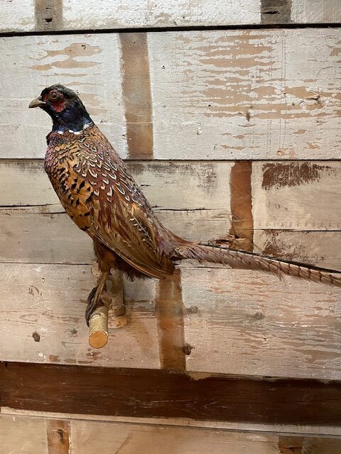 This is a vintage, mid-century taxidermy Pheasant, mounted on a wooden branch so that is can be displayed on a wall.