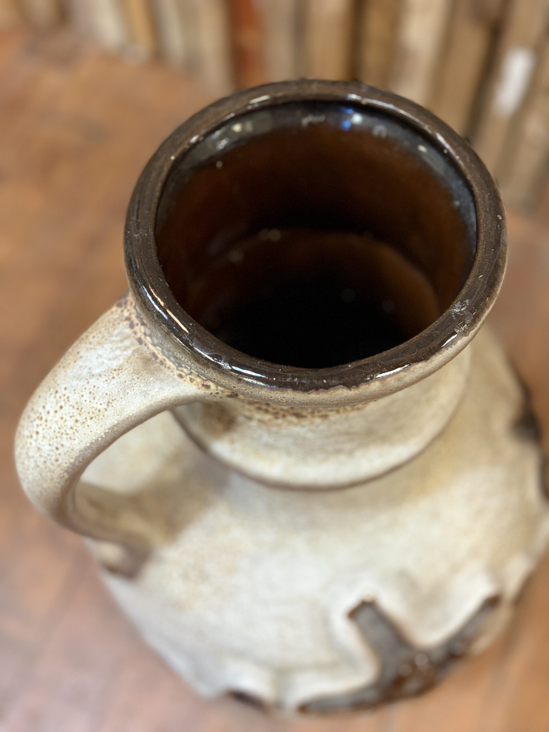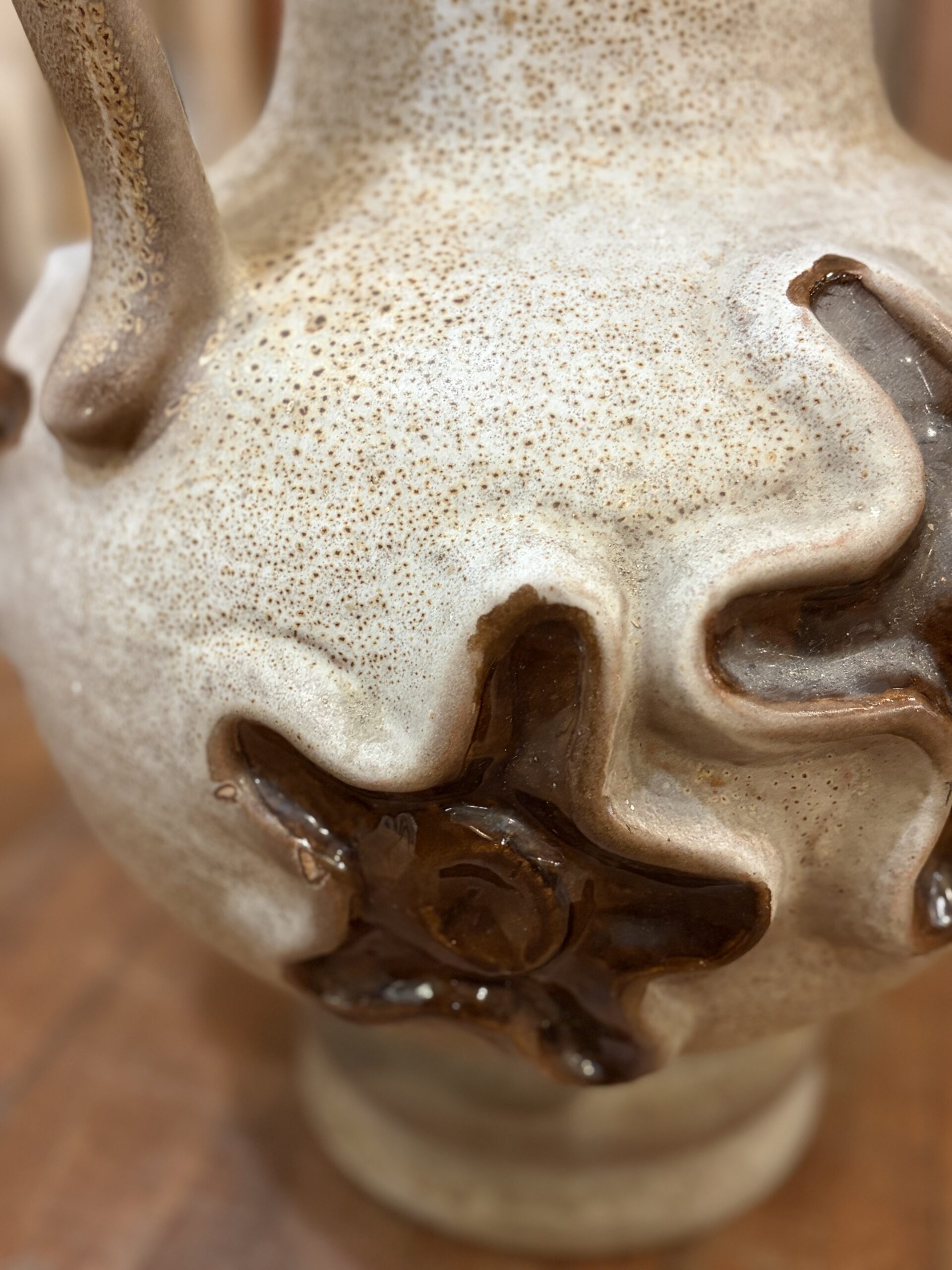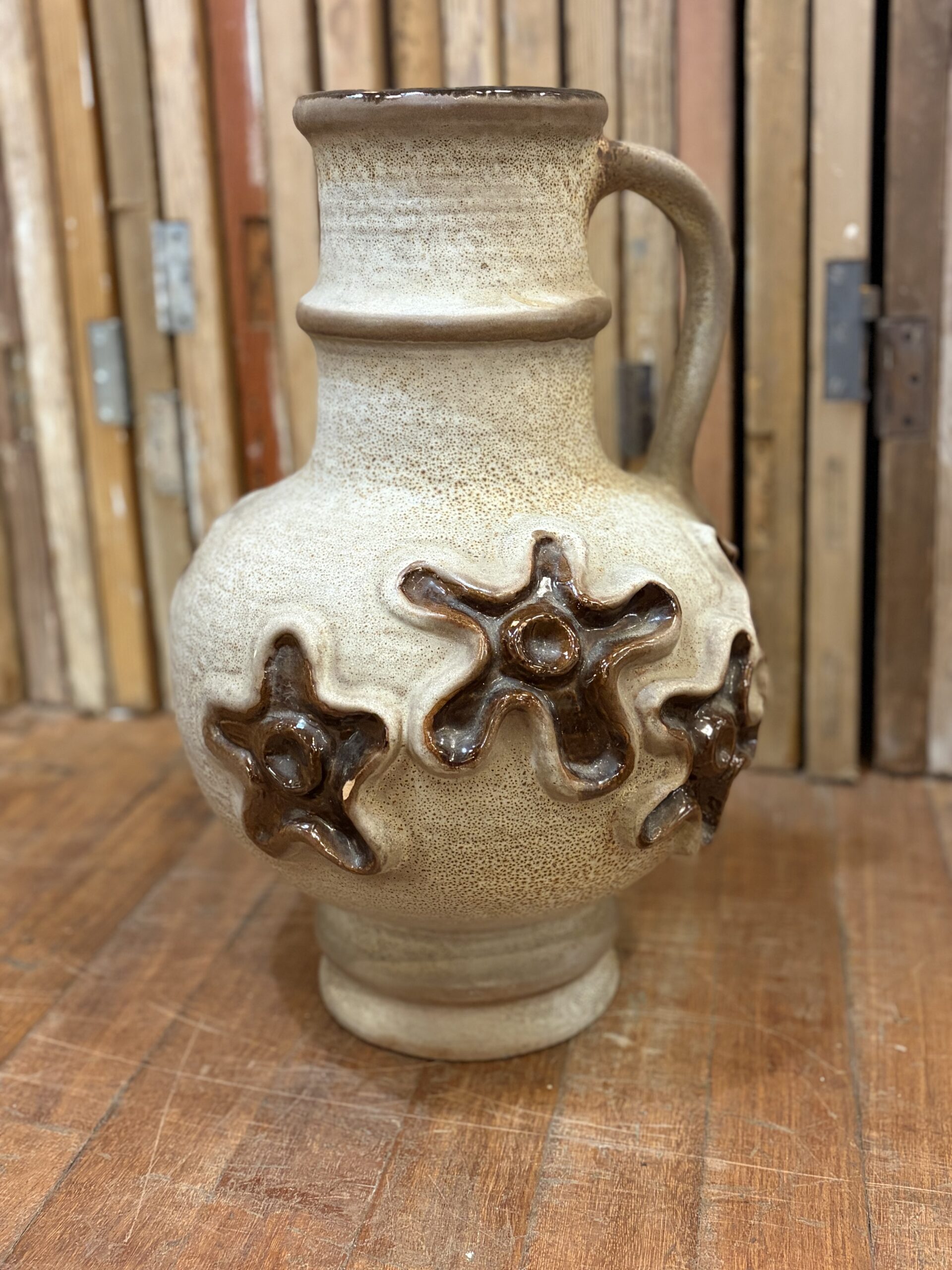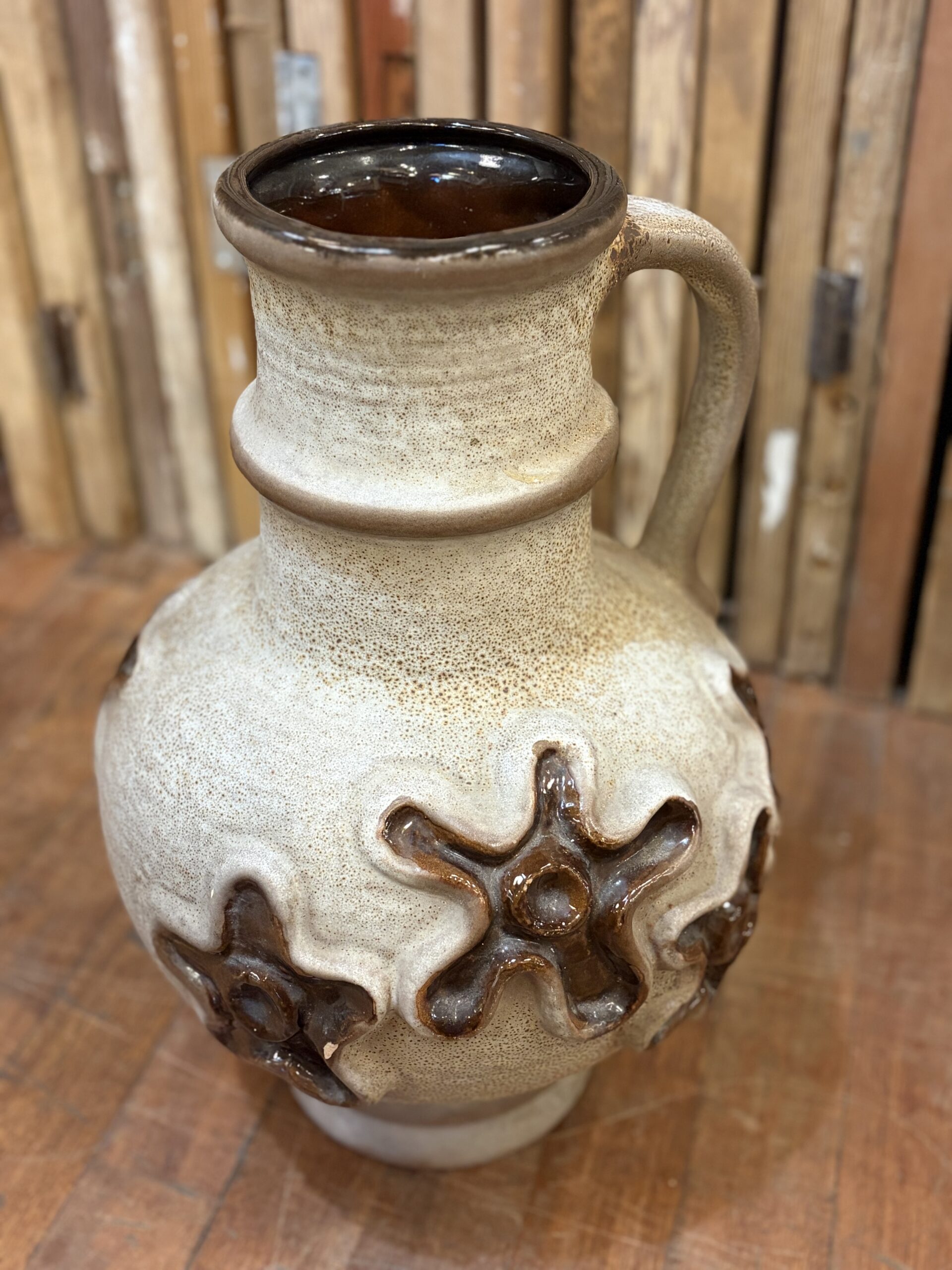 This is a beautiful West German pottery vase, by the manufacturer Carstens Tönnieshof. A classic example of mid-century modern design, likely produced in the 1960s or 1970s, featuring a textured surface and “fat lava” style glaze details with floral like patterns.