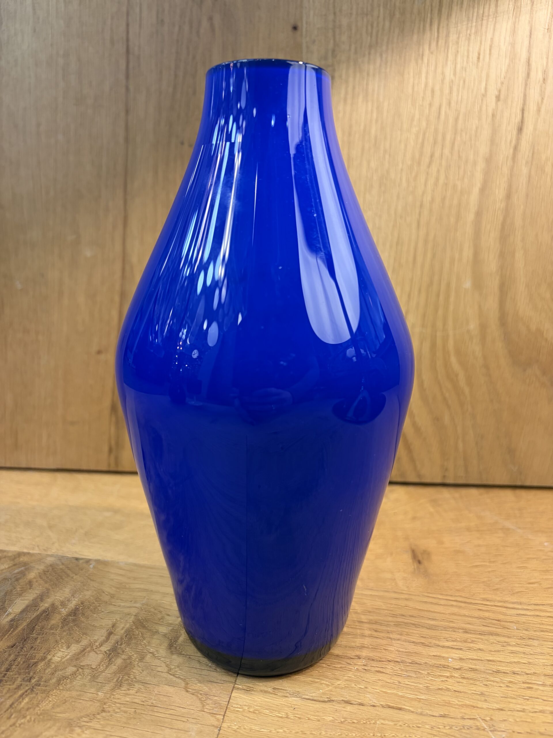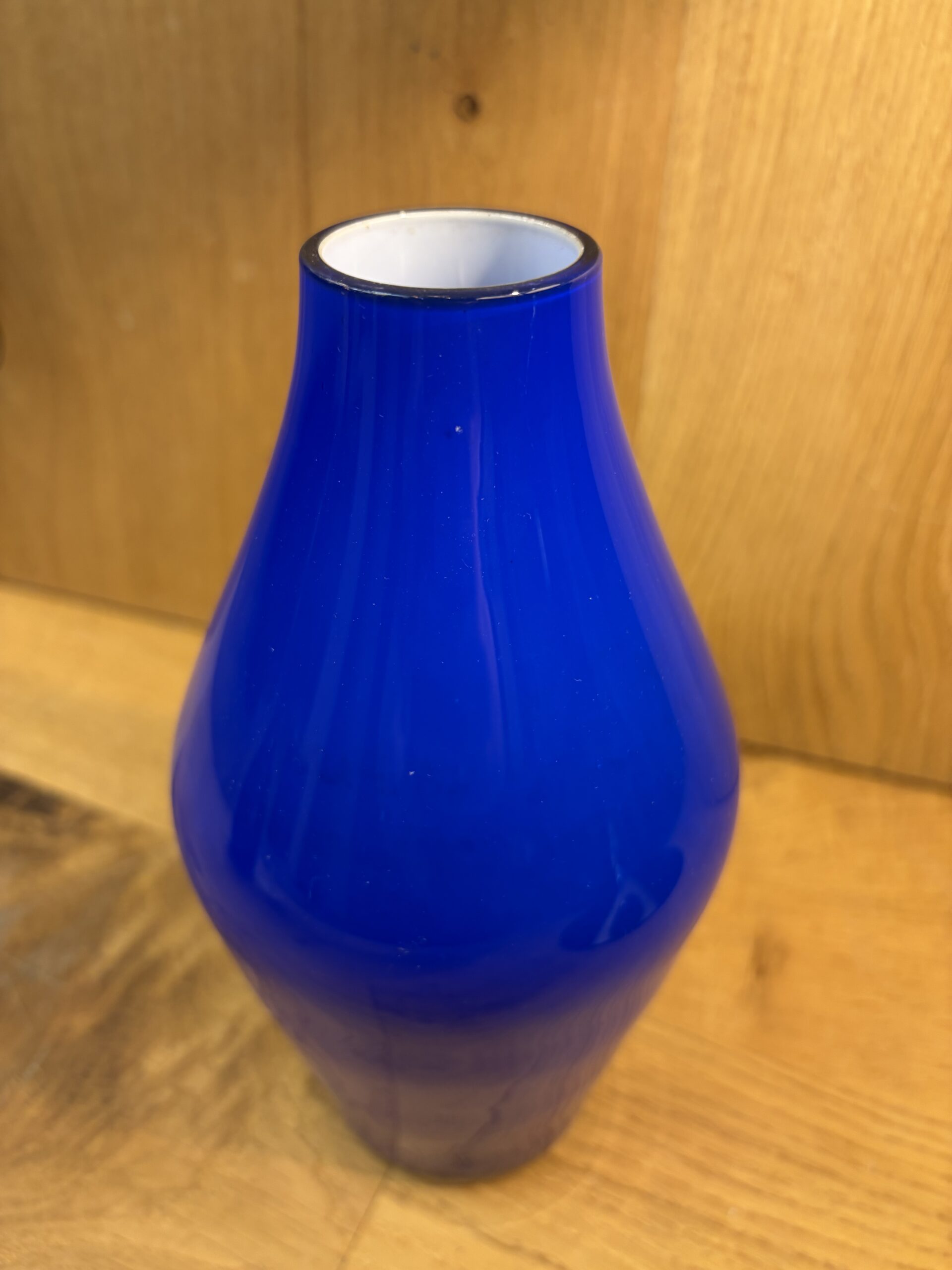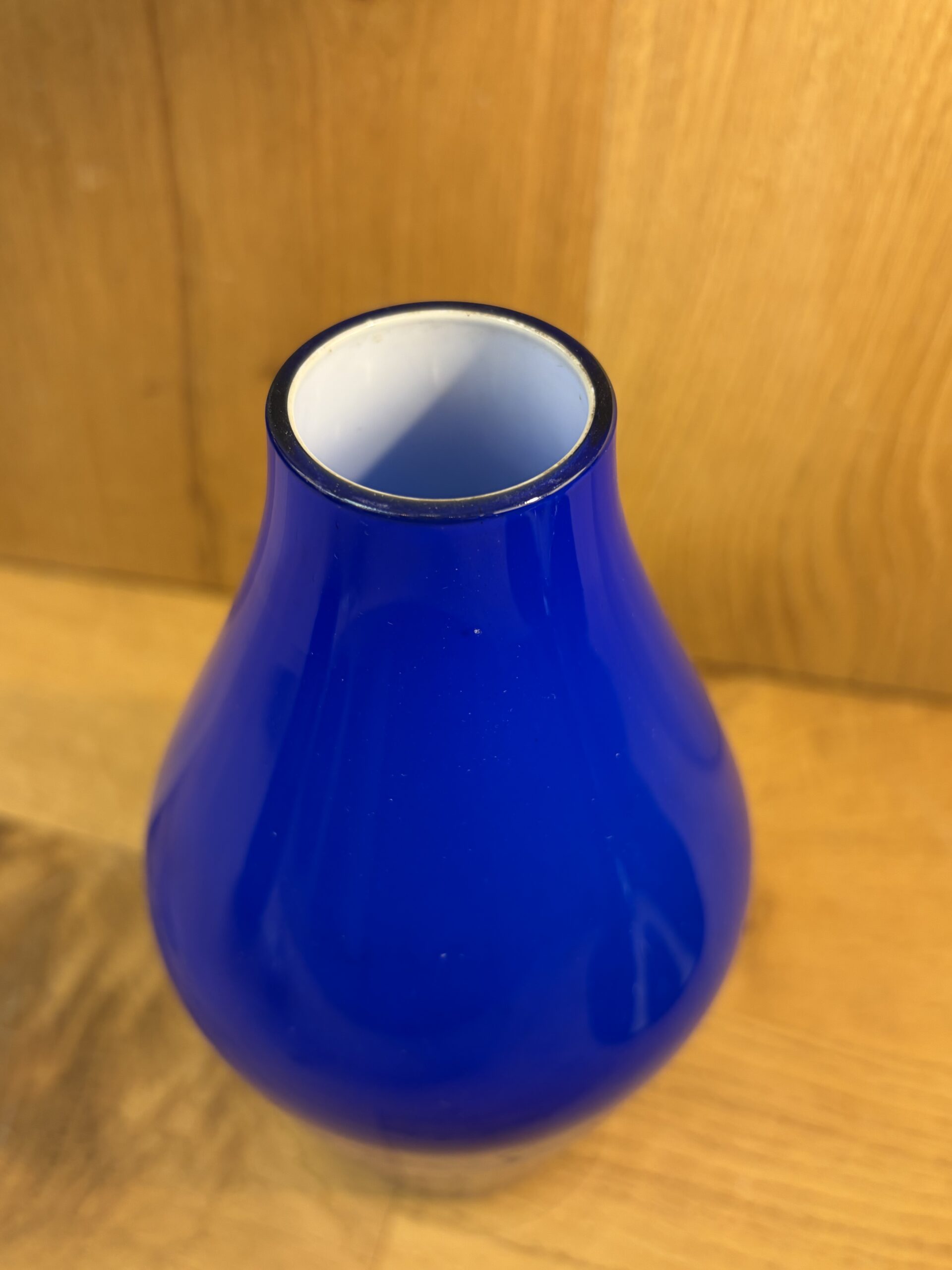 This is a mid-century cobalt blue glass vase with an internal white casing. The design is characteristic of Elme Glasbruk with the internal white and distinct blue.